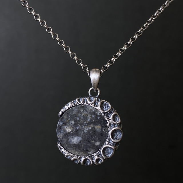 【月の隕石 ベシャール006とは】 2022年の春にアルジェリアで回収された月の隕石です。惑星などが月に衝突した勢いで欠けた月の一部が宇宙を浮遊します。その欠片は軌道を描き、地球に衝突するまで何百万年も宇宙を浮遊します。なぜ月の隕石という事が分かるのかというと、アポロ計画が関係しています。アポロ計画で月の岩石が地球に持ち運ばれ、その組織構造などをデータ化しました。それにより科学的に月の隕石であると証明することができます。唯一肉眼で見られる隕石なので、世界的に人気のある隕石です。 【サイズ】 27×23×3mm 【重さ】 6.1g 【素材】 ステンレス(チェーン)