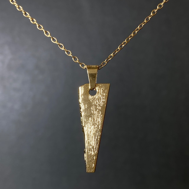 【ギベオン隕石とは】 1836年にナミビア共和国で発見された隕石です。美しいウィドマンシュテッテン構造が特徴的で、比較的サビにくい隕石になります。 【大きさ】 26x13x1mm 【重さ】 3.2g 【素材】 ステンレス(バチカン、チェーン) 24kメッキ