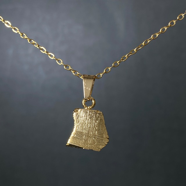 【ギベオン隕石とは】 1836年にナミビア共和国で発見された隕石です。美しいウィドマンシュテッテン構造が特徴的で、比較的サビにくい隕石になります。 【大きさ】 21x16×1mm 【重さ】 3.8g 【素材】 ステンレス(バチカン、チェーン) 24kメッキ