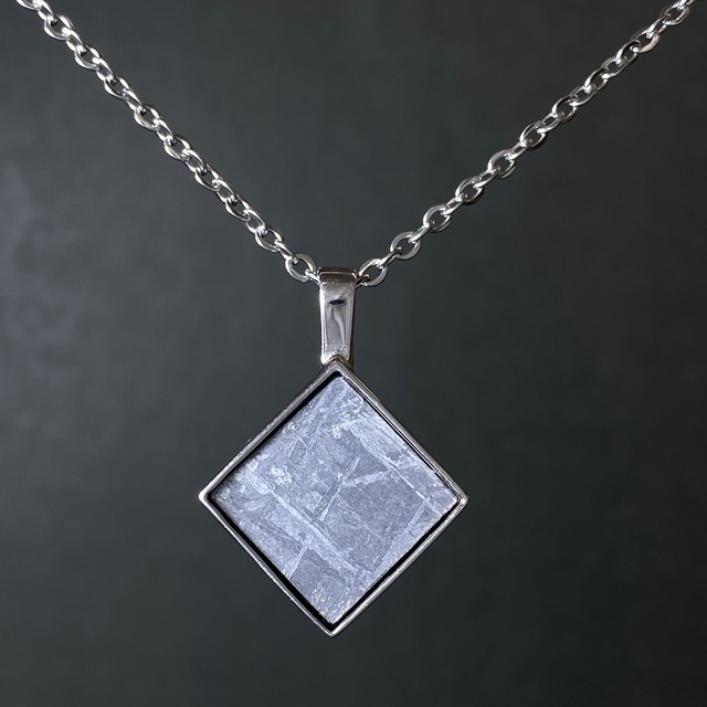 【ギベオン隕石とは】 1836年にナミビア共和国で発見された隕石です。美しいウィドマンシュテッテン構造が特徴的で、比較的サビにくい隕石になります。 【大きさ】 17x11x2mm 【重さ】 2.4g 【素材】 ステンレス(バチカン、チェーン)