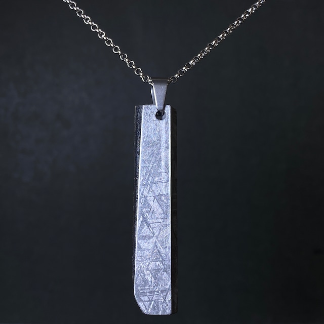 【ギベオン隕石とは】 1836年にナミビア共和国で発見された隕石です。美しいウィドマンシュテッテン構造が特徴的で、比較的サビにくい隕石になります。 【大きさ】 50x7x2mm 【重さ】 3.5g 【素材】 ステンレス(バチカン、チェーン)