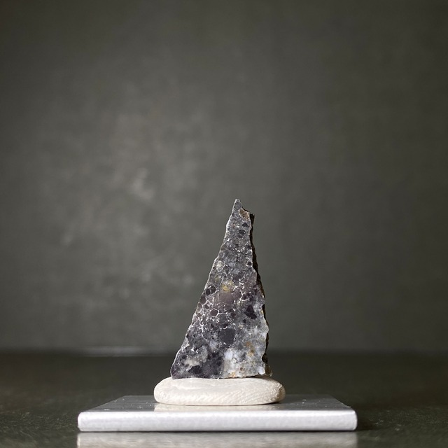 【月の隕石 ベシャール006とは】 2022年の春にアルジェリアで回収された月の隕石です。惑星などが月に衝突した勢いで欠けた月の一部が宇宙を浮遊します。その欠片は軌道を描き、地球に衝突するまで何百万年も宇宙を浮遊します。なぜ月の隕石という事が分かるのかというと、アポロ計画が関係しています。アポロ計画で月の岩石が地球に持ち運ばれ、その組織構造などをデータ化しました。それにより科学的に月の隕石であると証明することができます。唯一肉眼で見られる隕石なので、世界的に人気のある隕石です。 【サイズ】 16×8×1mm 【重さ】 0.4g