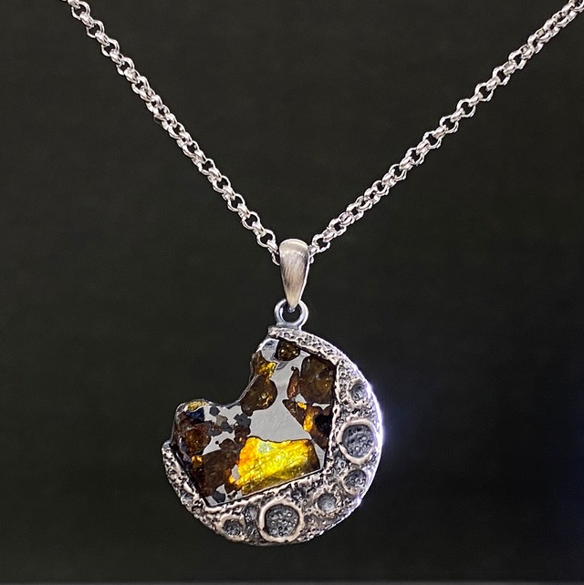 【イミラックについて】 1822年にチリで発見された隕石です。パラサイト隕石自体の回収量は全体の約1%で希少なのですが、イミラックはその中でも希少かつ人気の隕石です。そのカンラン石は大きく、透明度が高いです。イエローグリーンに輝くその様は、宇宙の宝石と呼ばれるほどです。サビにくさも人気の1つです。美しいそのフォルムを美しいまま、いつまでも楽しめる隕石です。 【イミラックのグレードについて】 当店のイミラックには「スタンダード」<「ハイグレード(HG)」<「トップグレード(TG)」の3段階のグレードがあります。 【大きさ】 27×22×3mm 【重さ】 9.1g 【素材】 ステンレス(チェーン) シルバー925
