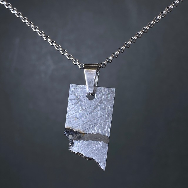 【サント・アントニオ・ド・デスコベルト隕石とは】 2011年にブラジルで発見された隕石です。50kgの原石1個しか見つかっていません。数が少ないヘキサへドライトに分類され、特有のノイマン線が綺麗にでます。また雪結晶のようなラブダイトが美しいのも特徴です。 【サイズ】 30x16×2mm 【重さ】 11.5g 【素材】 ステンレス(バチカン、チェーン)