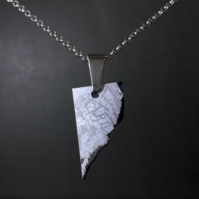 【サント・アントニオ・ド・デスコベルト隕石とは】 2011年にブラジルで発見された隕石です。50kgの原石1個しか見つかっていません。数が少ないヘキサへドライトに分類され、特有のノイマン線が綺麗にでます。また雪結晶のようなラブダイトが美しいのも特徴です。 【サイズ】 28x16×3mm 【重さ】 6.1g 【素材】 ステンレス(バチカン、チェーン)