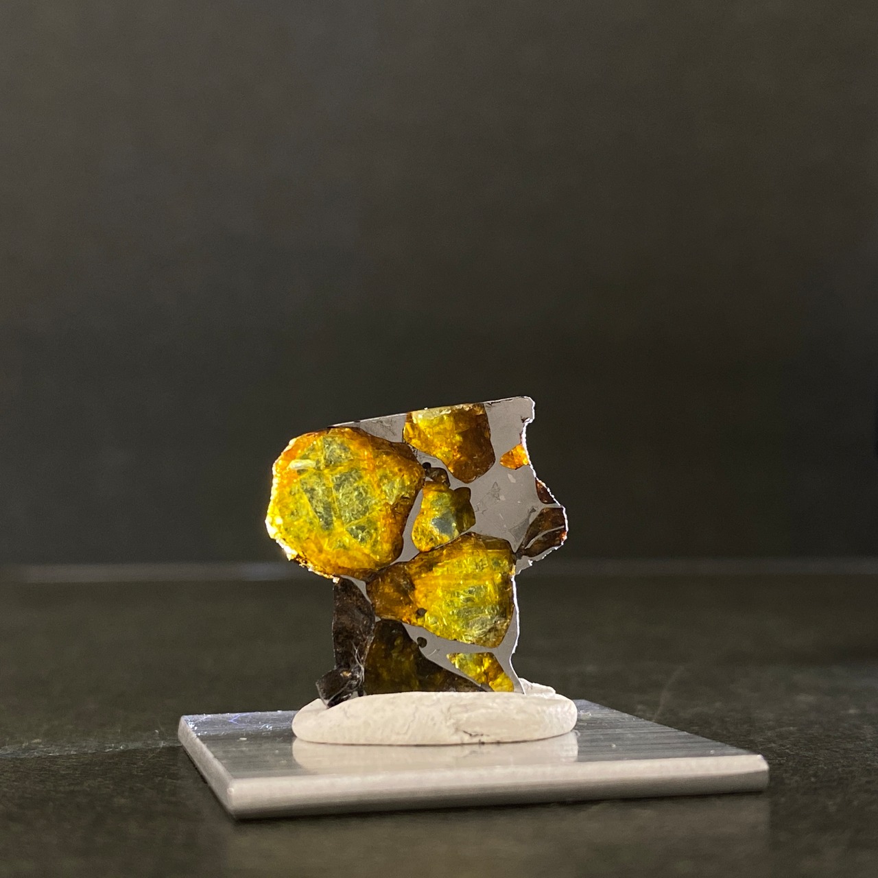 1822年にチリで発見された隕石です。パラサイト隕石自体の回収量は全体の約1%で希少なのですが、イミラックはその中でも希少かつ人気の隕石です。そのカンラン石は大きく、透明度が高いです。イエローグリーンに輝くその様は、宇宙の宝石と呼ばれるほどです。サビにくさも人気の1つです。美しいそのフォルムを美しいまま、いつまでの楽しめる隕石です。
