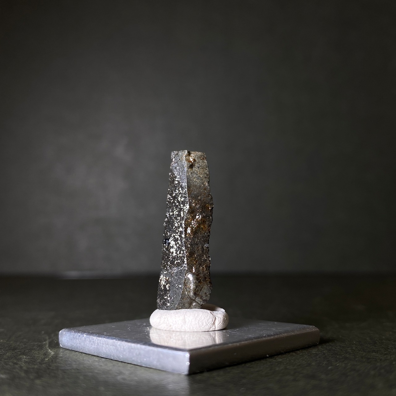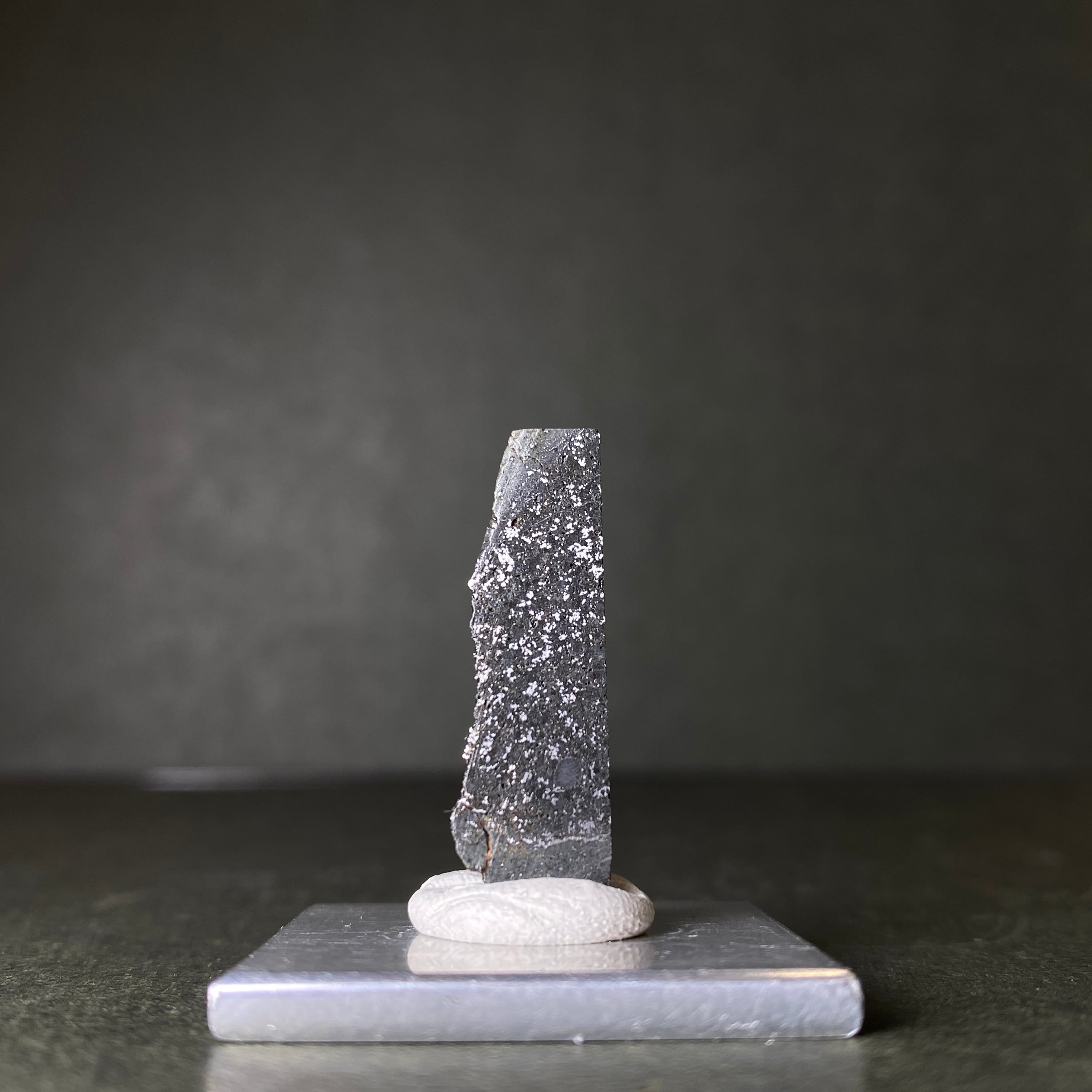 2016年にニジェール共和国で発見されたH5に分類される石質隕石です。別名Tchifaddineとも言われています。この隕石はインパクトメルト角礫岩といって、地球への衝突によって融解し再結晶化した隕石です。つまり地球に落ちた時に液体になって固まった隕石なのです。そのためか、多くの原石は球形に近い形状をしております。切断面が特徴的で、黒とシルバー色の斑点が非常に美しく表れます。この斑点は鉄隕石と同じ鉄とニッケルの成分で、石質隕石の中でも含有量が多いです。隕石ファンの心を引く隕石の1つでしょう。