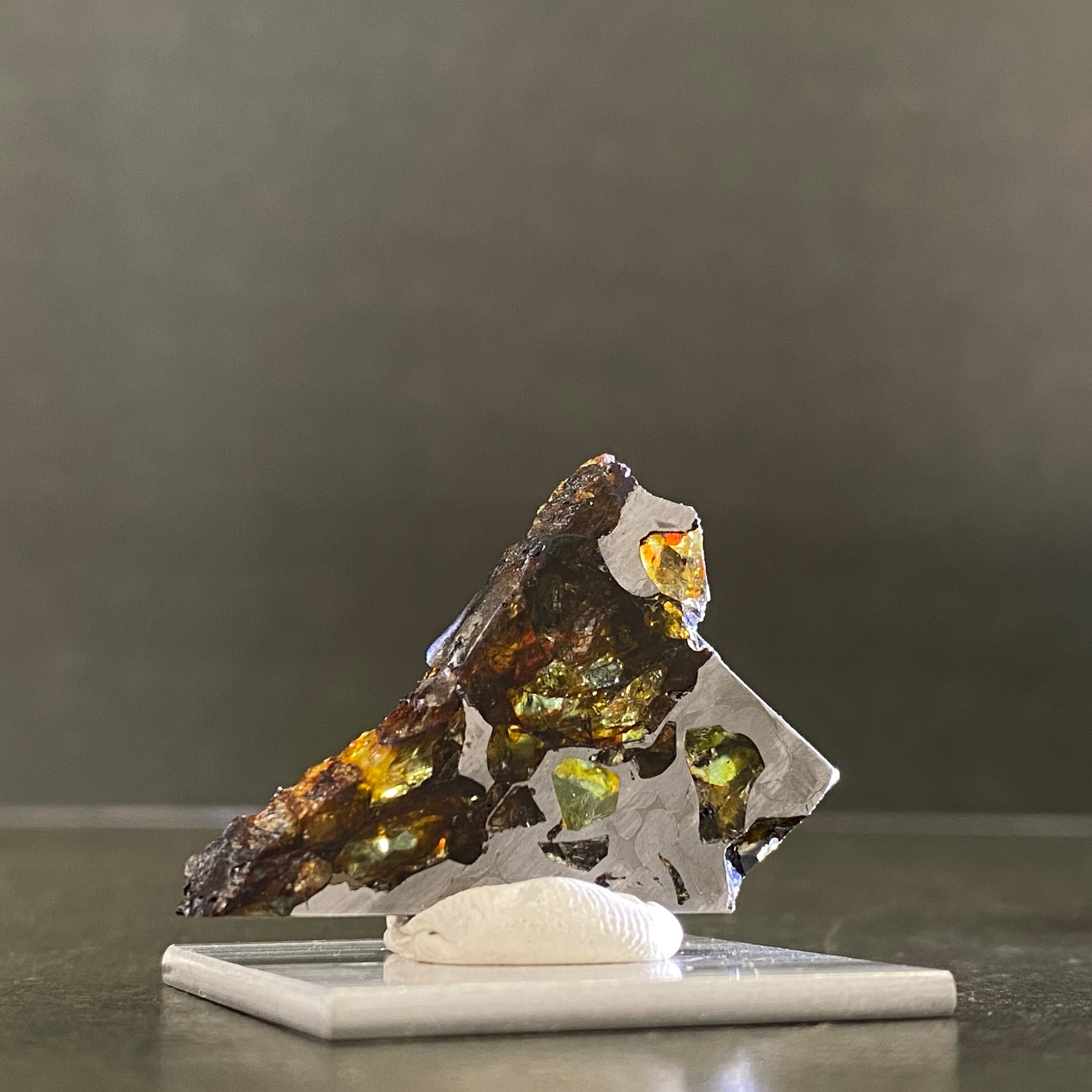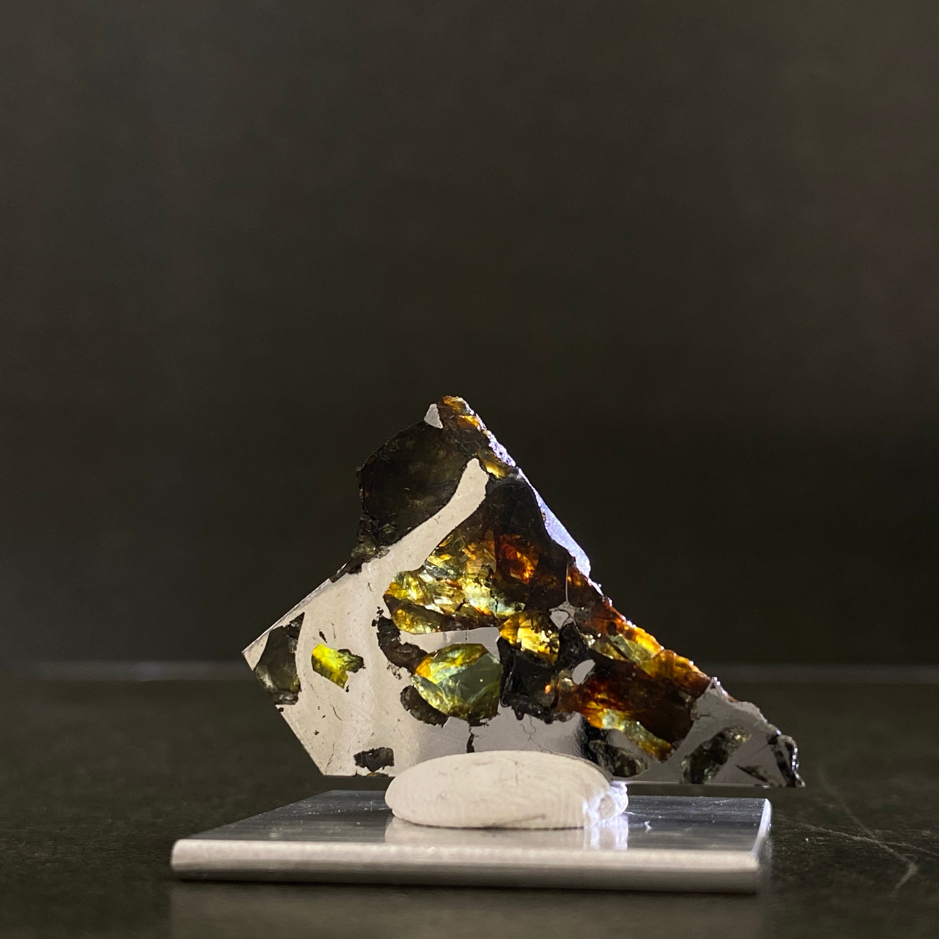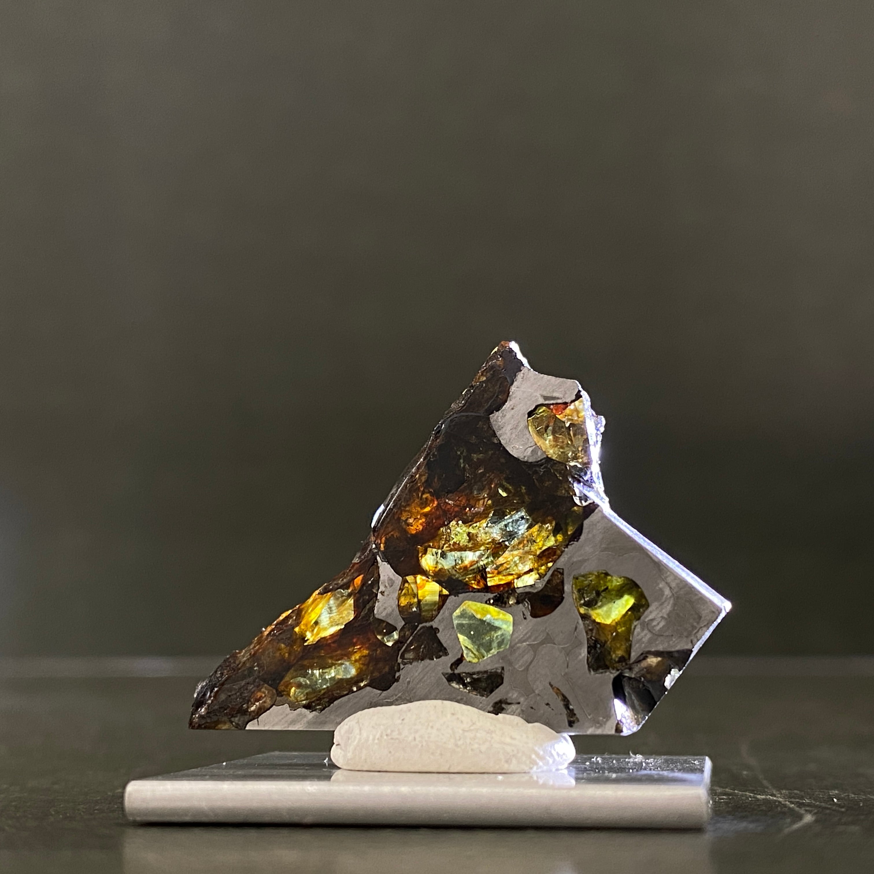 1967年にロシアで発見された隕石です。回収される隕石の中で約1%ほどしかない石鉄隕石(パラサイト隕石)の一種です。この隕石は部位によって値段が大きく変わります。パラサイト隕石の特徴であるカンラン石が満遍なく表現され、かつ、鉄部分とのバランスが美しい個体はとても高価で取引されています。エスケル隕石のように綺麗で透明度の高いオリーブ色のカンラン石があり、人気を高めています。また、鉄部分だけの個体もあります。カット方法によって鉄隕石、パラサイト隕石に区別される珍しい隕石で、とてもサビにくい隕石です。