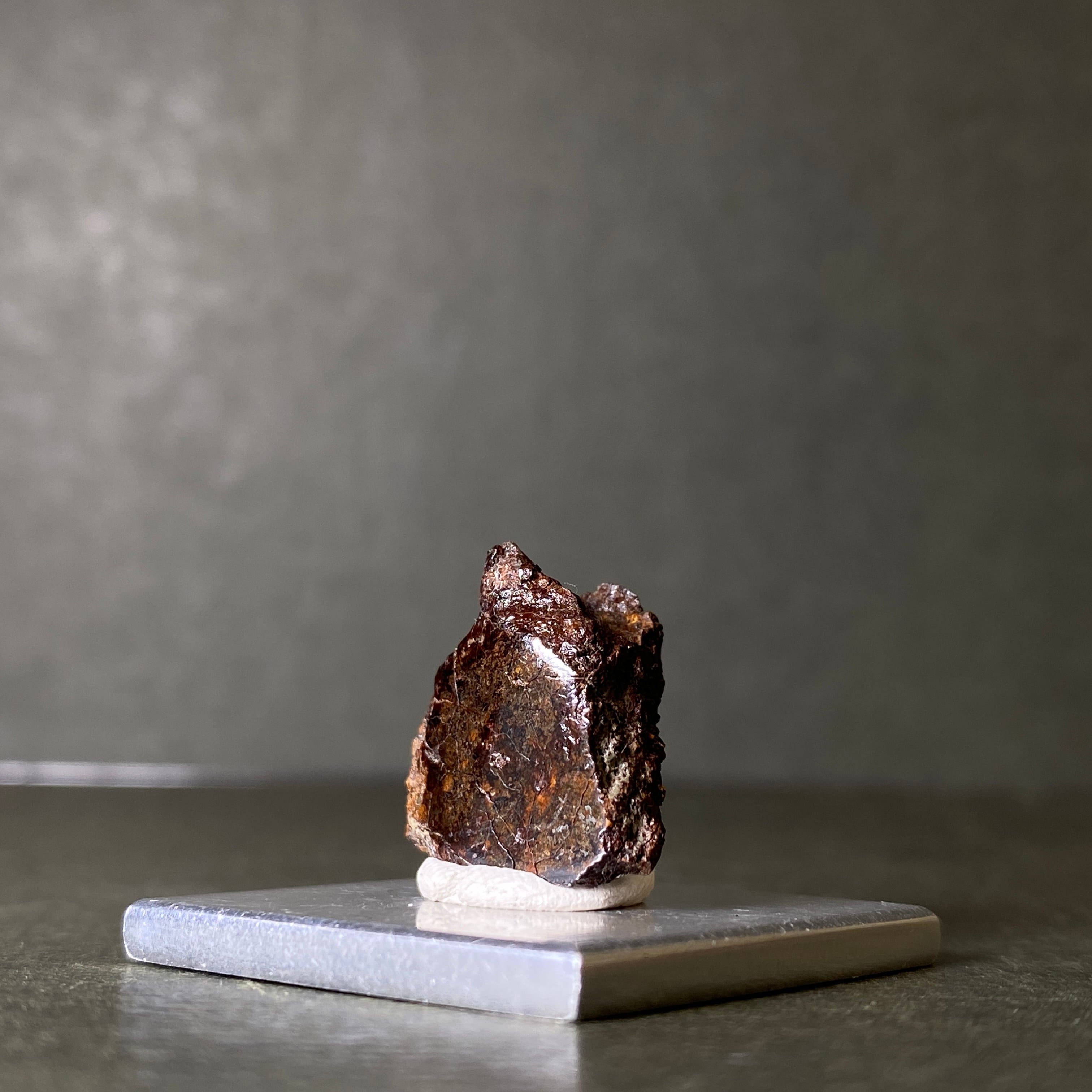 1891年にチリのアタカマ砂漠で発見された石鉄隕石(メソシデライト)です。石鉄隕石には、イミラックのようなパラサイト隕石と、ヴァカムエルタ隕石のようなメソシデライト隕石の2種類あります。メソシデライトは隕鉄とカンラン石が半分ずつ混ざった隕石です。最近では新しい個体が見つかっておらず、希少な隕石の1つとして扱われています。非常にサビにくい隕石になります。