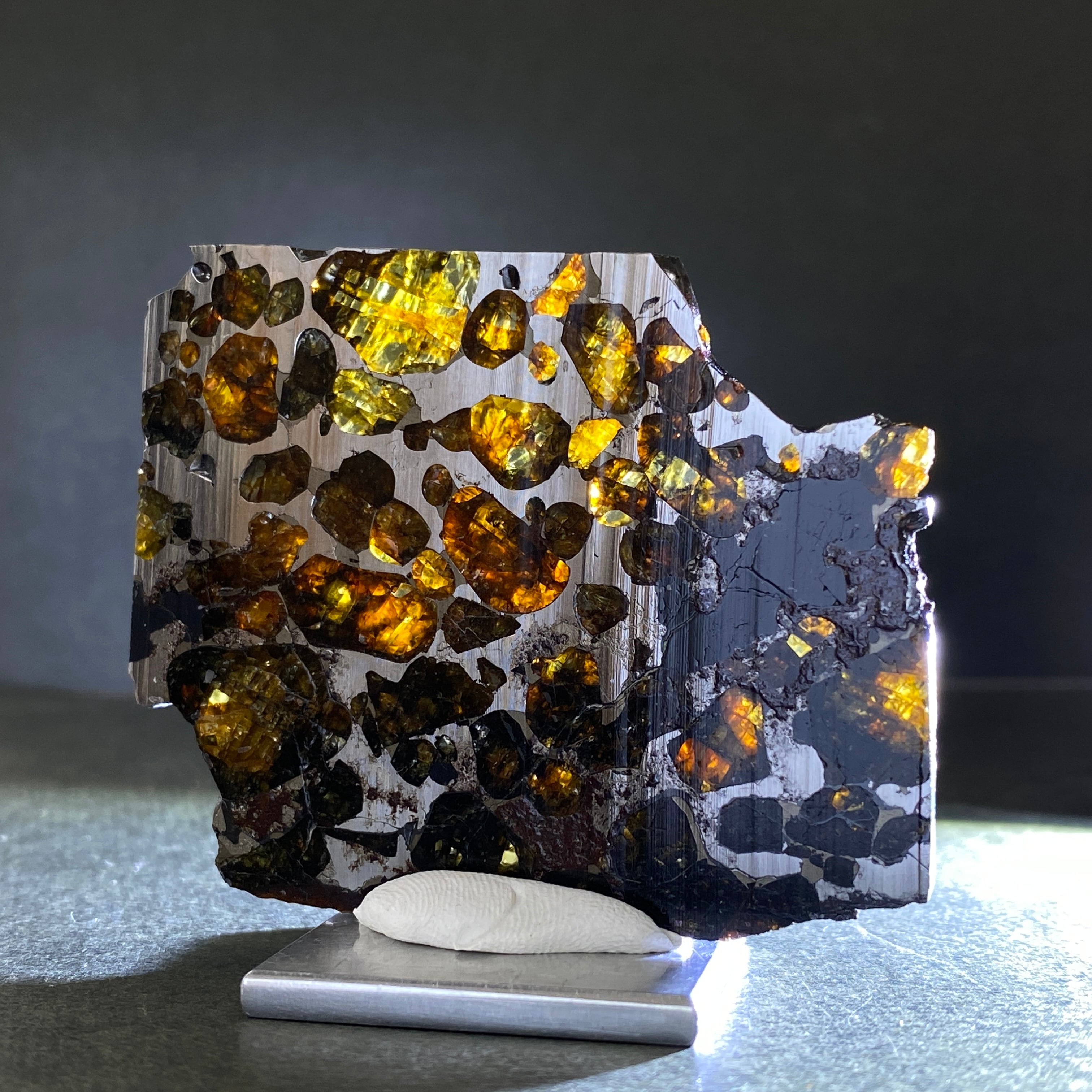 2016年にケニアで発見され、2017年に隕石と認定された隕石です。小さなカンラン石が散りばらめられているパラサイト隕石で、その色はレッド、イエロー、オレンジなど、多彩な色彩を見ることができます。カンラン石部分がある個体が一般的ですが、稀に鉄部分だけの個体も発見されています。それは非常に珍しく、市場に出回ることが極めて少ない個体です。