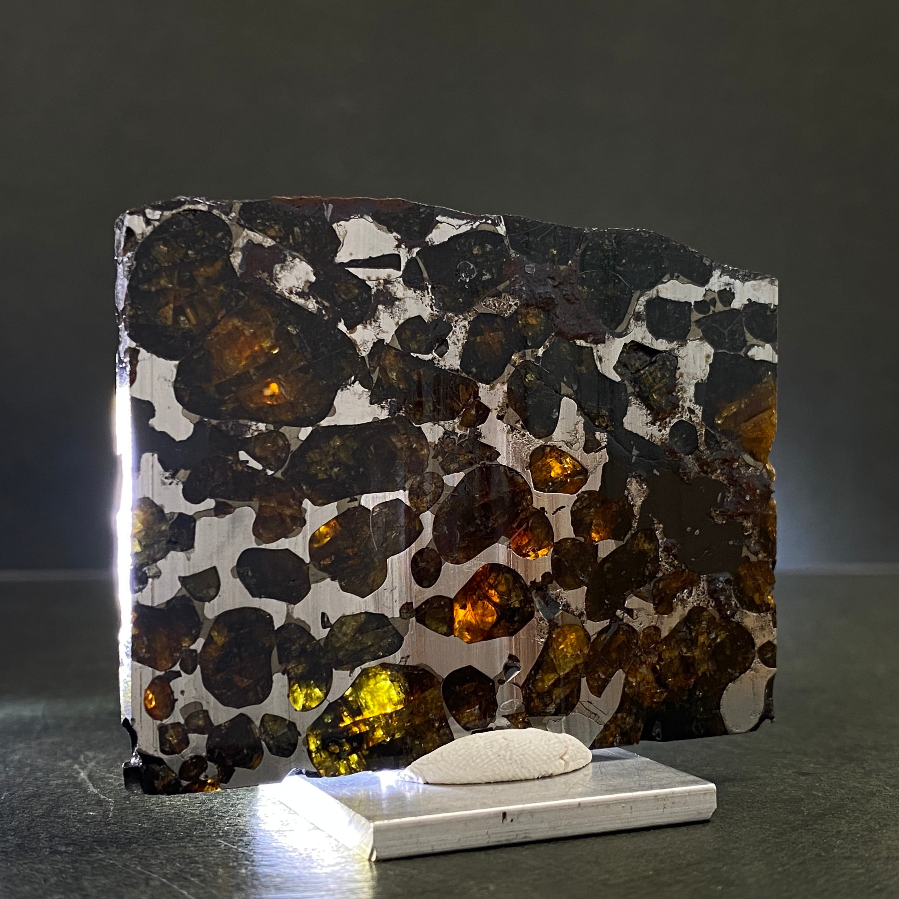 2016年にケニアで発見され、2017年に隕石と認定された隕石です。小さなカンラン石が散りばらめられているパラサイト隕石で、その色はレッド、イエロー、オレンジなど、多彩な色彩を見ることができます。カンラン石部分がある個体が一般的ですが、稀に鉄部分だけの個体も発見されています。それは非常に珍しく、市場に出回ることが極めて少ない個体です。