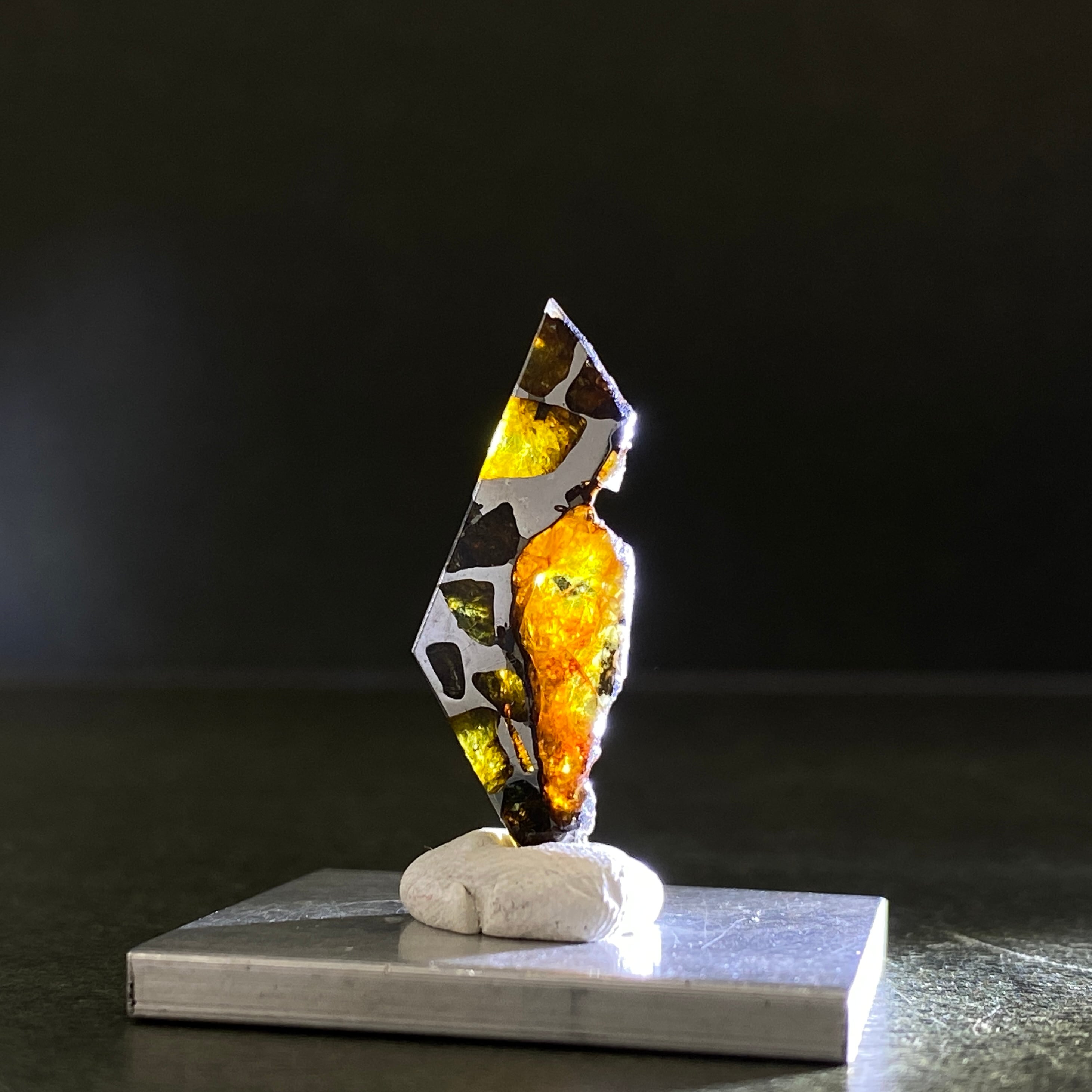 1822年にチリで発見された隕石です。パラサイト隕石自体の回収量は全体の約1%で希少なのですが、イミラックはその中でも希少かつ人気の隕石です。そのカンラン石は大きく、透明度が高いです。イエローグリーンに輝くその様は、宇宙の宝石と呼ばれるほどです。サビにくさも人気の1つです。美しいそのフォルムを美しいまま、いつまでの楽しめる隕石です。