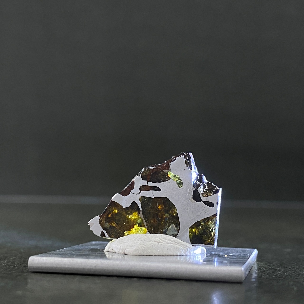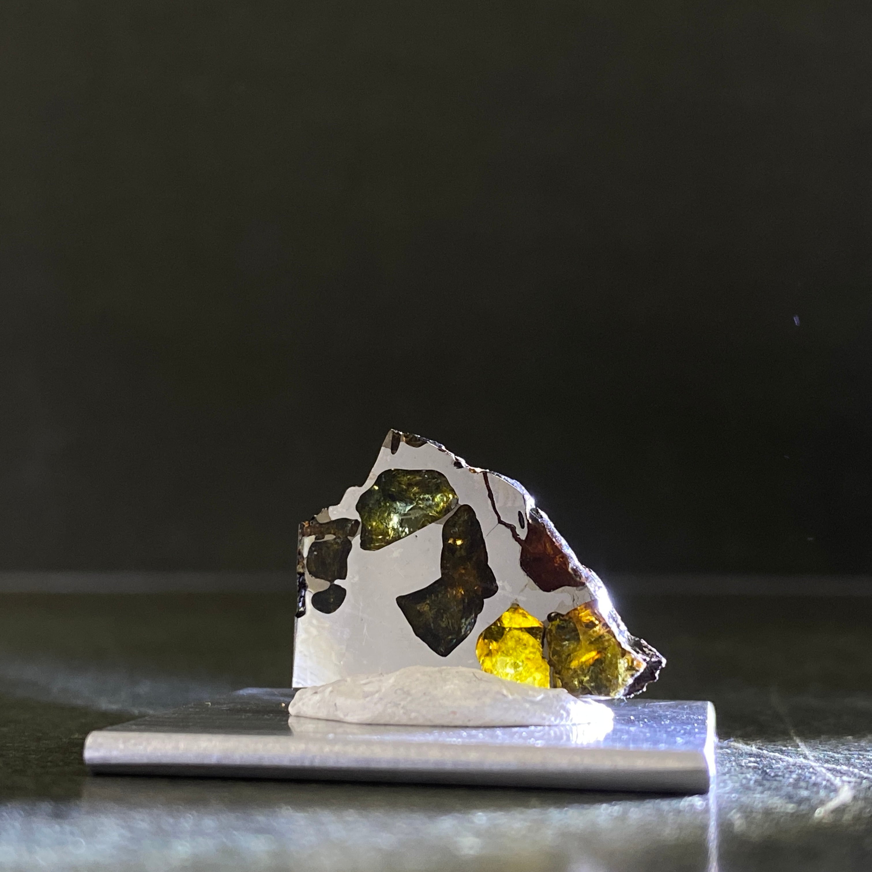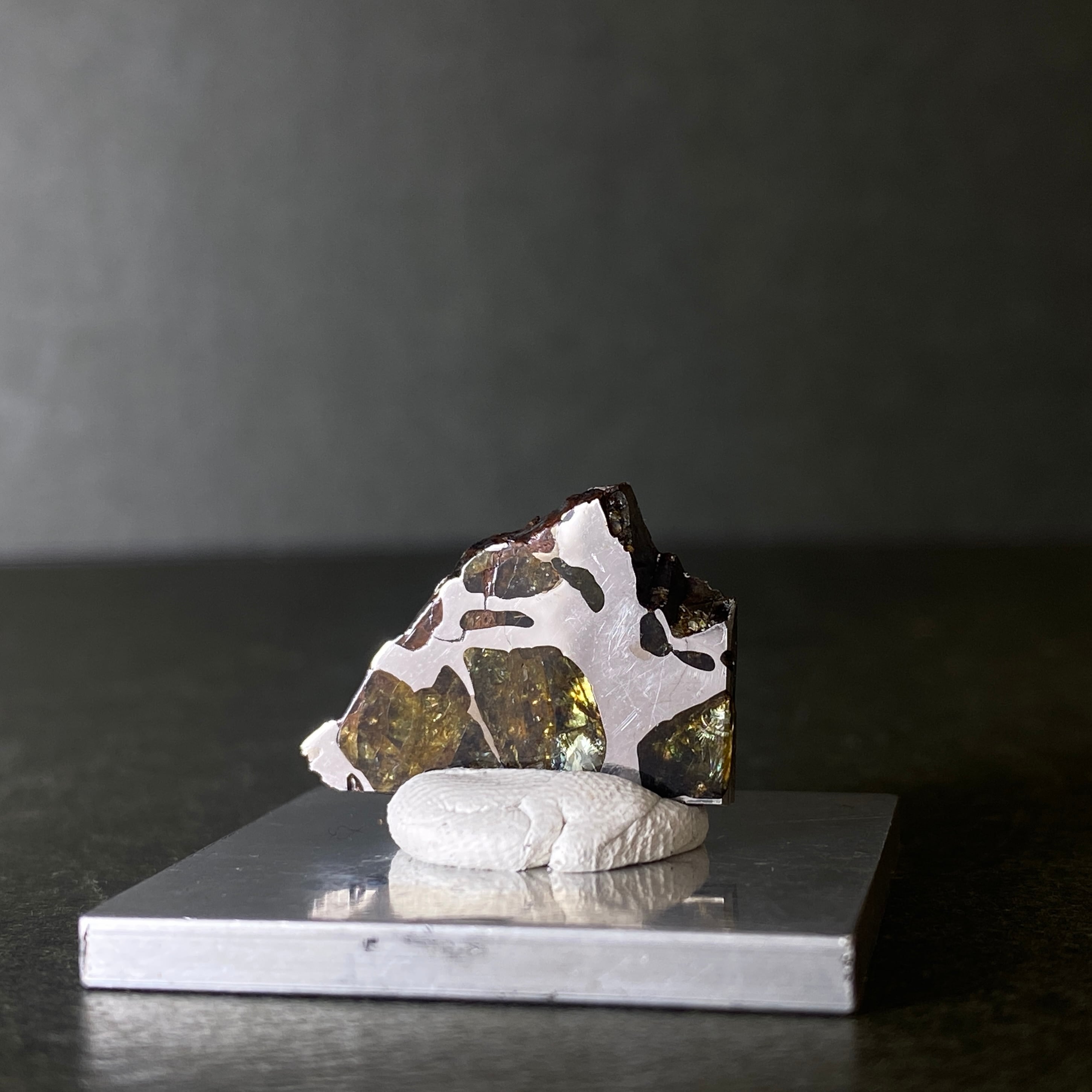 1822年にチリで発見された隕石です。パラサイト隕石自体の回収量は全体の約1%で希少なのですが、イミラックはその中でも希少かつ人気の隕石です。そのカンラン石は大きく、透明度が高いです。イエローグリーンに輝くその様は、宇宙の宝石と呼ばれるほどです。サビにくさも人気の1つです。美しいそのフォルムを美しいまま、いつまでの楽しめる隕石です。