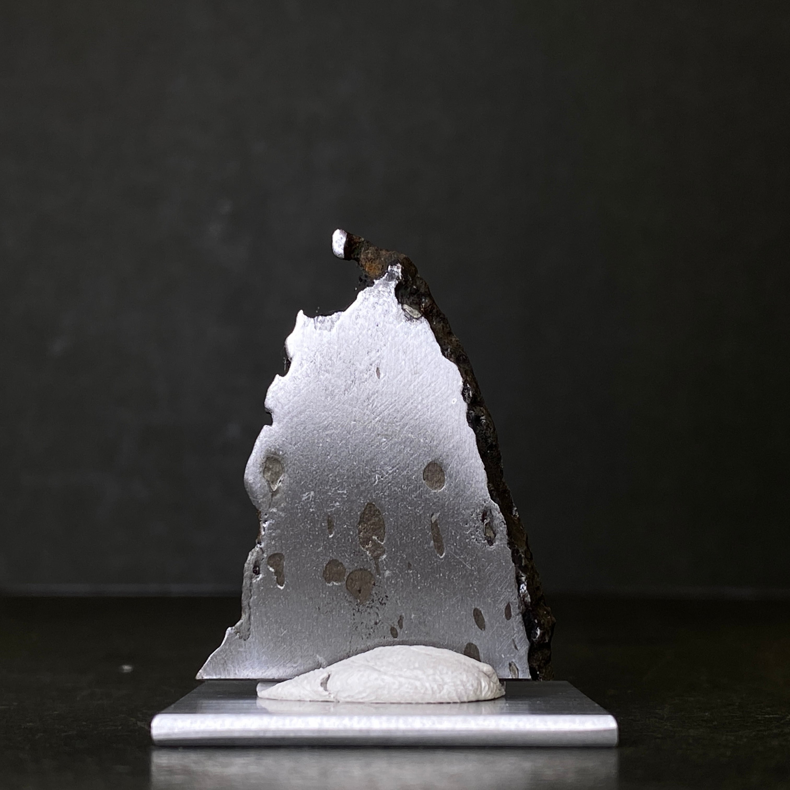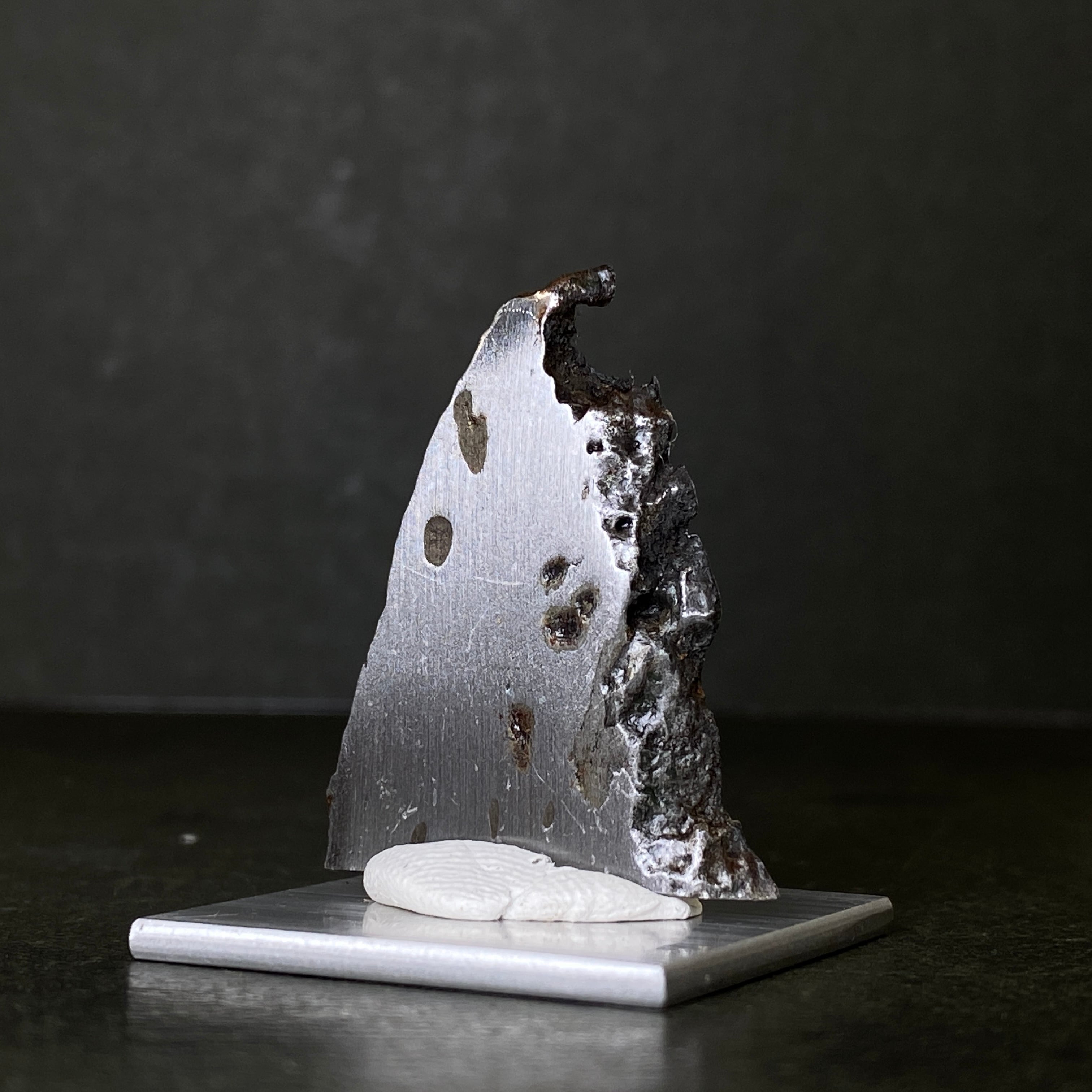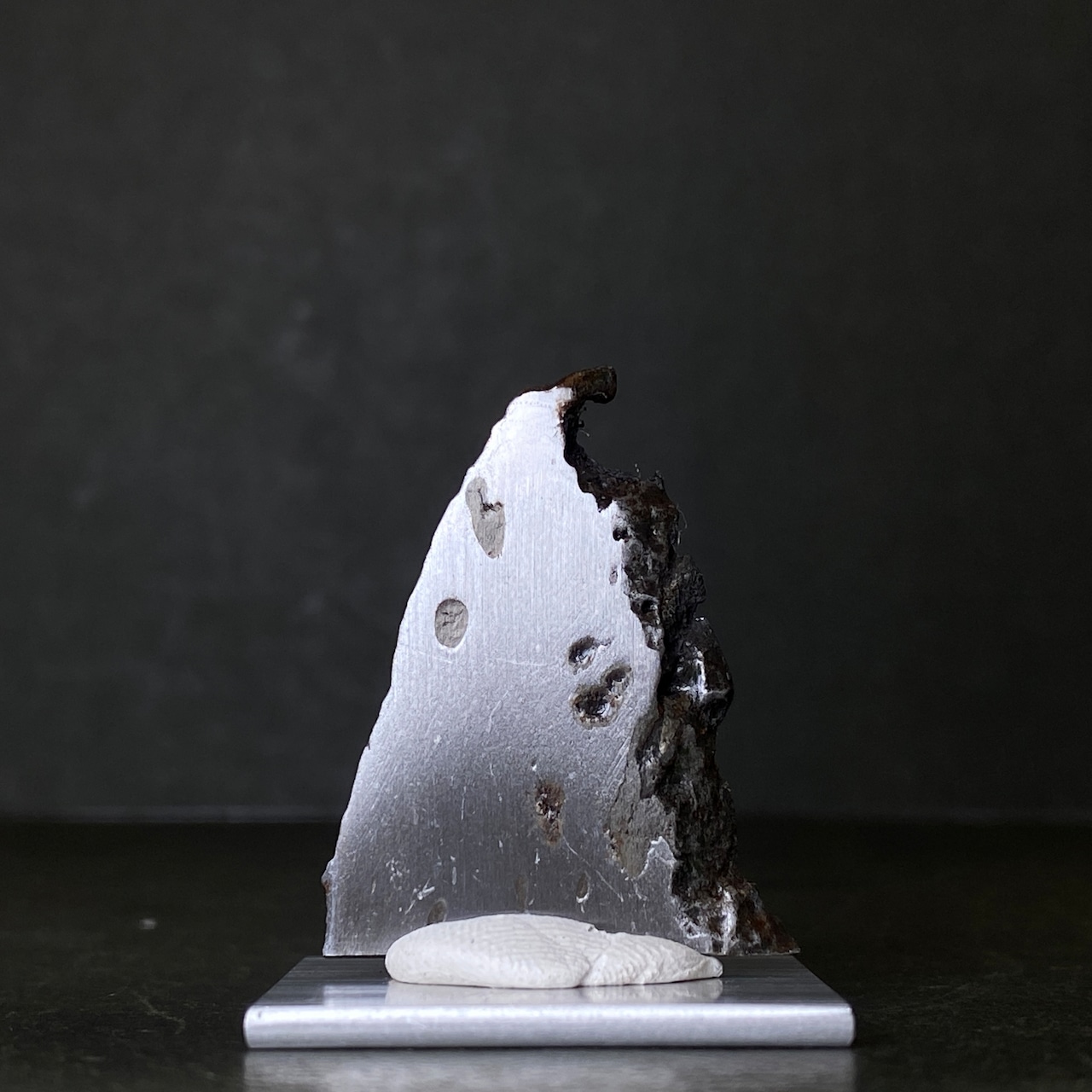 2000年にロシアで発見された隕石です。鉄隕石の一種で、ウィドマンシュテッテン構造が出ないアタキサイトに分類されます。それは隕石の主成分である鉄とニッケルの成分比の違いによるもので、ドロニノ隕石はニッケルが25%以上あるのが特徴です。そのためスライス品の鏡面仕上げが一般的で、その断面にトロイライトという黒いポツポツがあるのも特徴の1つです。