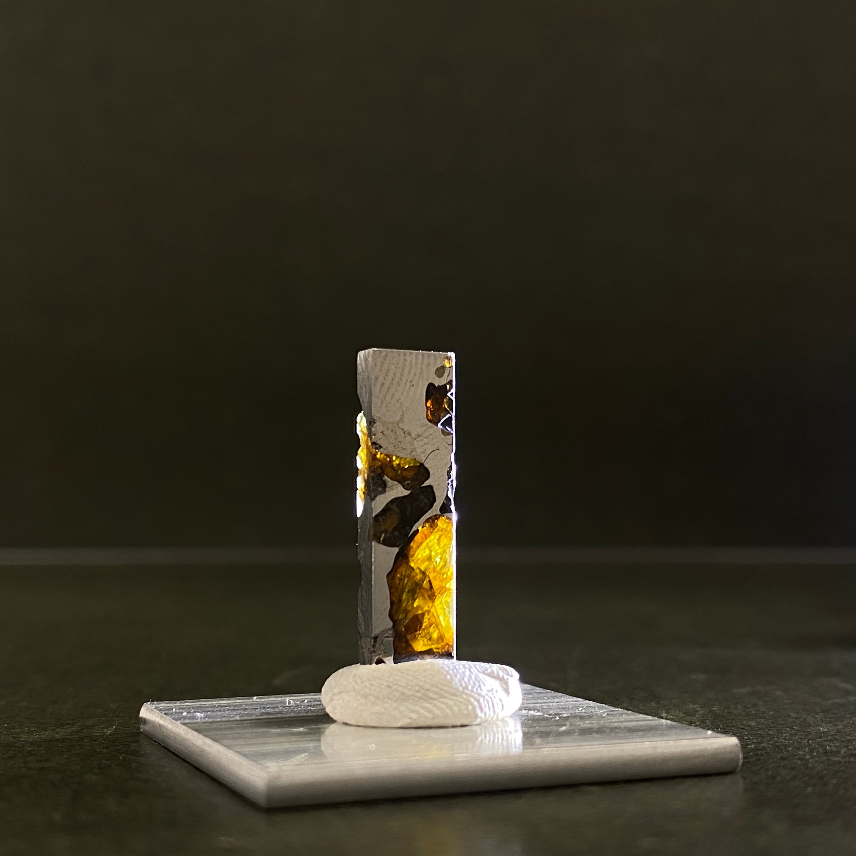 1822年にチリで発見された隕石です。パラサイト隕石自体の回収量は全体の約1%で希少なのですが、イミラックはその中でも希少かつ人気の隕石です。そのカンラン石は大きく、透明度が高いです。イエローグリーンに輝くその様は、宇宙の宝石と呼ばれるほどです。サビにくさも人気の1つです。美しいそのフォルムを美しいまま、いつまでの楽しめる隕石です。
