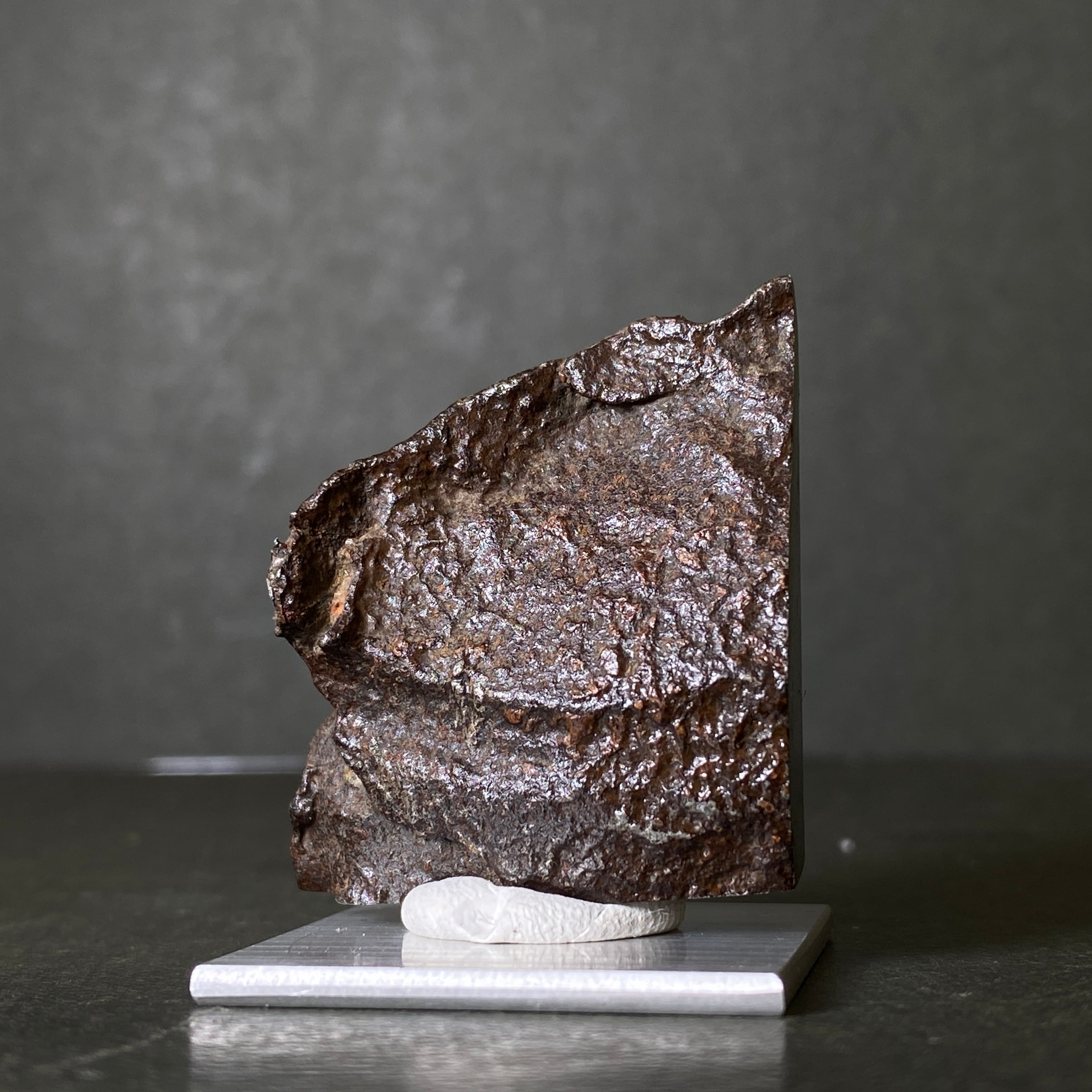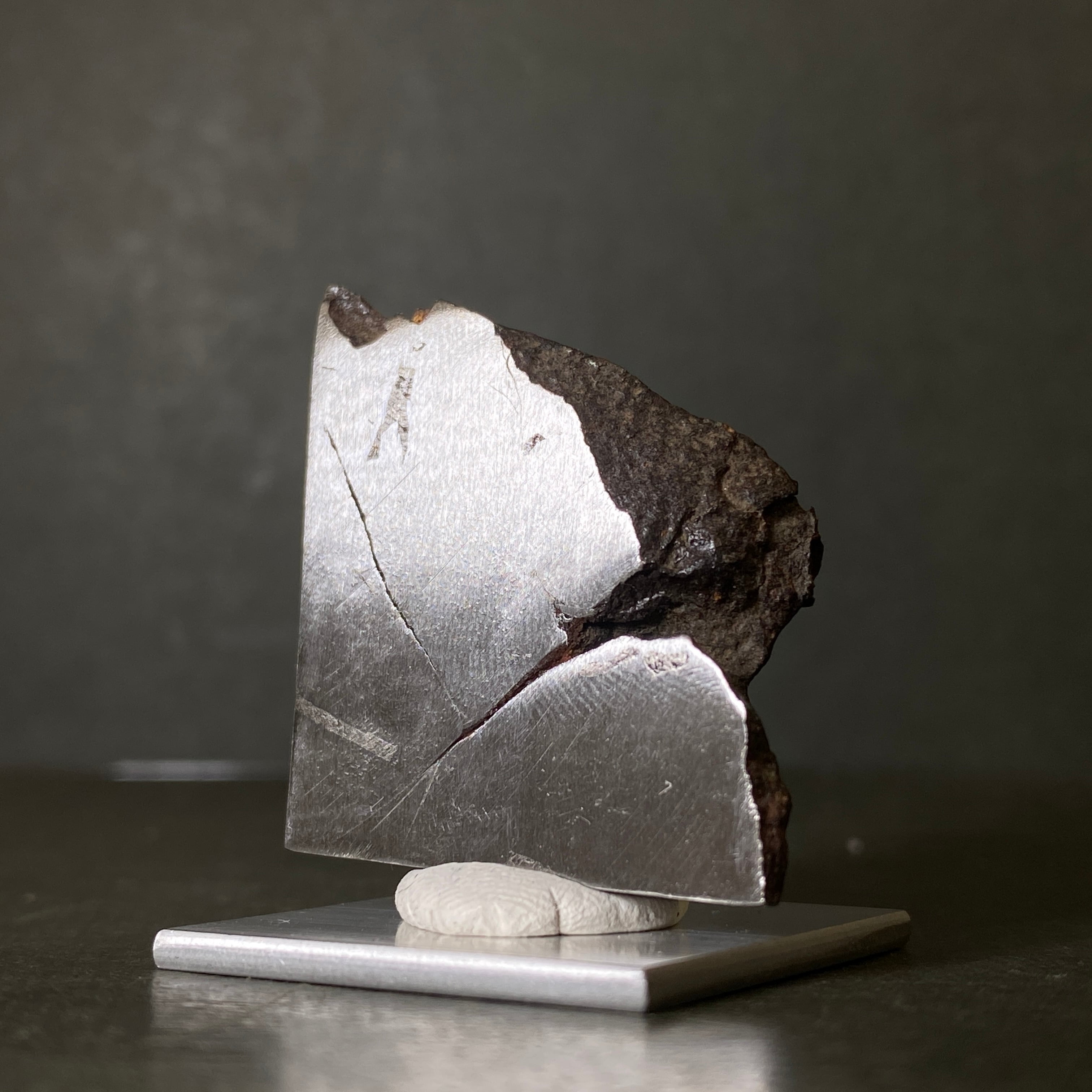 2009年にエジプトで発見された隕石です。当時、ミラノ自然史博物館の元学芸員であるイタリアの科学者ヴィンチェンツォデミケーレがその隕石クレーターを発見しました。彼らによって合計800キロの隕石が回収され、その多くはカイロのエジプト地質学博物館に展示されているようです。50世紀もののあいだ砂漠の奥深くにいたためか、他の隕石と比べてサビにくいです。ゲベルカミル隕石はアタキサイトに分類され、酸処理してもウィドマンシュテッテン構造が出ない隕石です。一般的にスライス品は鏡面加工されており、原石よりも高価になっています。原石はどの隕石にも無い表皮をしています。それは爬虫類の表皮や亀の甲羅のような感じで、のっぺりとしているのが特徴的です。