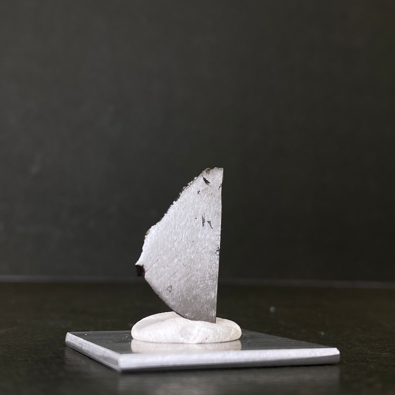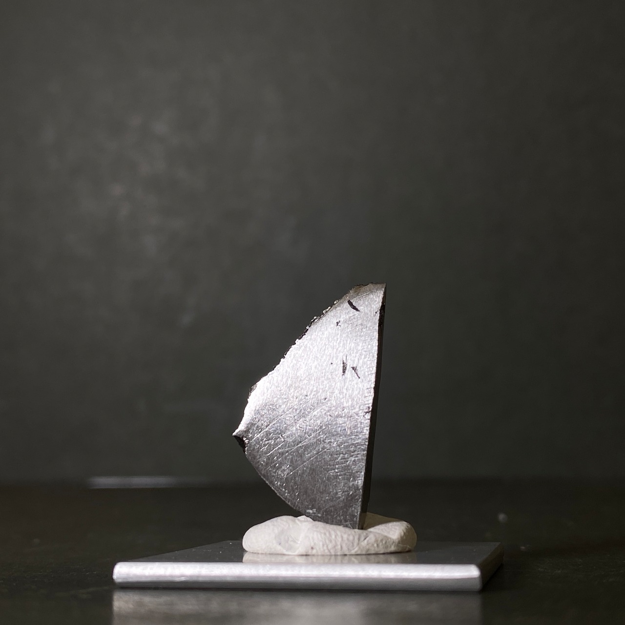 2009年にエジプトで発見された隕石です。当時、ミラノ自然史博物館の元学芸員であるイタリアの科学者ヴィンチェンツォデミケーレがその隕石クレーターを発見しました。彼らによって合計800キロの隕石が回収され、その多くはカイロのエジプト地質学博物館に展示されているようです。50世紀もののあいだ砂漠の奥深くにいたためか、他の隕石と比べてサビにくいです。ゲベルカミル隕石はアタキサイトに分類され、酸処理してもウィドマンシュテッテン構造が出ない隕石です。一般的にスライス品は鏡面加工されており、原石よりも高価になっています。原石はどの隕石にも無い表皮をしています。それは爬虫類の表皮や亀の甲羅のような感じで、のっぺりとしているのが特徴的です。