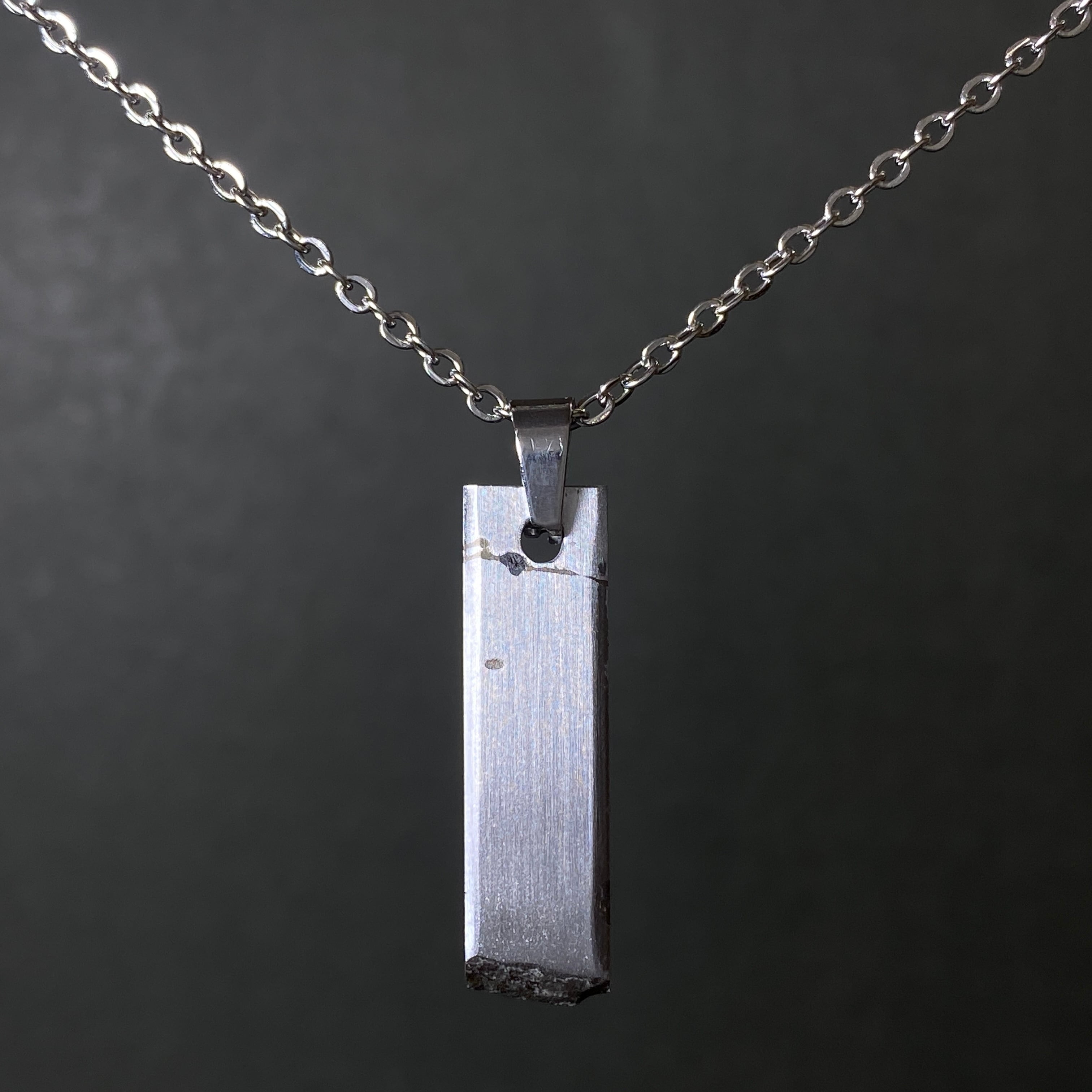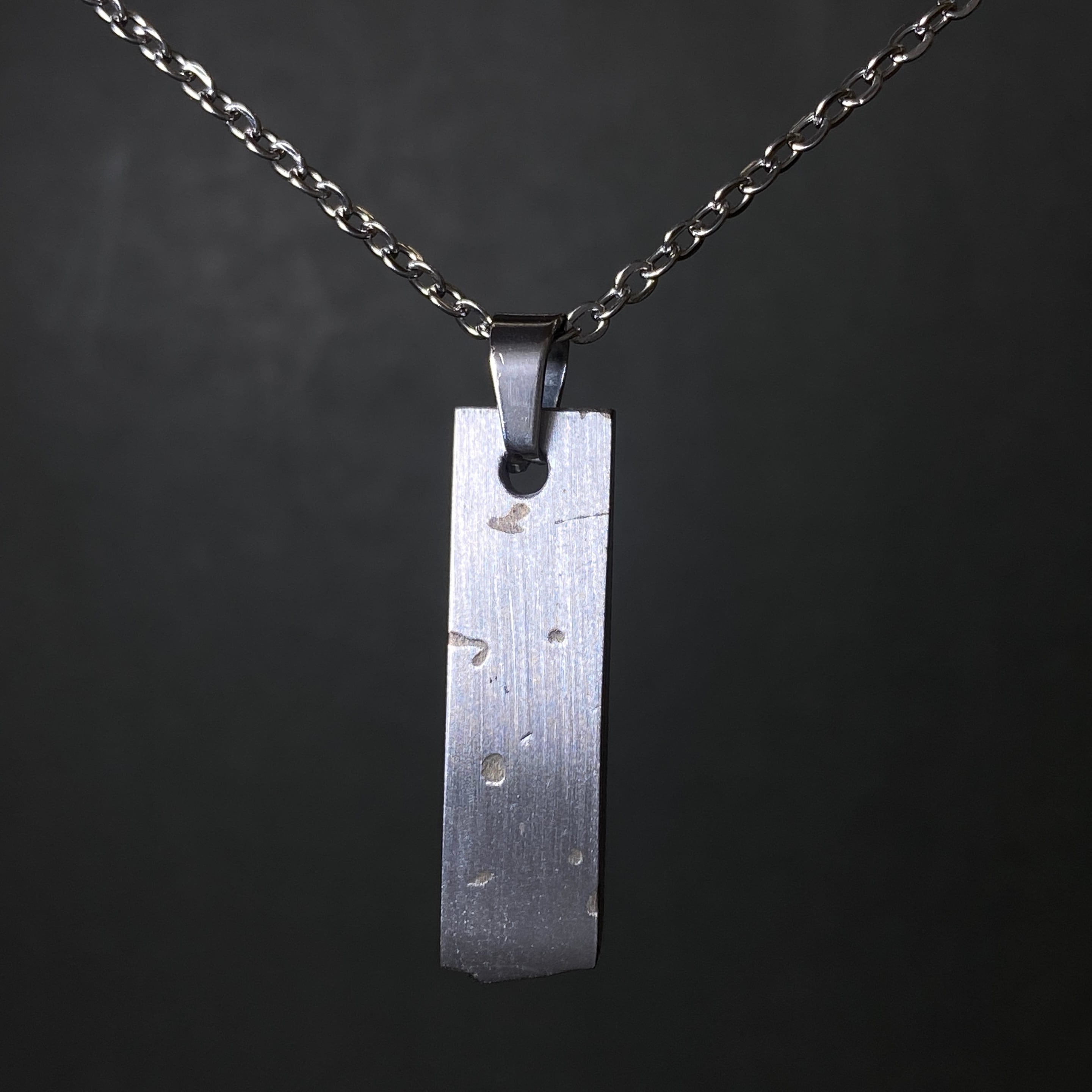2000年にロシアで発見された隕石です。鉄隕石の一種で、ウィドマンシュテッテン構造が出ないアタキサイトに分類されます。それは隕石の主成分である鉄とニッケルの成分比の違いによるもので、ドロニノ隕石はニッケルが25%以上あるのが特徴です。そのためスライス品の鏡面仕上げが一般的で、その断面にトロイライトという黒いポツポツがあるのも特徴の1つです。