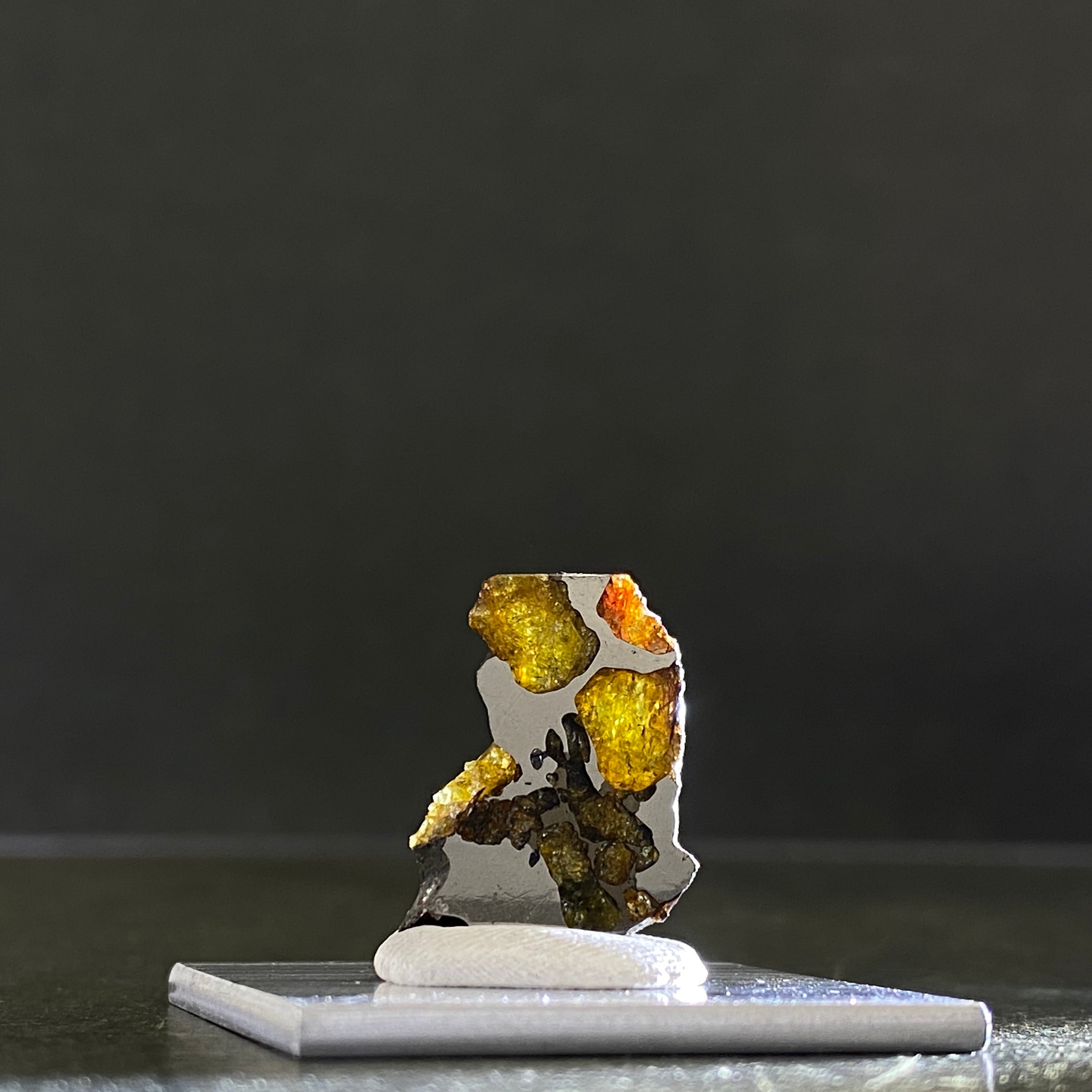 1822年にチリで発見された隕石です。パラサイト隕石自体の回収量は全体の約1%で希少なのですが、イミラックはその中でも希少かつ人気の隕石です。そのカンラン石は大きく、透明度が高いです。イエローグリーンに輝くその様は、宇宙の宝石と呼ばれるほどです。サビにくさも人気の1つです。美しいそのフォルムを美しいまま、いつまでの楽しめる隕石です。