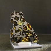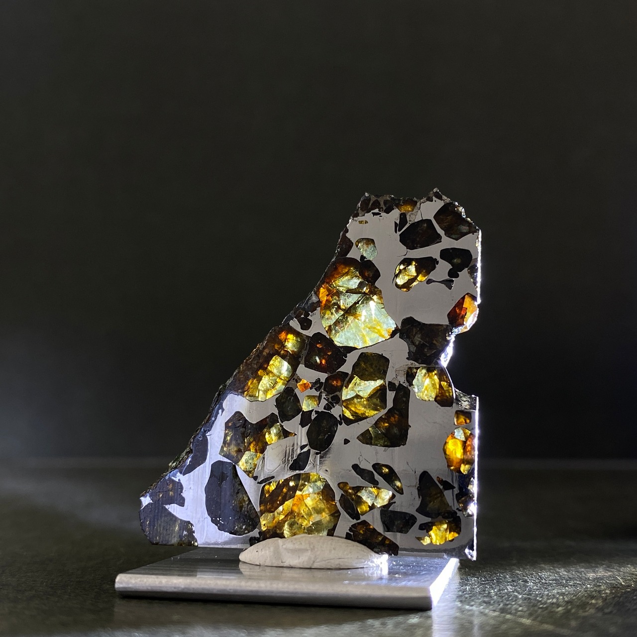 1967年にロシアで発見された隕石です。回収される隕石の中で約1%ほどしかない石鉄隕石(パラサイト隕石)の一種です。この隕石は部位によって値段が大きく変わります。パラサイト隕石の特徴であるカンラン石が満遍なく表現され、かつ、鉄部分とのバランスが美しい個体はとても高価で取引されています。エスケル隕石のように綺麗で透明度の高いオリーブ色のカンラン石があり、人気を高めています。また、鉄部分だけの個体もあります。カット方法によって鉄隕石、パラサイト隕石に区別される珍しい隕石で、とてもサビにくい隕石です。