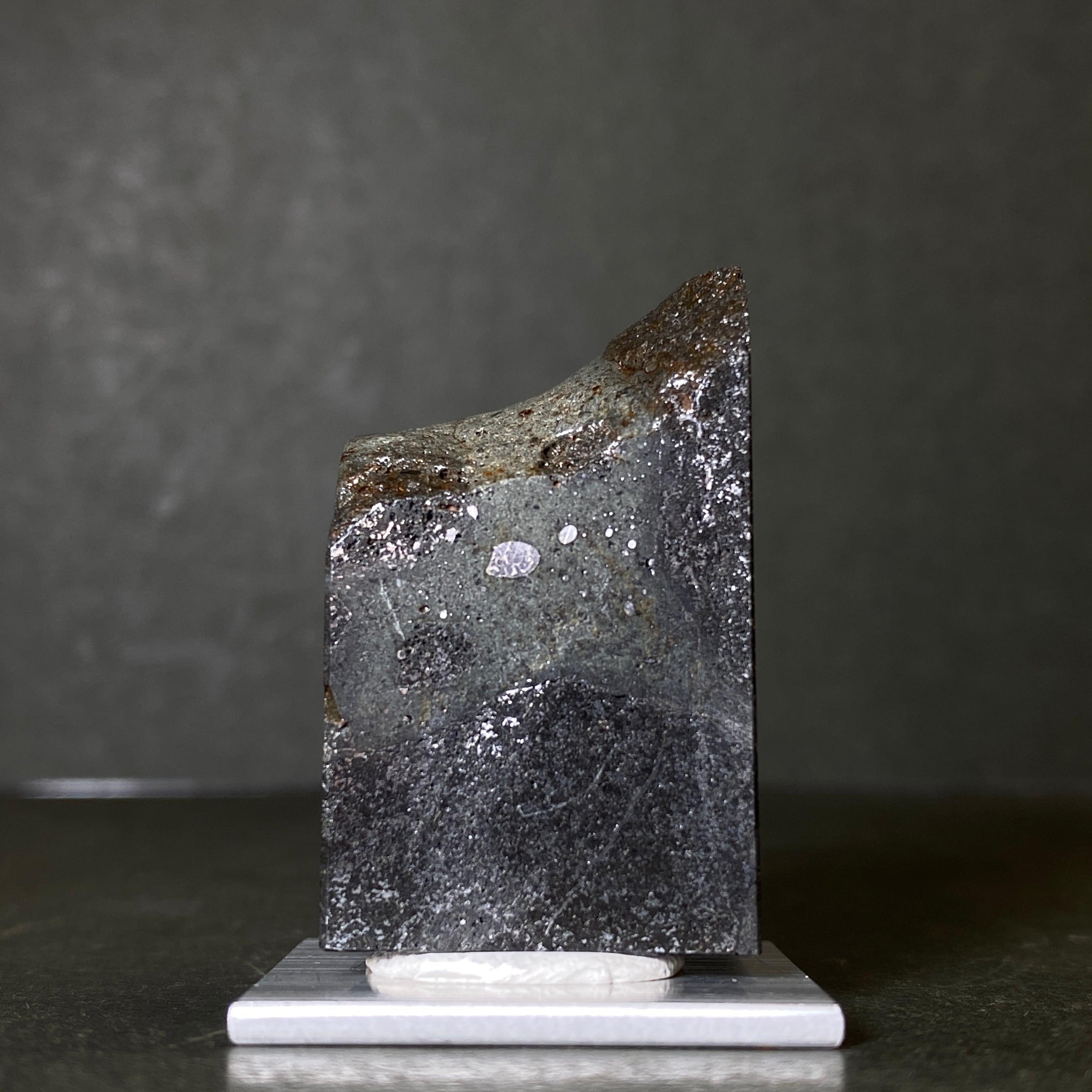 2016年にニジェール共和国で発見されたH5に分類される石質隕石です。別名Tchifaddineとも言われています。この隕石はインパクトメルト角礫岩といって、地球への衝突によって融解し再結晶化した隕石です。つまり地球に落ちた時に液体になって固まった隕石なのです。そのためか、多くの原石は球形に近い形状をしております。切断面が特徴的で、黒とシルバー色の斑点が非常に美しく表れます。この斑点は鉄隕石と同じ鉄とニッケルの成分で、石質隕石の中でも含有量が多いです。隕石ファンの心を引く隕石の1つでしょう。