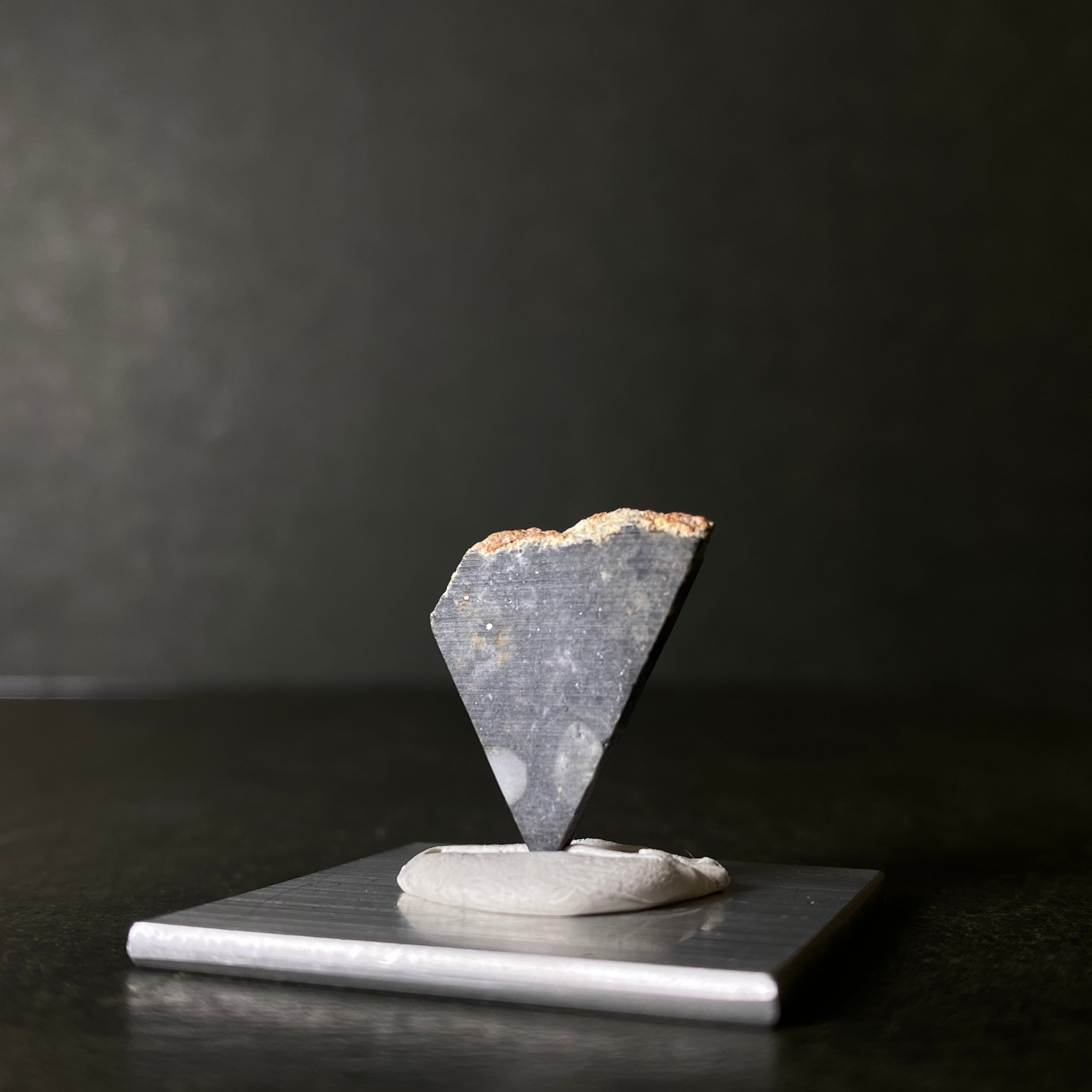 2022年の春にアルジェリアで回収された月の隕石です。惑星などが月に衝突した勢いで欠けた月の一部が宇宙を浮遊します。その欠片は軌道を描き、地球に衝突するまで何百万年も宇宙を浮遊します。なぜ月の隕石という事が分かるのかというと、アポロ計画が関係しています。アポロ計画で月の岩石が地球に持ち運ばれ、その組織構造などをデータ化しました。それにより科学的に月の隕石であると証明することができます。唯一肉眼で見られる隕石なので、世界的に人気のある隕石です。