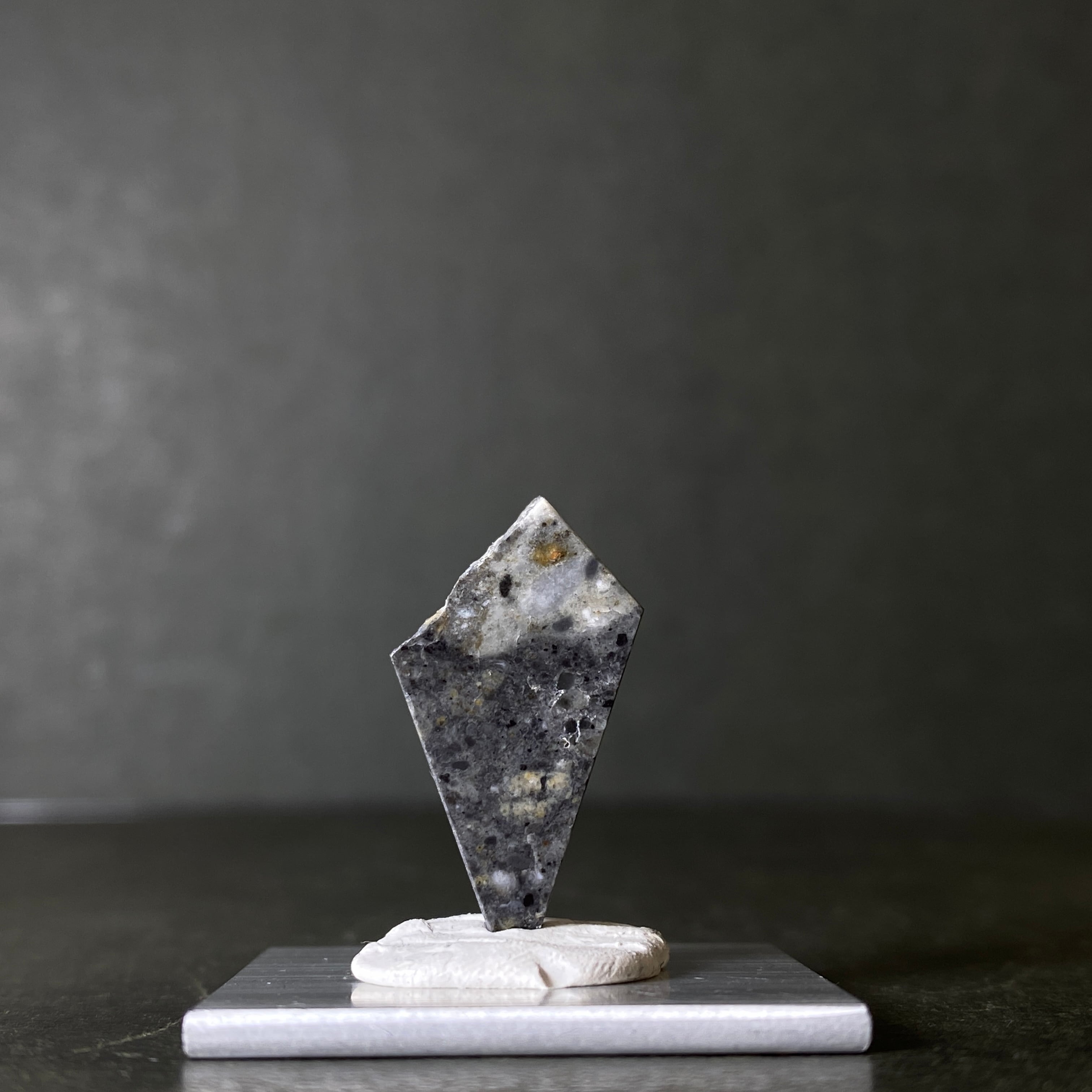 2022年の春にアルジェリアで回収された月の隕石です。惑星などが月に衝突した勢いで欠けた月の一部が宇宙を浮遊します。その欠片は軌道を描き、地球に衝突するまで何百万年も宇宙を浮遊します。なぜ月の隕石という事が分かるのかというと、アポロ計画が関係しています。アポロ計画で月の岩石が地球に持ち運ばれ、その組織構造などをデータ化しました。それにより科学的に月の隕石であると証明することができます。唯一肉眼で見られる隕石なので、世界的に人気のある隕石です。