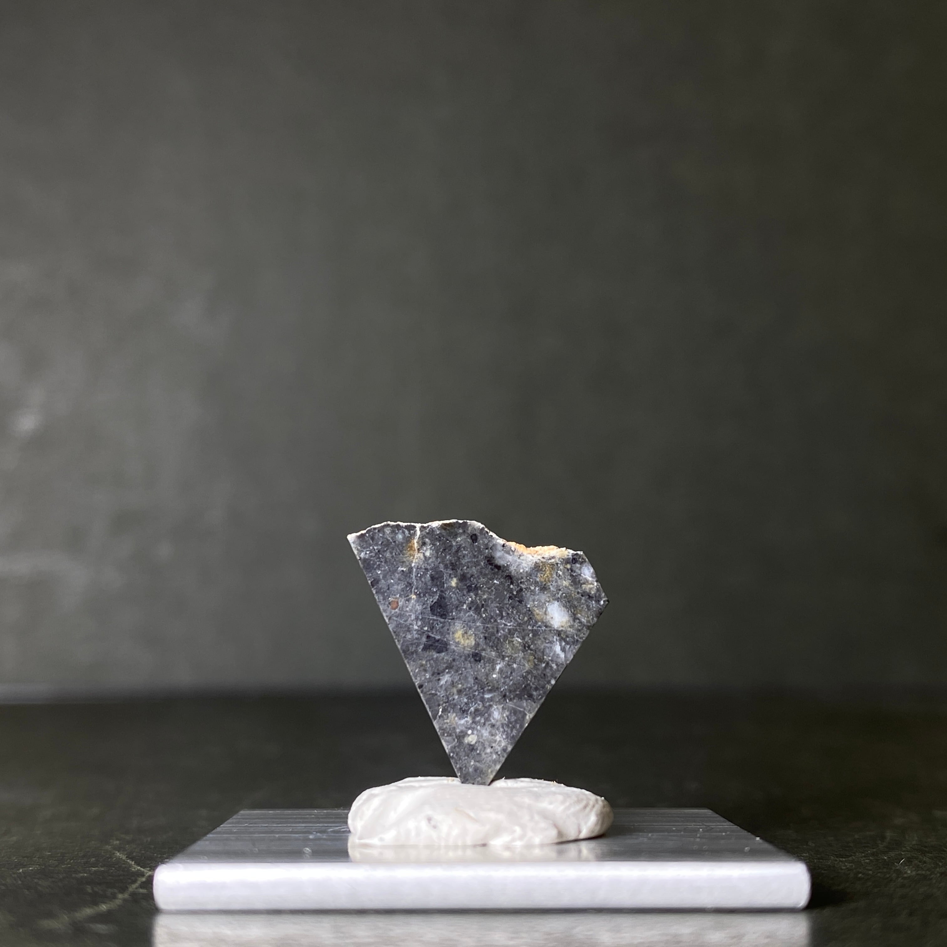 2022年の春にアルジェリアで回収された月の隕石です。惑星などが月に衝突した勢いで欠けた月の一部が宇宙を浮遊します。その欠片は軌道を描き、地球に衝突するまで何百万年も宇宙を浮遊します。なぜ月の隕石という事が分かるのかというと、アポロ計画が関係しています。アポロ計画で月の岩石が地球に持ち運ばれ、その組織構造などをデータ化しました。それにより科学的に月の隕石であると証明することができます。唯一肉眼で見られる隕石なので、世界的に人気のある隕石です。