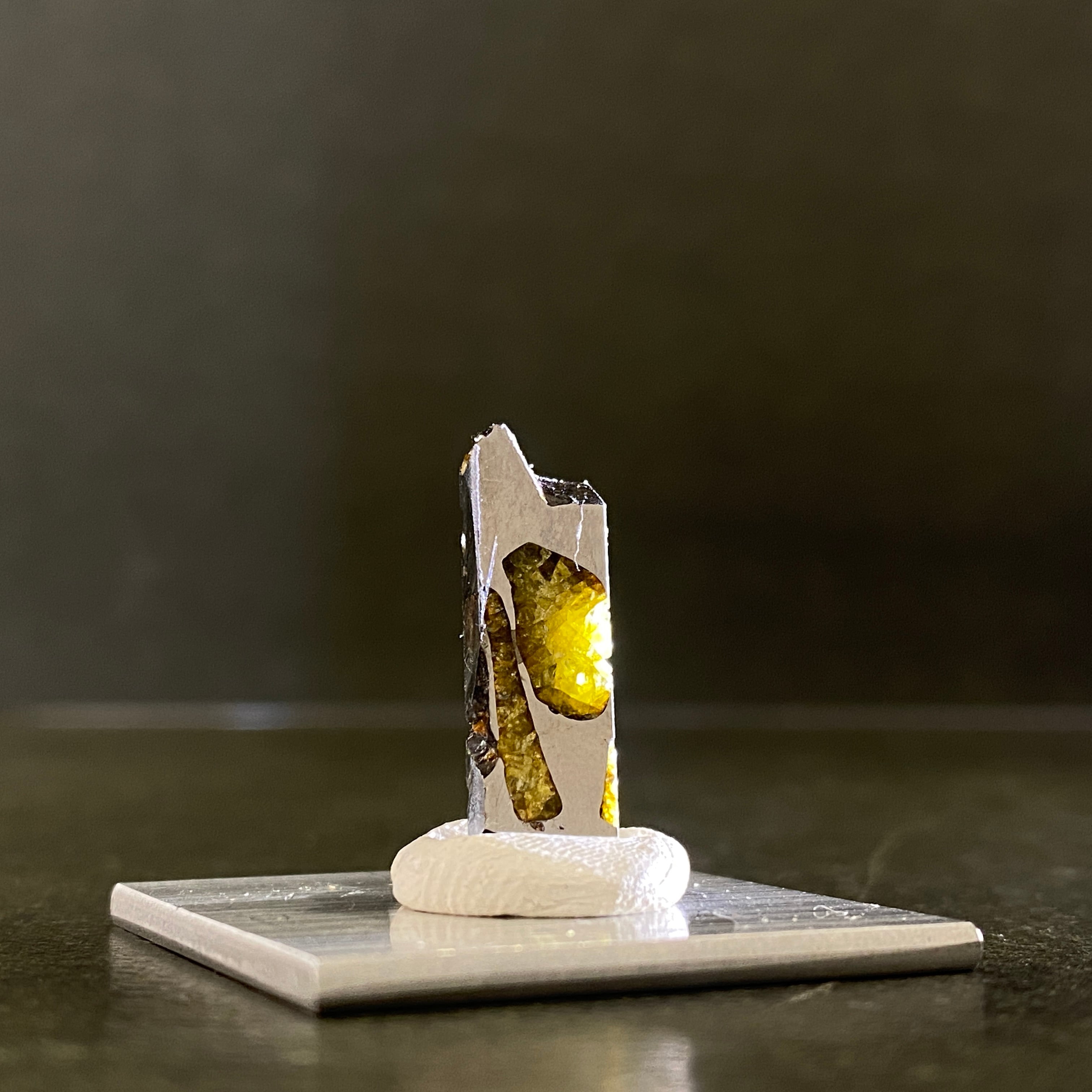 1822年にチリで発見された隕石です。パラサイト隕石自体の回収量は全体の約1%で希少なのですが、イミラックはその中でも希少かつ人気の隕石です。そのカンラン石は大きく、透明度が高いです。イエローグリーンに輝くその様は、宇宙の宝石と呼ばれるほどです。サビにくさも人気の1つです。美しいそのフォルムを美しいまま、いつまでの楽しめる隕石です。