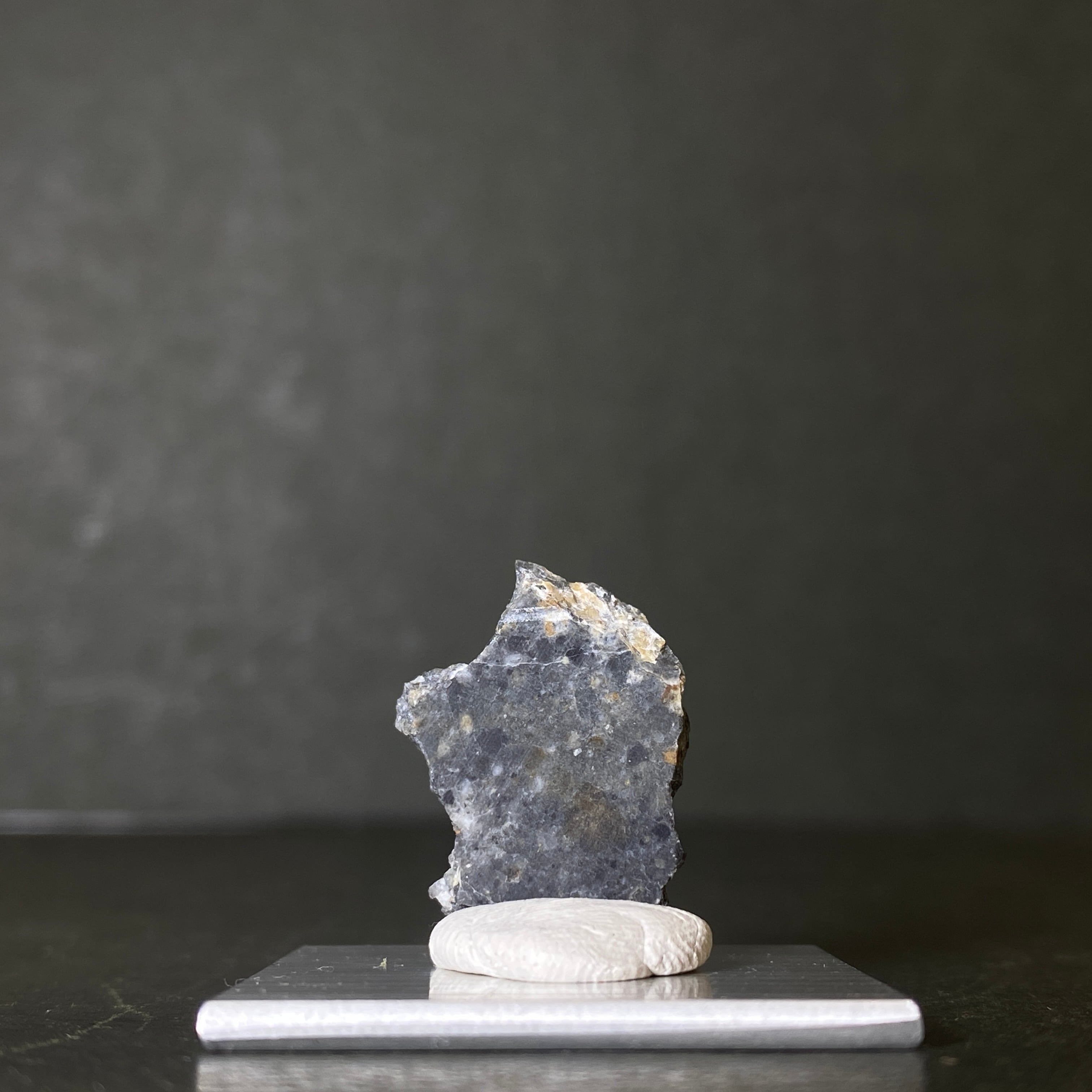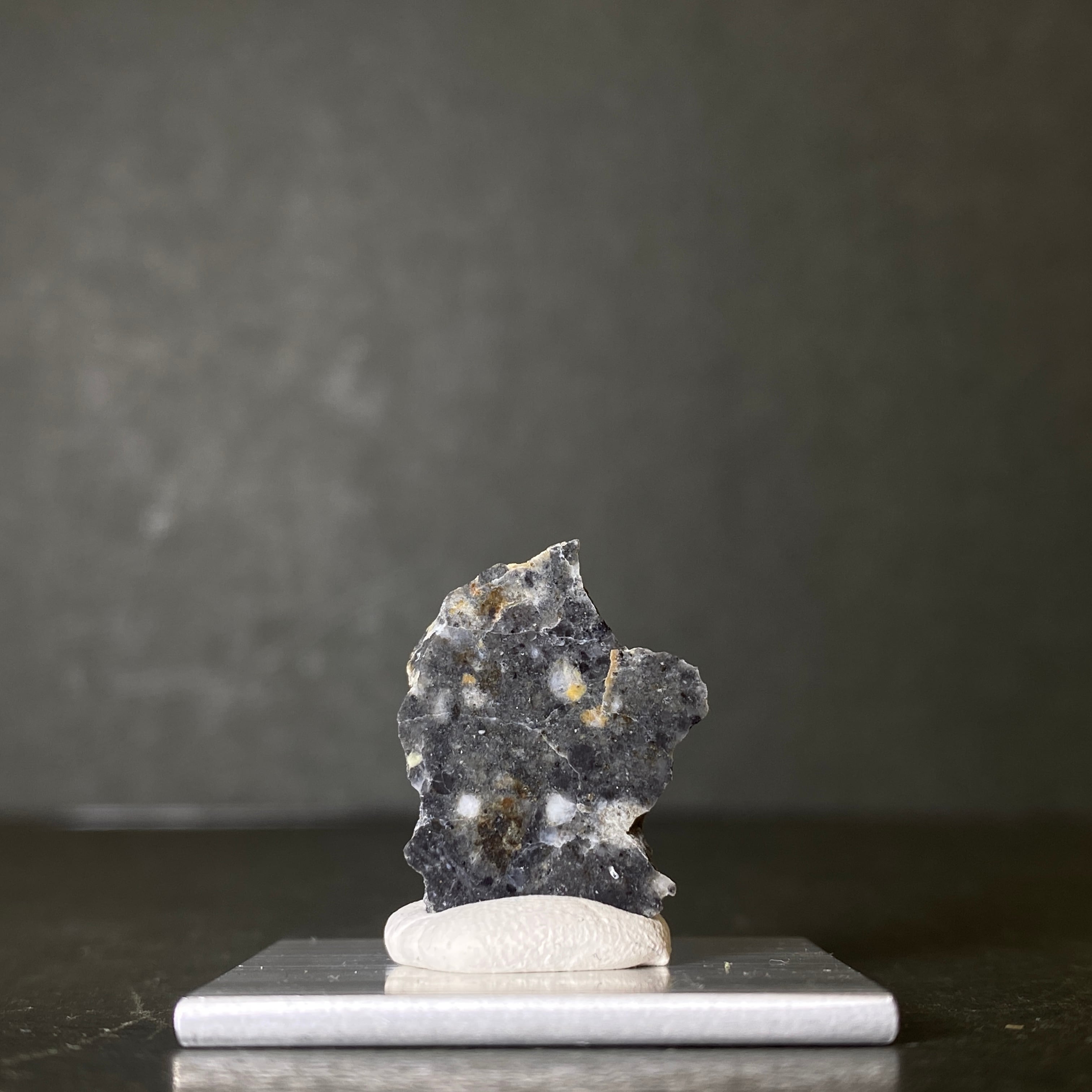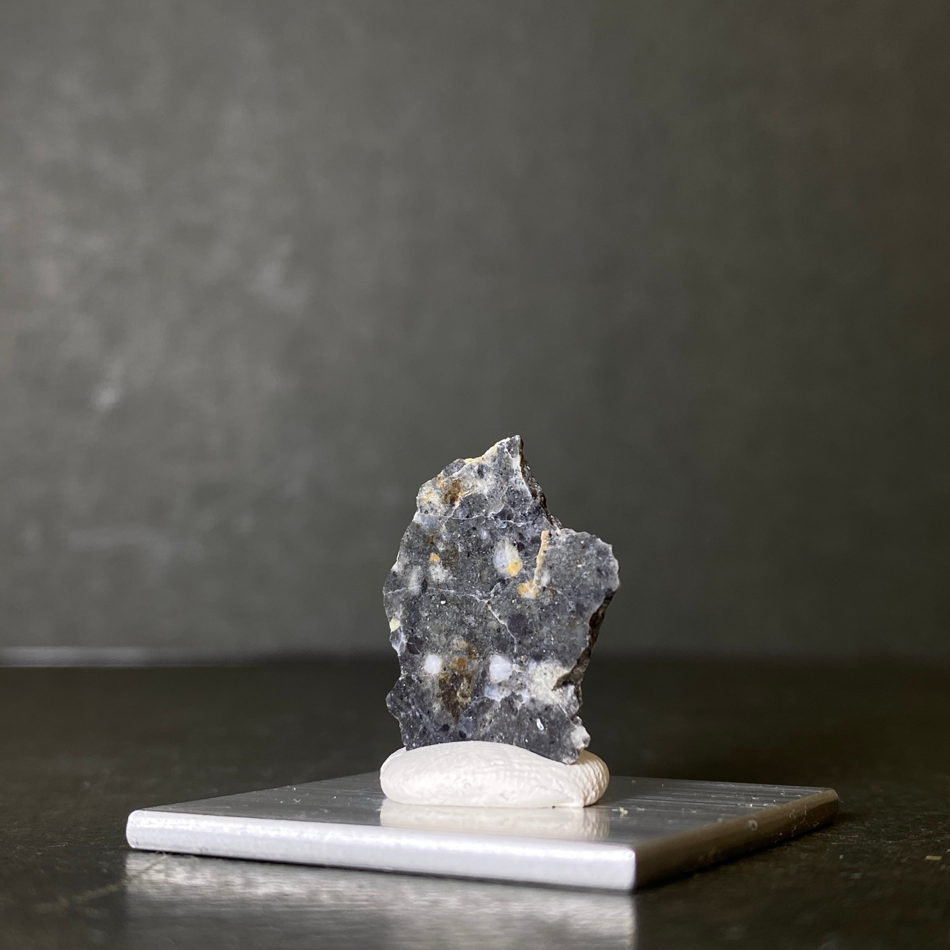 2022年の春にアルジェリアで回収された月の隕石です。惑星などが月に衝突した勢いで欠けた月の一部が宇宙を浮遊します。その欠片は軌道を描き、地球に衝突するまで何百万年も宇宙を浮遊します。なぜ月の隕石という事が分かるのかというと、アポロ計画が関係しています。アポロ計画で月の岩石が地球に持ち運ばれ、その組織構造などをデータ化しました。それにより科学的に月の隕石であると証明することができます。唯一肉眼で見られる隕石なので、世界的に人気のある隕石です。