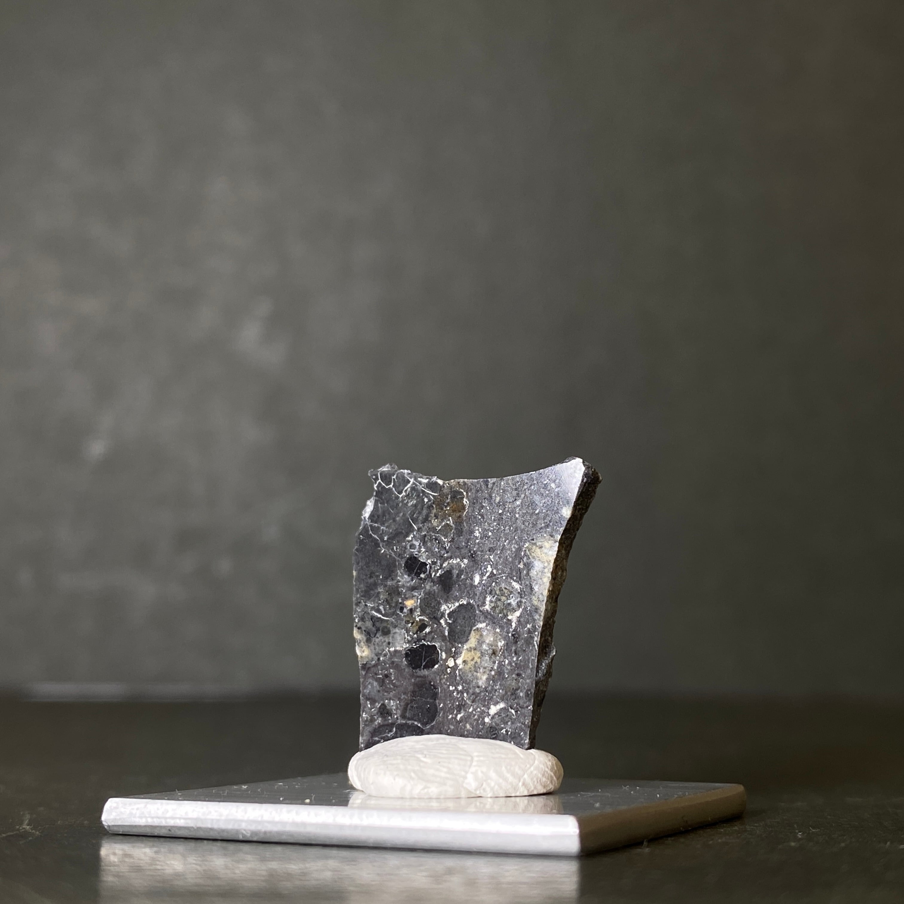 2022年の春にアルジェリアで回収された月の隕石です。惑星などが月に衝突した勢いで欠けた月の一部が宇宙を浮遊します。その欠片は軌道を描き、地球に衝突するまで何百万年も宇宙を浮遊します。なぜ月の隕石という事が分かるのかというと、アポロ計画が関係しています。アポロ計画で月の岩石が地球に持ち運ばれ、その組織構造などをデータ化しました。それにより科学的に月の隕石であると証明することができます。唯一肉眼で見られる隕石なので、世界的に人気のある隕石です。