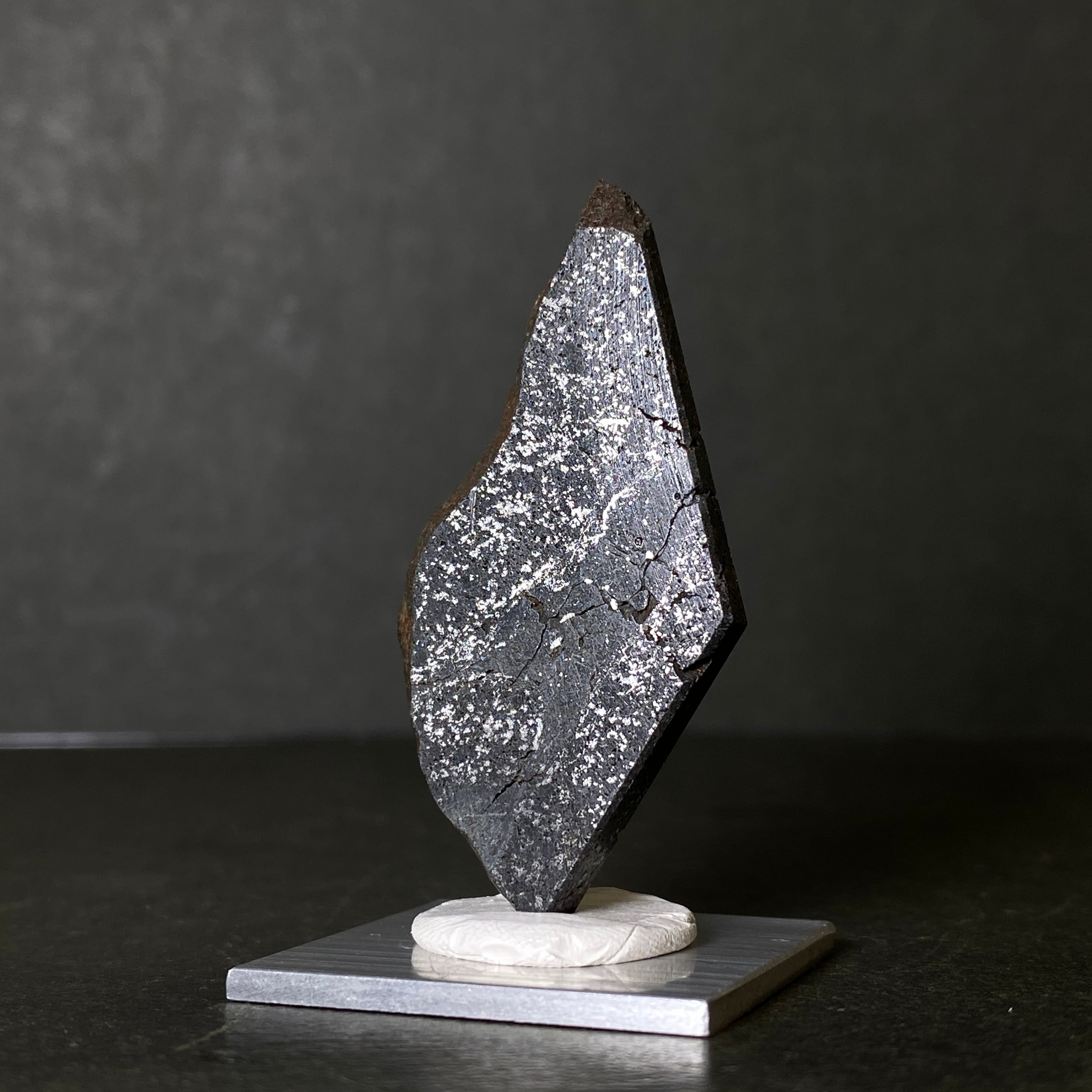 2016年にニジェール共和国で発見されたH5に分類される石質隕石です。別名Tchifaddineとも言われています。この隕石はインパクトメルト角礫岩といって、地球への衝突によって融解し再結晶化した隕石です。つまり地球に落ちた時に液体になって固まった隕石なのです。そのためか、多くの原石は球形に近い形状をしております。切断面が特徴的で、黒とシルバー色の斑点が非常に美しく表れます。この斑点は鉄隕石と同じ鉄とニッケルの成分で、石質隕石の中でも含有量が多いです。隕石ファンの心を引く隕石の1つでしょう。