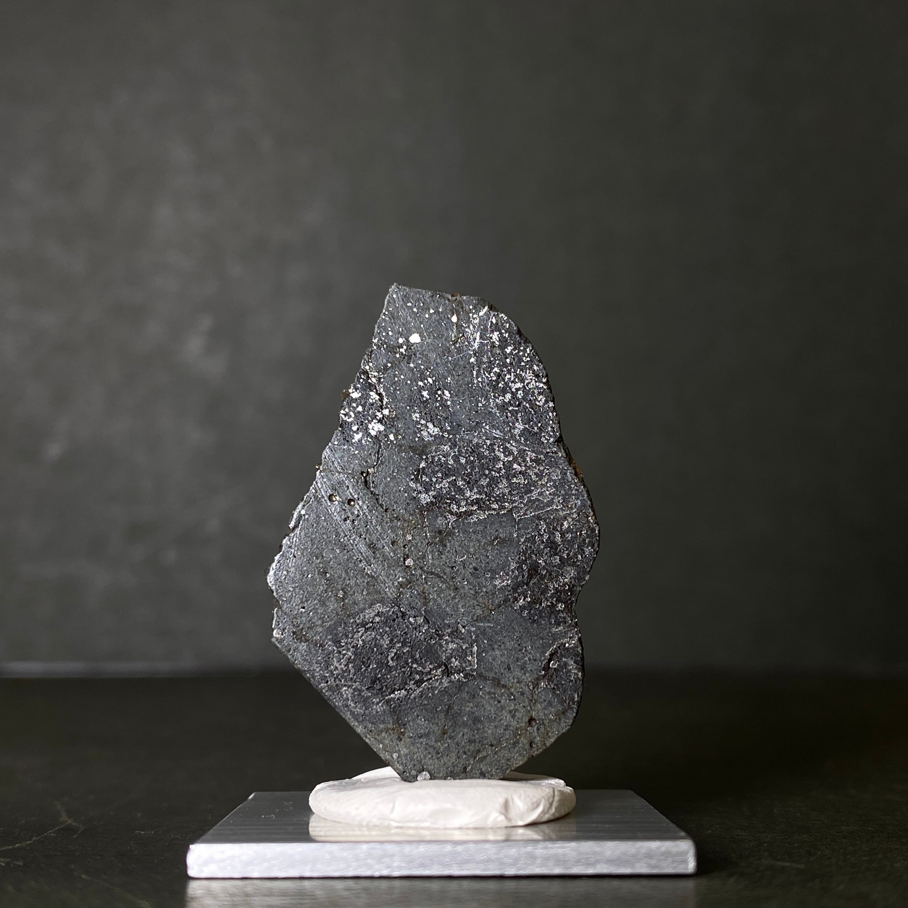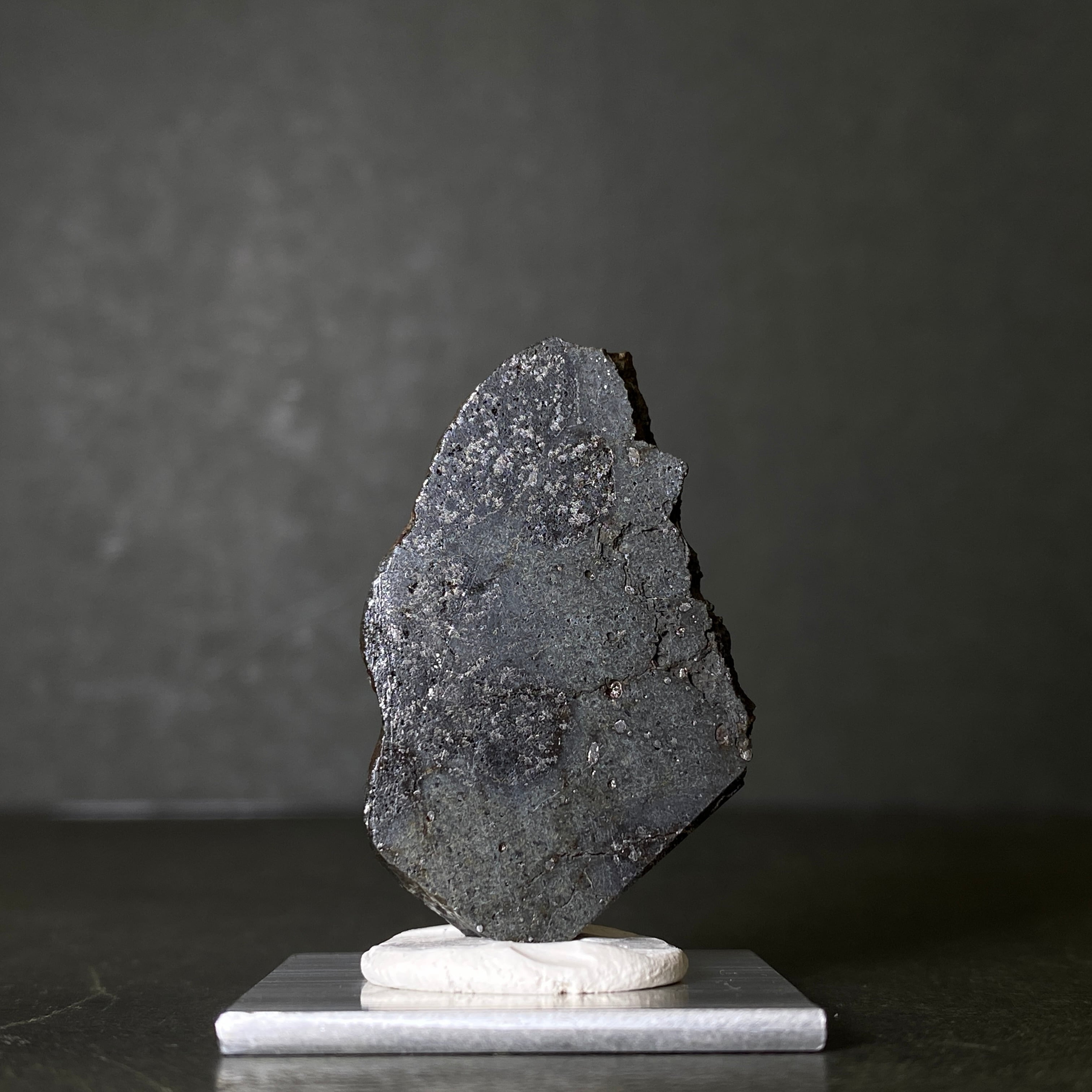 2016年にニジェール共和国で発見されたH5に分類される石質隕石です。別名Tchifaddineとも言われています。この隕石はインパクトメルト角礫岩といって、地球への衝突によって融解し再結晶化した隕石です。つまり地球に落ちた時に液体になって固まった隕石なのです。そのためか、多くの原石は球形に近い形状をしております。切断面が特徴的で、黒とシルバー色の斑点が非常に美しく表れます。この斑点は鉄隕石と同じ鉄とニッケルの成分で、石質隕石の中でも含有量が多いです。隕石ファンの心を引く隕石の1つでしょう。