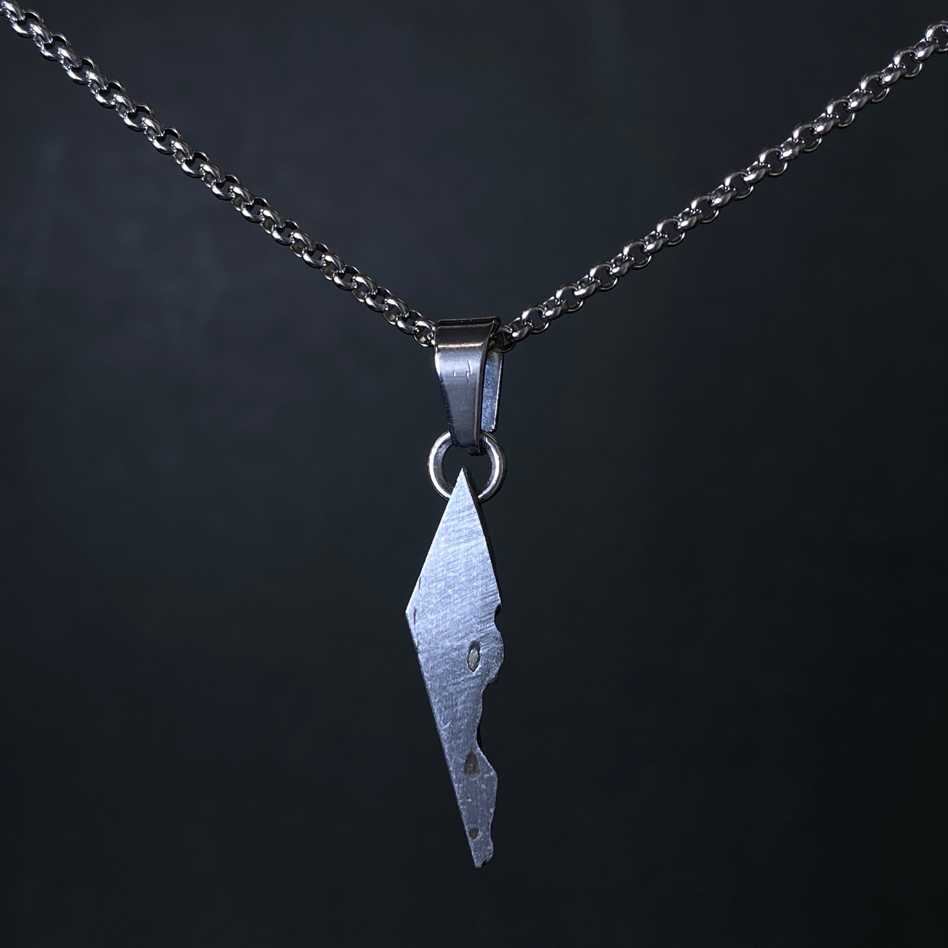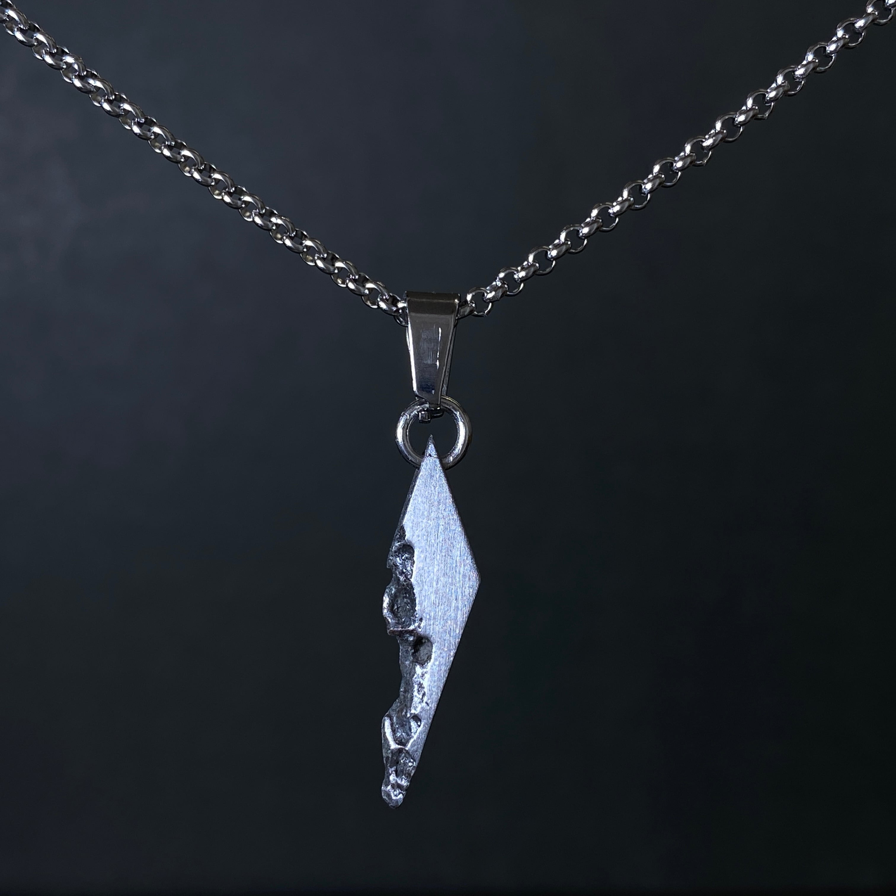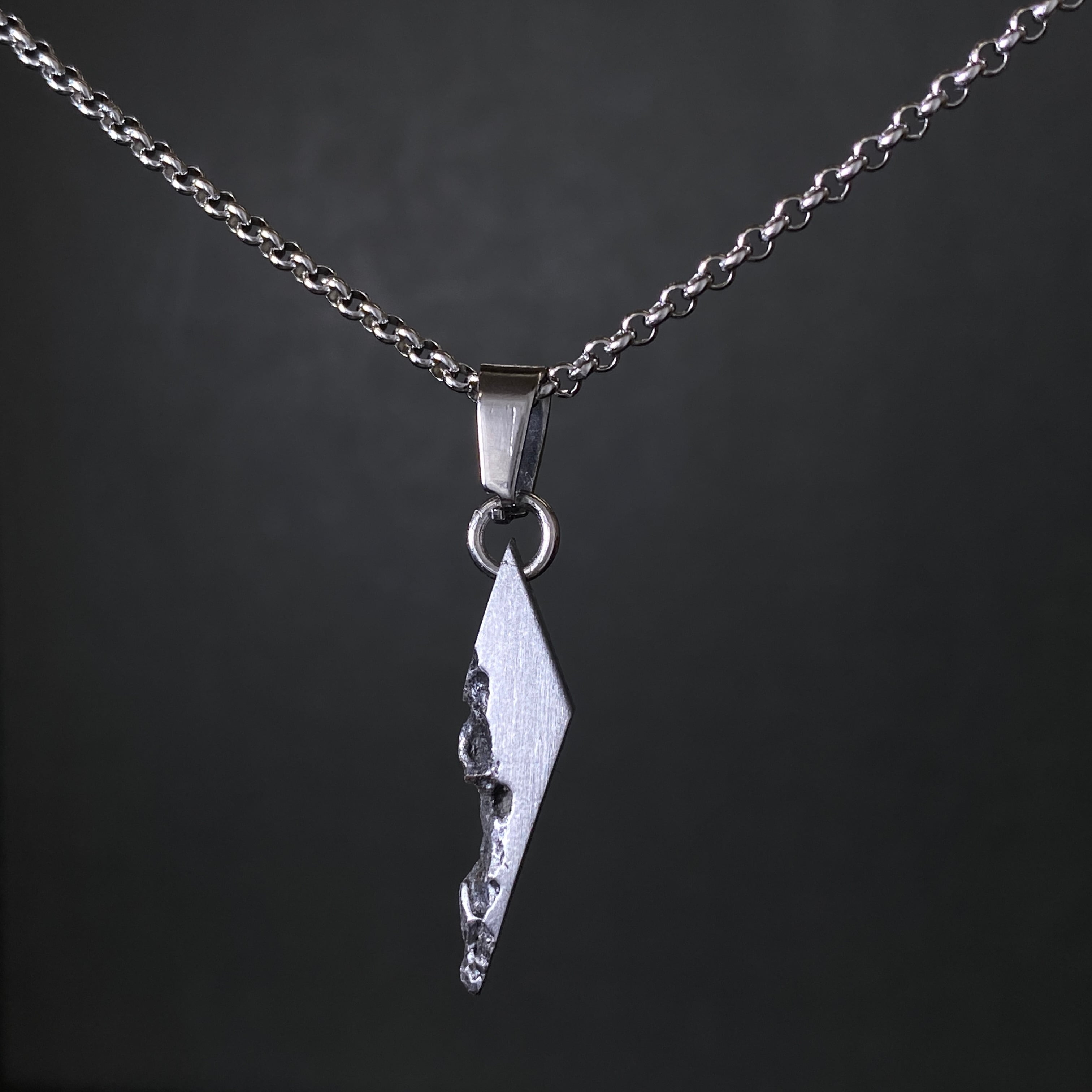 2000年にロシアで発見された隕石です。鉄隕石の一種で、ウィドマンシュテッテン構造が出ないアタキサイトに分類されます。それは隕石の主成分である鉄とニッケルの成分比の違いによるもので、ドロニノ隕石はニッケルが25%以上あるのが特徴です。そのためスライス品の鏡面仕上げが一般的で、その断面にトロイライトという黒いポツポツがあるのも特徴の1つです。
