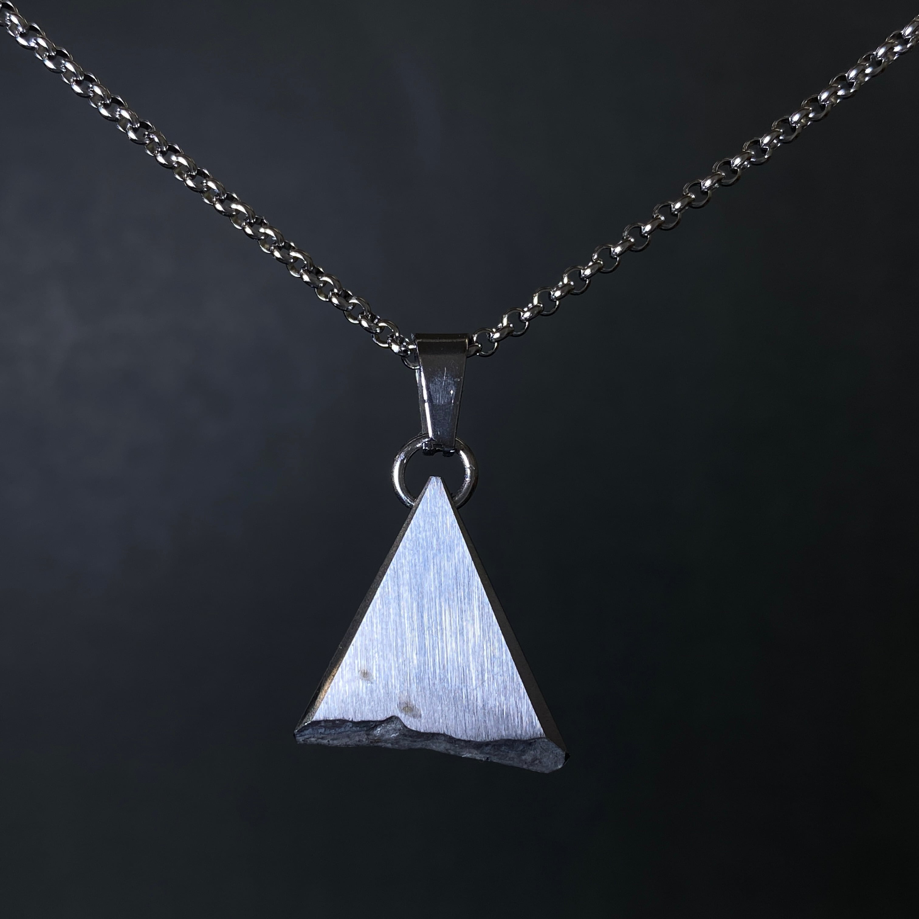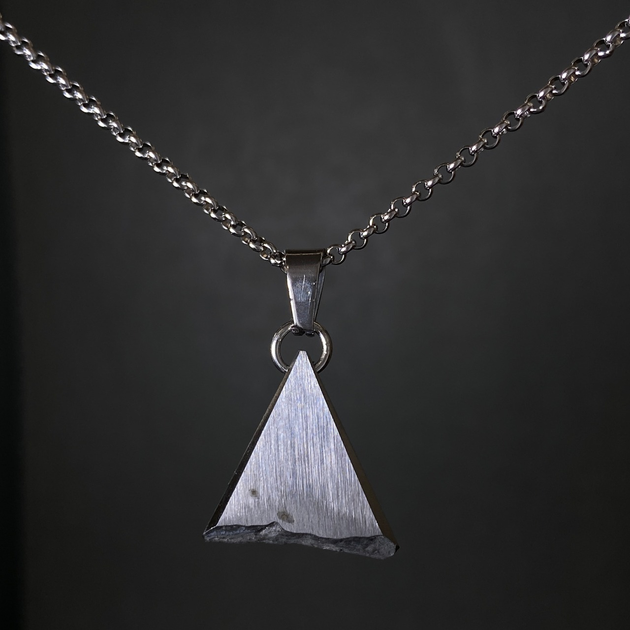 2000年にロシアで発見された隕石です。鉄隕石の一種で、ウィドマンシュテッテン構造が出ないアタキサイトに分類されます。それは隕石の主成分である鉄とニッケルの成分比の違いによるもので、ドロニノ隕石はニッケルが25%以上あるのが特徴です。そのためスライス品の鏡面仕上げが一般的で、その断面にトロイライトという黒いポツポツがあるのも特徴の1つです。