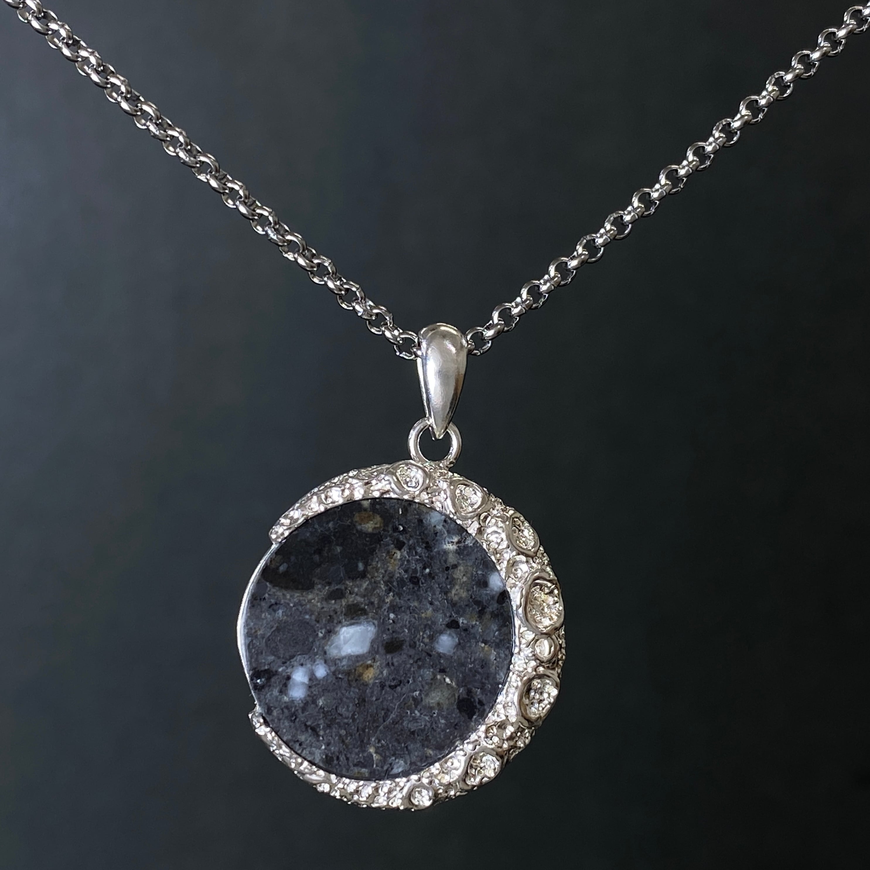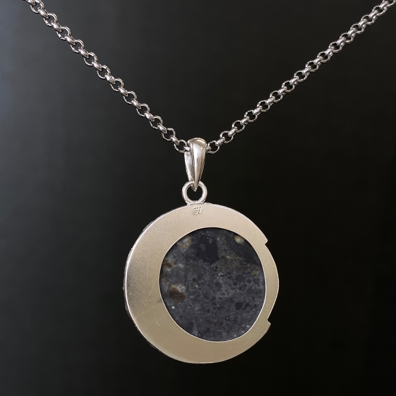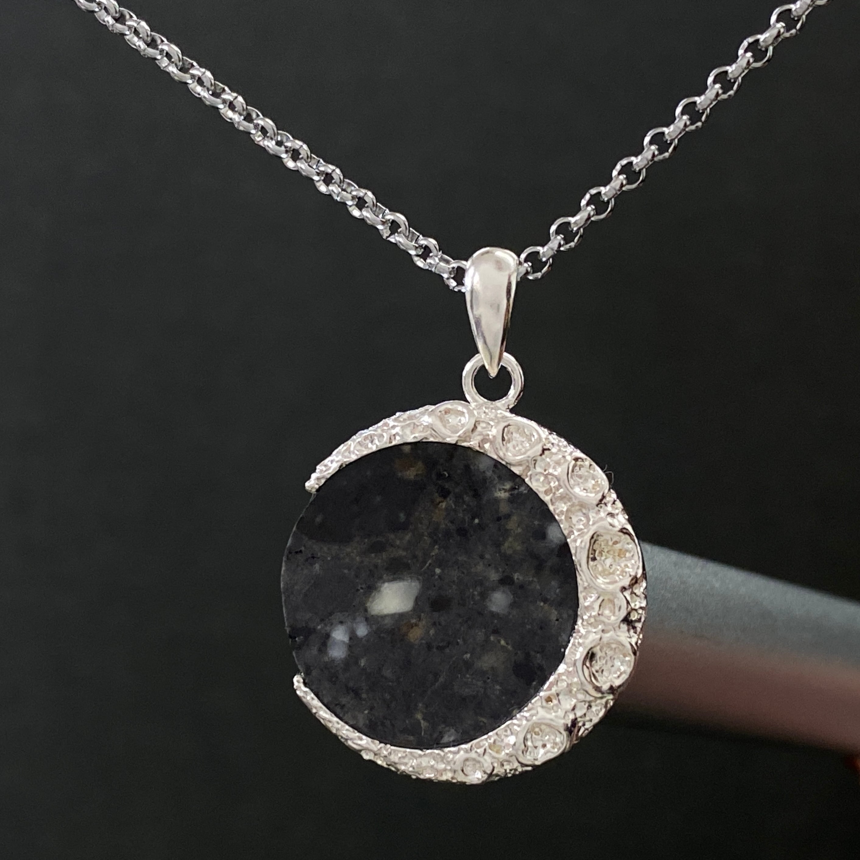 2022年の春にアルジェリアで回収された月の隕石です。惑星などが月に衝突した勢いで欠けた月の一部が宇宙を浮遊します。その欠片は軌道を描き、地球に衝突するまで何百万年も宇宙を浮遊します。なぜ月の隕石という事が分かるのかというと、アポロ計画が関係しています。アポロ計画で月の岩石が地球に持ち運ばれ、その組織構造などをデータ化しました。それにより科学的に月の隕石であると証明することができます。唯一肉眼で見られる隕石なので、世界的に人気のある隕石です。