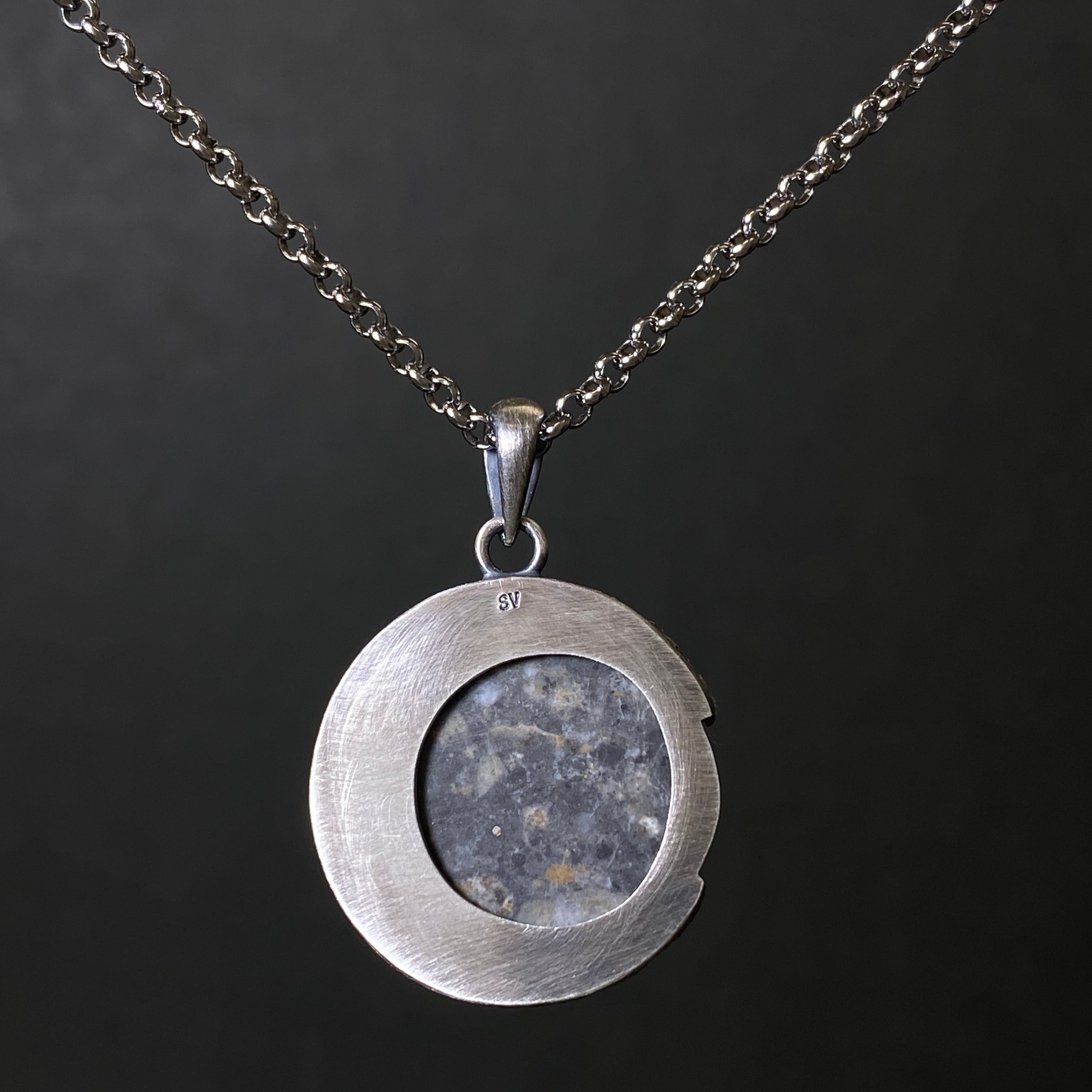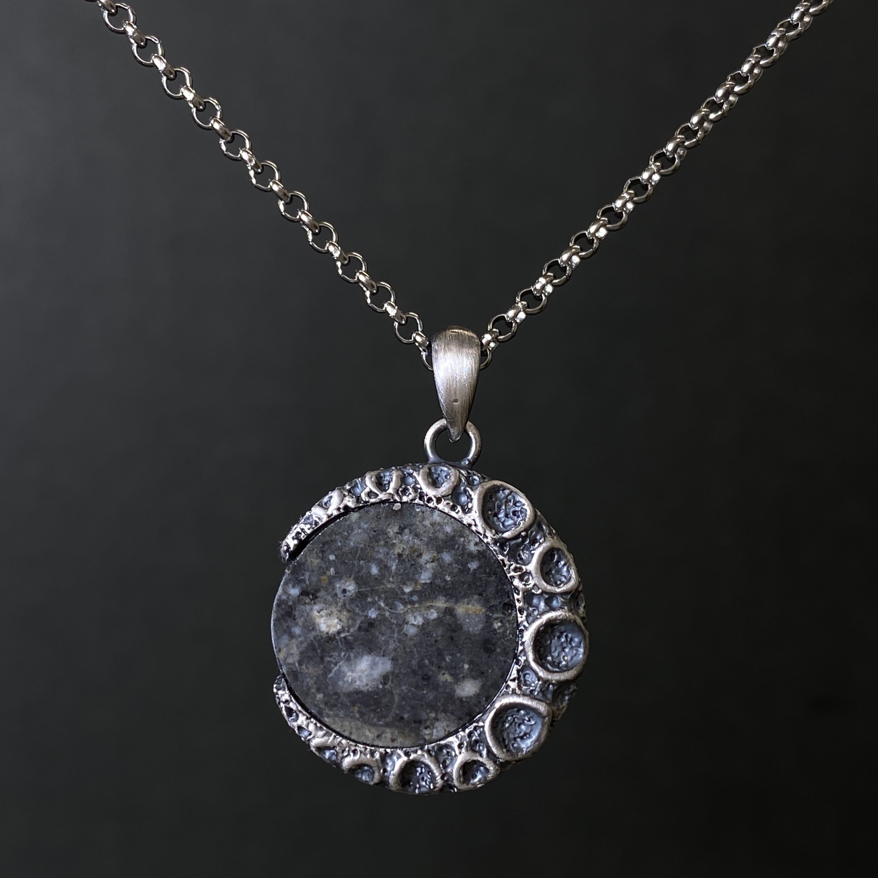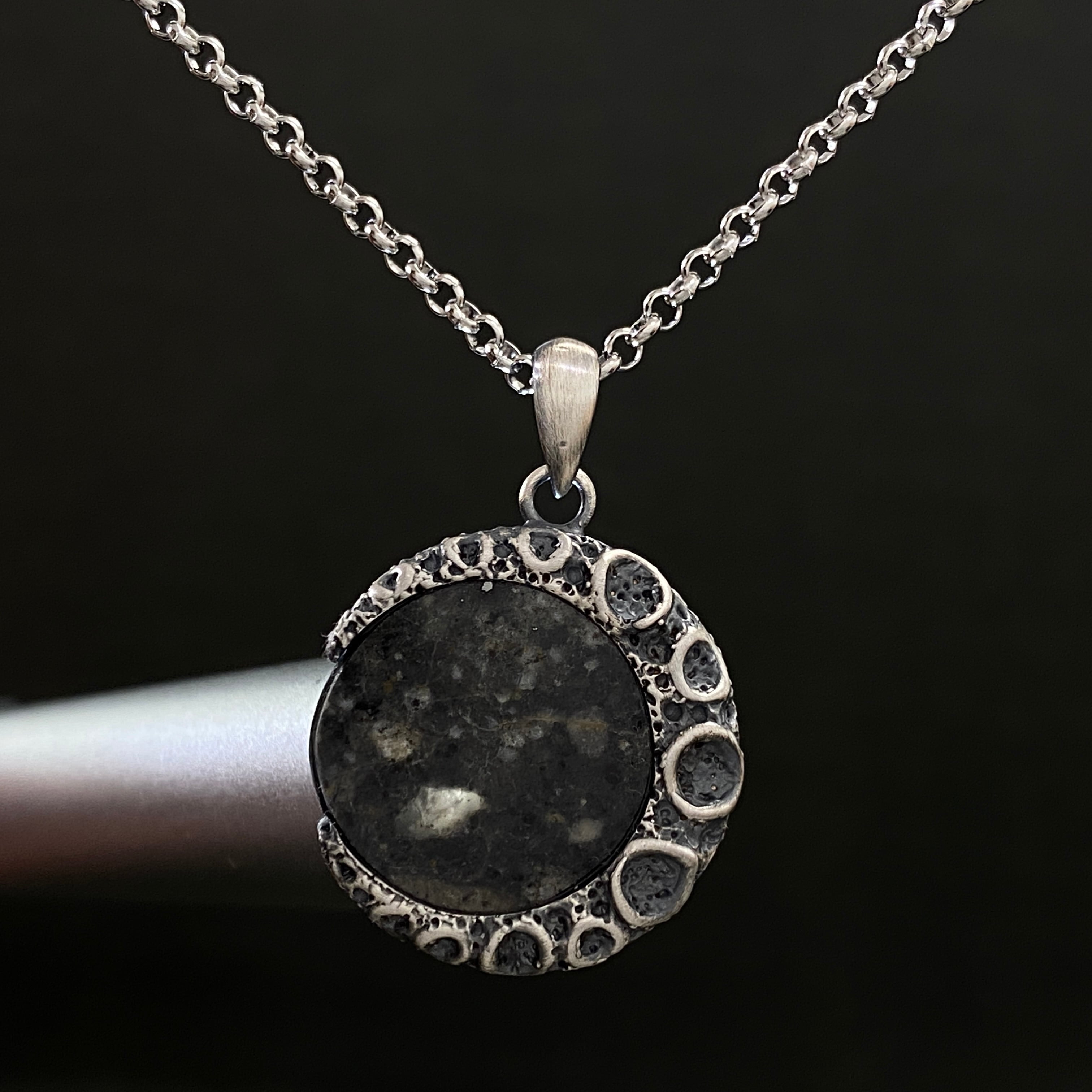 2022年の春にアルジェリアで回収された月の隕石です。惑星などが月に衝突した勢いで欠けた月の一部が宇宙を浮遊します。その欠片は軌道を描き、地球に衝突するまで何百万年も宇宙を浮遊します。なぜ月の隕石という事が分かるのかというと、アポロ計画が関係しています。アポロ計画で月の岩石が地球に持ち運ばれ、その組織構造などをデータ化しました。それにより科学的に月の隕石であると証明することができます。唯一肉眼で見られる隕石なので、世界的に人気のある隕石です。