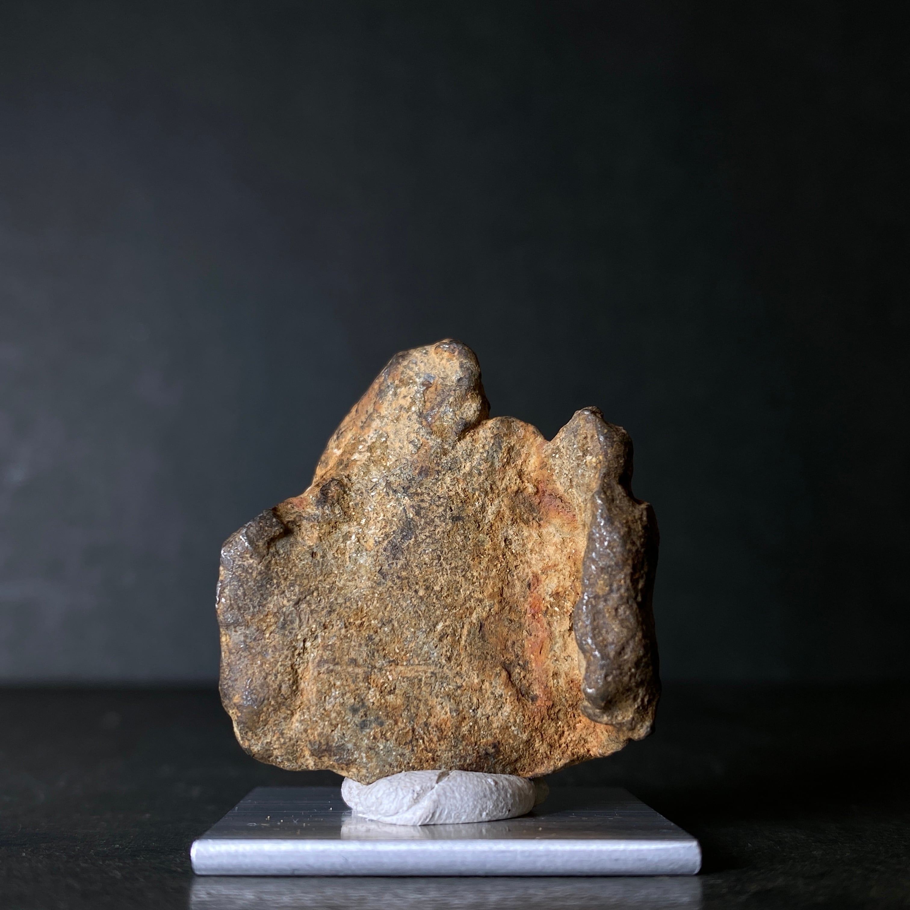 2009年にエジプトで発見された隕石です。当時、ミラノ自然史博物館の元学芸員であるイタリアの科学者ヴィンチェンツォデミケーレがその隕石クレーターを発見しました。彼らによって合計800キロの隕石が回収され、その多くはカイロのエジプト地質学博物館に展示されているようです。50世紀もののあいだ砂漠の奥深くにいたためか、他の隕石と比べてサビにくいです。ゲベルカミル隕石はアタキサイトに分類され、酸処理してもウィドマンシュテッテン構造が出ない隕石です。一般的にスライス品は鏡面加工されており、原石よりも高価になっています。原石はどの隕石にも無い表皮をしています。それは爬虫類の表皮や亀の甲羅のような感じで、のっぺりとしているのが特徴的です。