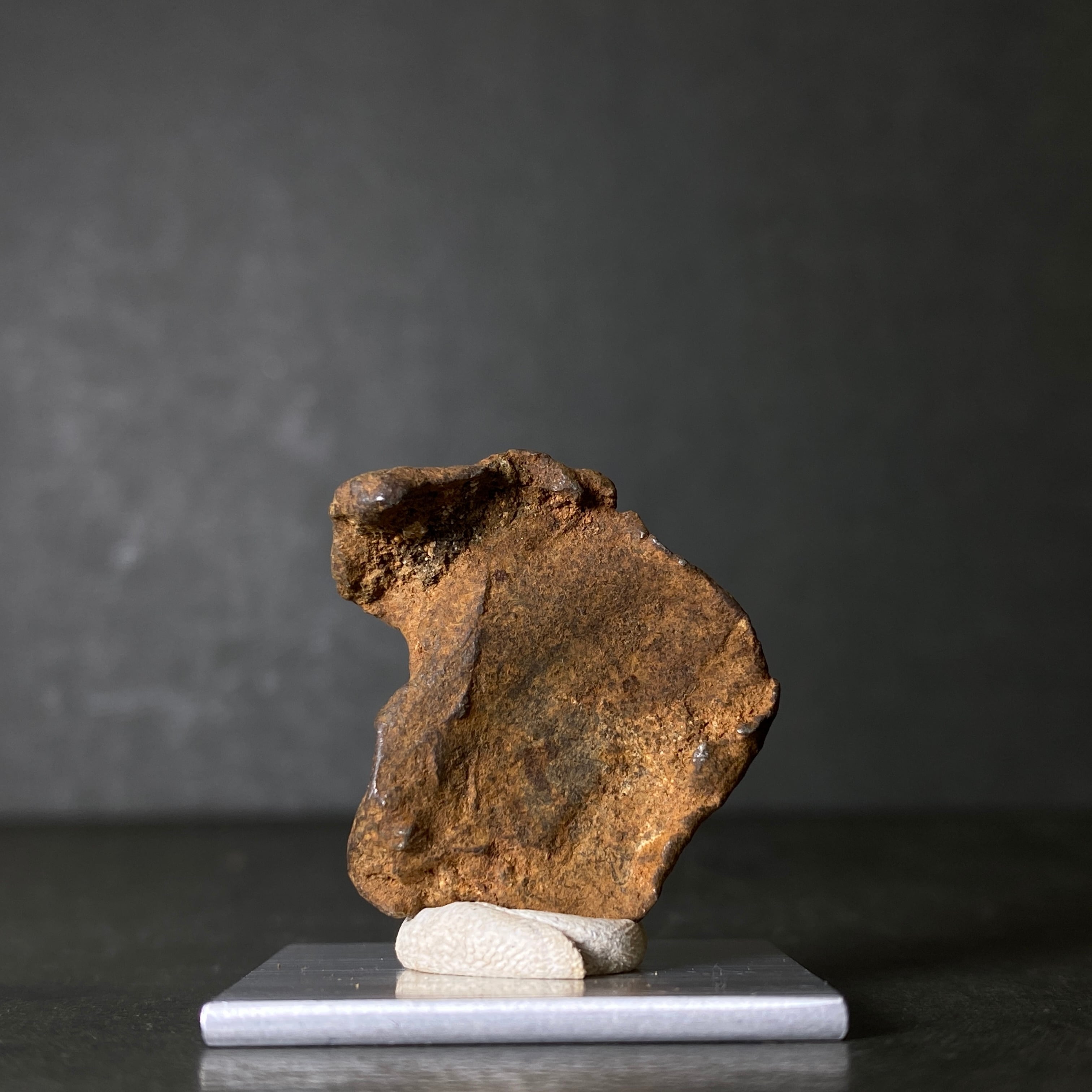 2009年にエジプトで発見された隕石です。当時、ミラノ自然史博物館の元学芸員であるイタリアの科学者ヴィンチェンツォデミケーレがその隕石クレーターを発見しました。彼らによって合計800キロの隕石が回収され、その多くはカイロのエジプト地質学博物館に展示されているようです。50世紀もののあいだ砂漠の奥深くにいたためか、他の隕石と比べてサビにくいです。ゲベルカミル隕石はアタキサイトに分類され、酸処理してもウィドマンシュテッテン構造が出ない隕石です。一般的にスライス品は鏡面加工されており、原石よりも高価になっています。原石はどの隕石にも無い表皮をしています。それは爬虫類の表皮や亀の甲羅のような感じで、のっぺりとしているのが特徴的です。