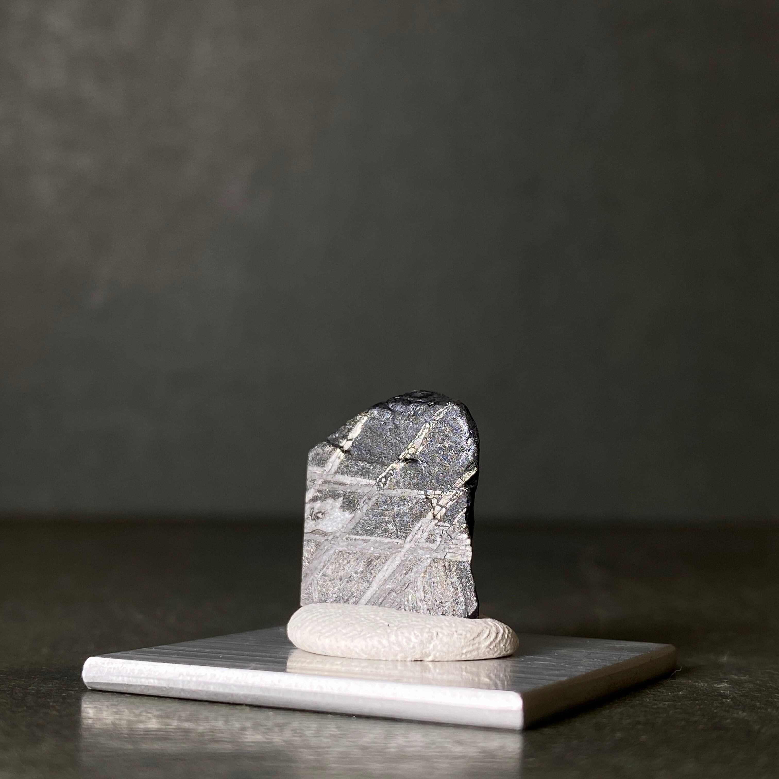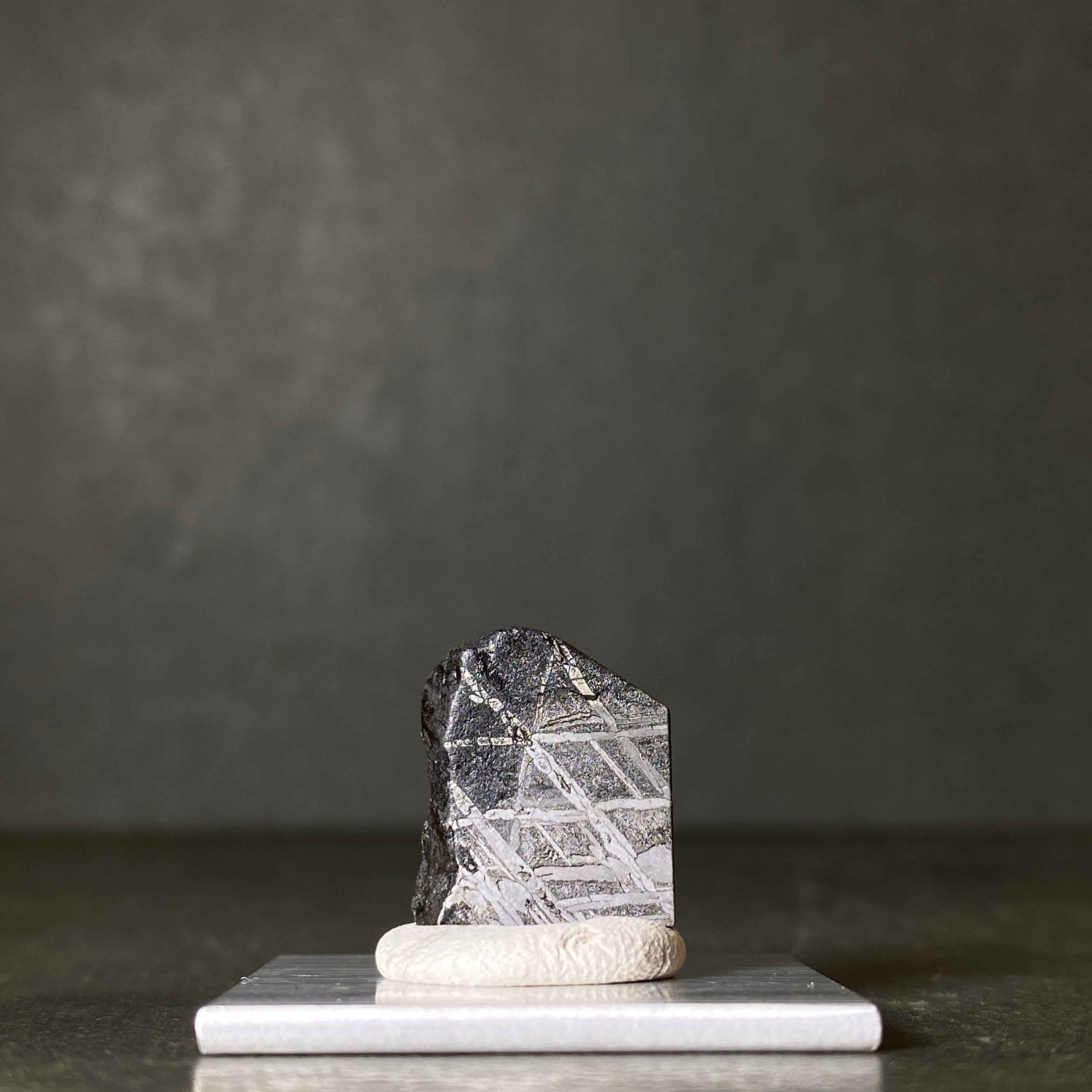 1968年にフランスで発見された隕石です。珍しいヨーロッパの鉄隕石で、シャンパンやワインに使われるぶどう畑で回収されました。サントーバン隕石の特徴はなんといっても特別な切断面です。独特なウィドマンシュテッテン構造にトロイライトの小結晶、そして異常なまでに大きいシュライバーサイトが見られます。局所的にサビが出るのも特徴的で、ウィドマンシュテッテン構造に沿って四角く出るのはこの隕石だけです。側面に多いトロイライトも同様に四角くなっています。どんな隕石とも似つかない特別な隕石であることは間違いありません。