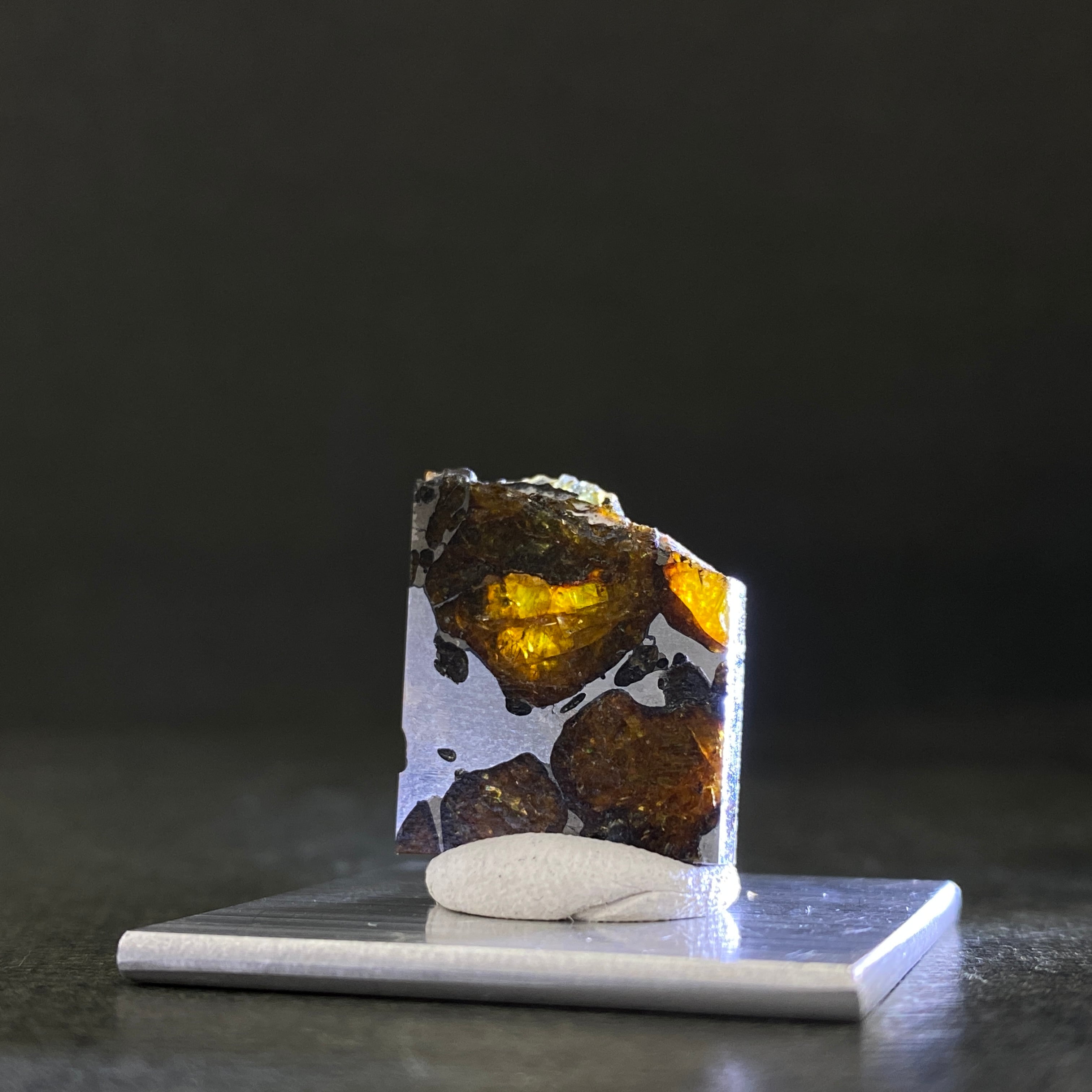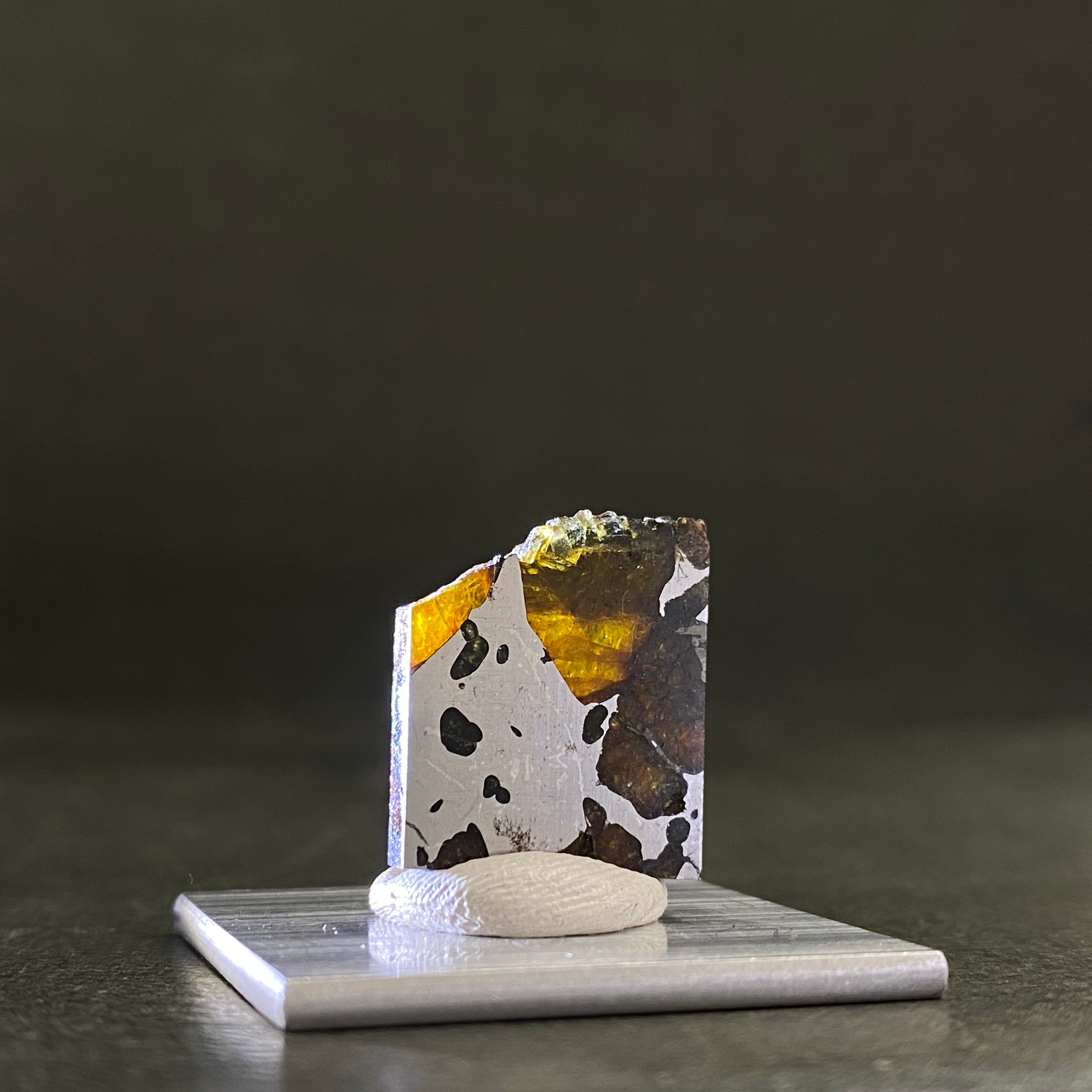 1822年にチリで発見された隕石です。パラサイト隕石自体の回収量は全体の約1%で希少なのですが、イミラックはその中でも希少かつ人気の隕石です。そのカンラン石は大きく、透明度が高いです。イエローグリーンに輝くその様は、宇宙の宝石と呼ばれるほどです。サビにくさも人気の1つです。美しいそのフォルムを美しいまま、いつまでの楽しめる隕石です。