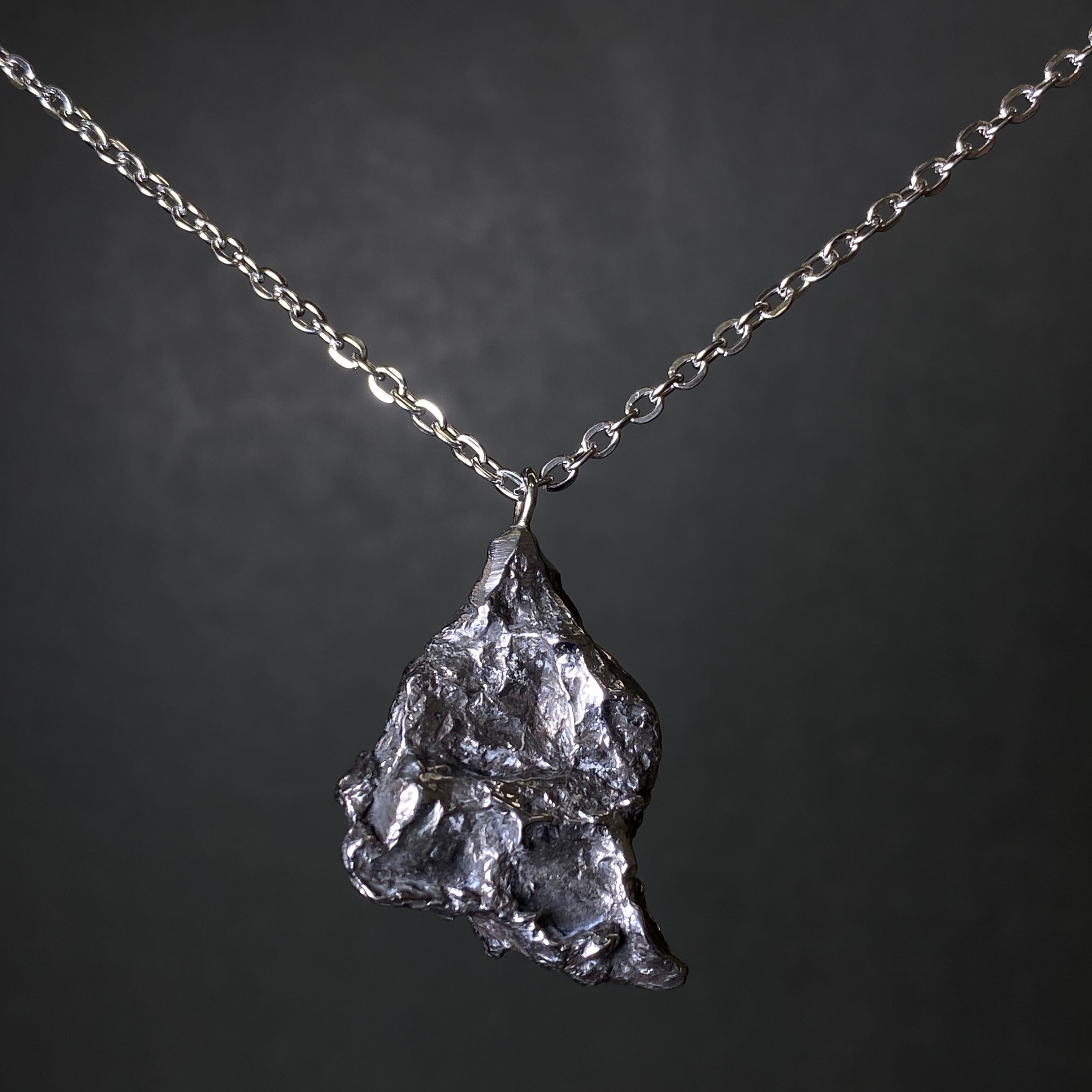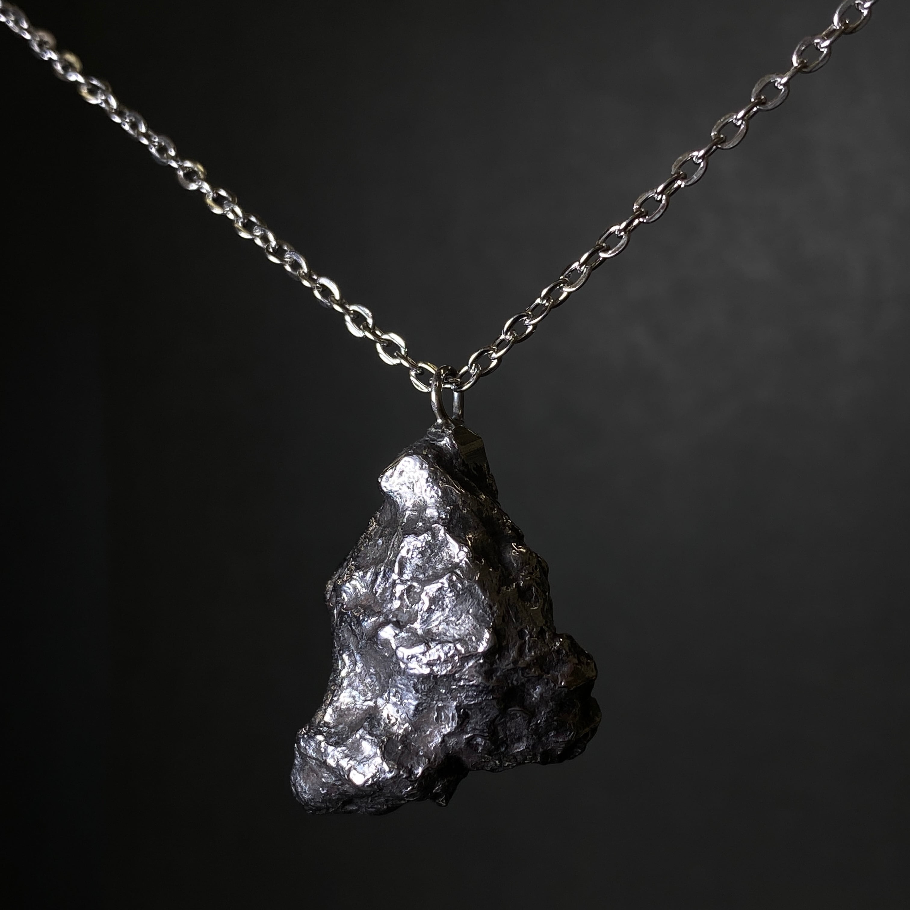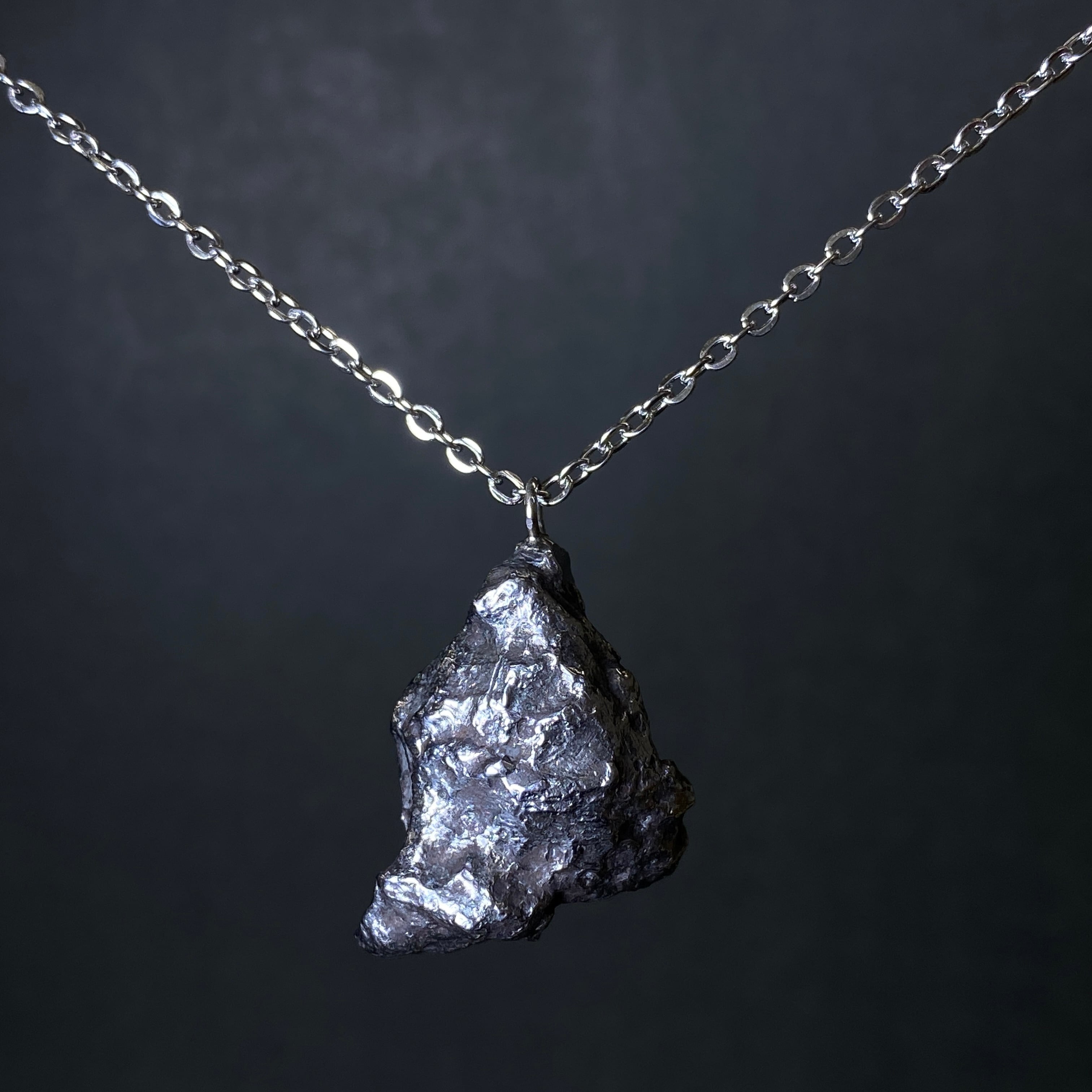 1947年にロシアでの落下を目撃された隕石です。この隕石は1947年2月12日の夜、多くの落下目撃証言者がいる有名な隕石です。推定70トンの塊が、マッハを超えるスピードで地球の暖かい大気を爆破したと言われています。地球の高い空気圧によって隕石がせん断され破壊されました。それを地球上から見ると大火球が火球になった瞬間で、空気爆発とも言われています。シホーテアリン隕石には2つの形があります。引き裂かれたフォルムと丸みを帯びたフォルムです。前者の方は珍しく、回収量の約20%しか発見されていません。その形が独創的であればあるほど価値は高く、同じ大きさでも5倍以上価格差があるようです。なんといってもこの隕石の美しさはノイマンラインです。細い先がいくつも見られ、そのアクセントとしてシュライバーサイトが見られます。