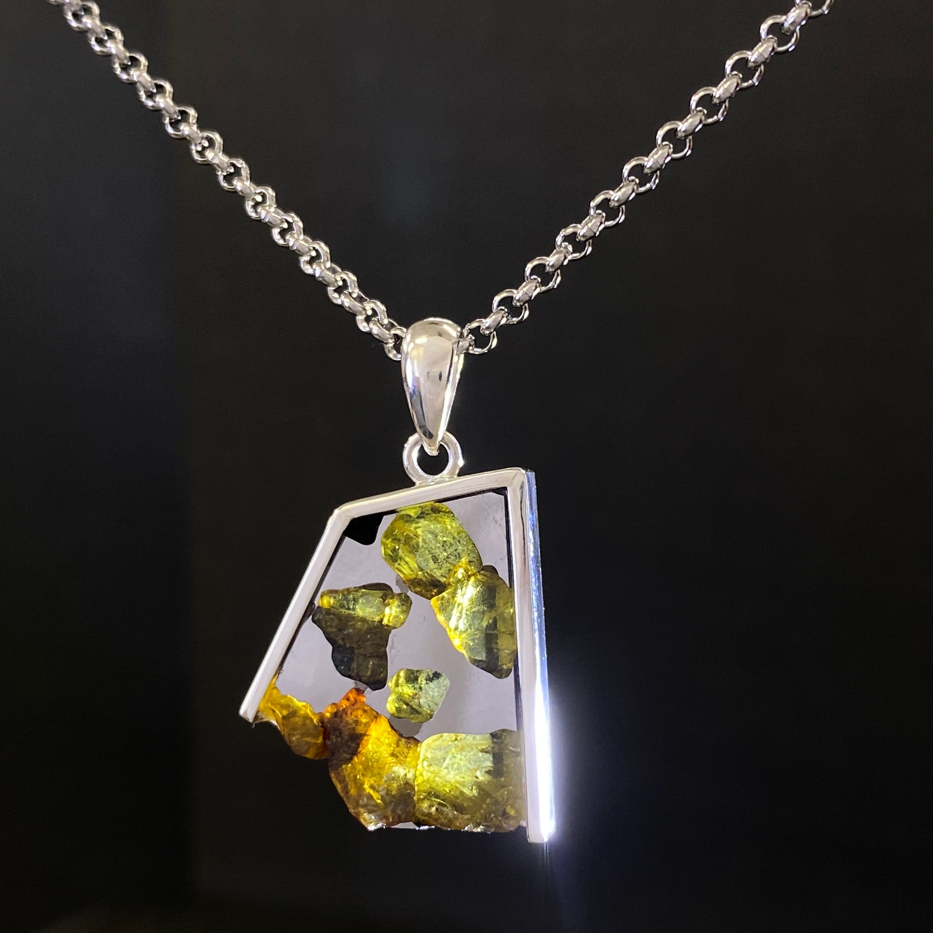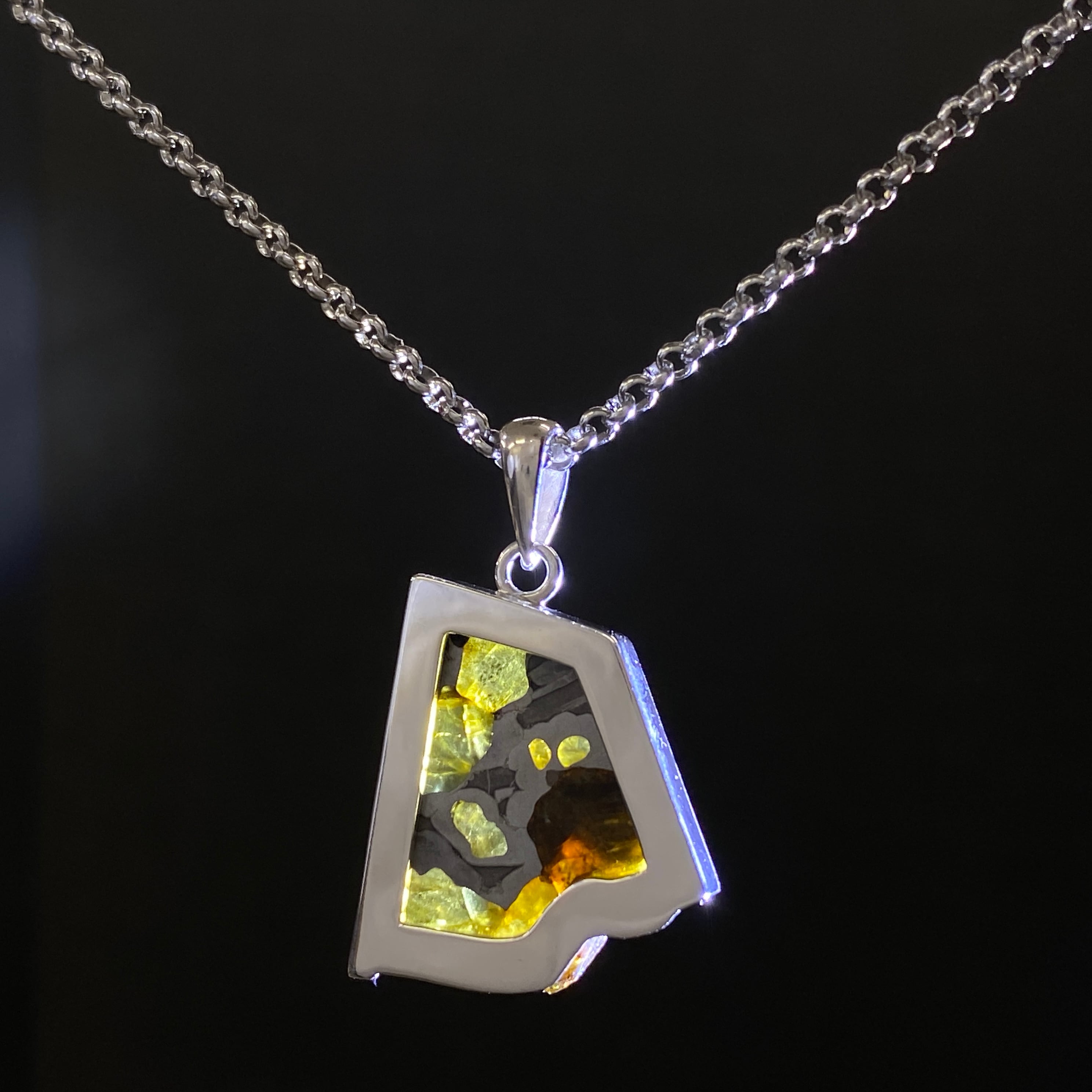 1822年にチリで発見された隕石です。パラサイト隕石自体の回収量は全体の約1%で希少なのですが、イミラックはその中でも希少かつ人気の隕石です。そのカンラン石は大きく、透明度が高いです。イエローグリーンに輝くその様は、宇宙の宝石と呼ばれるほどです。サビにくさも人気の1つです。美しいそのフォルムを美しいまま、いつまでの楽しめる隕石です。
