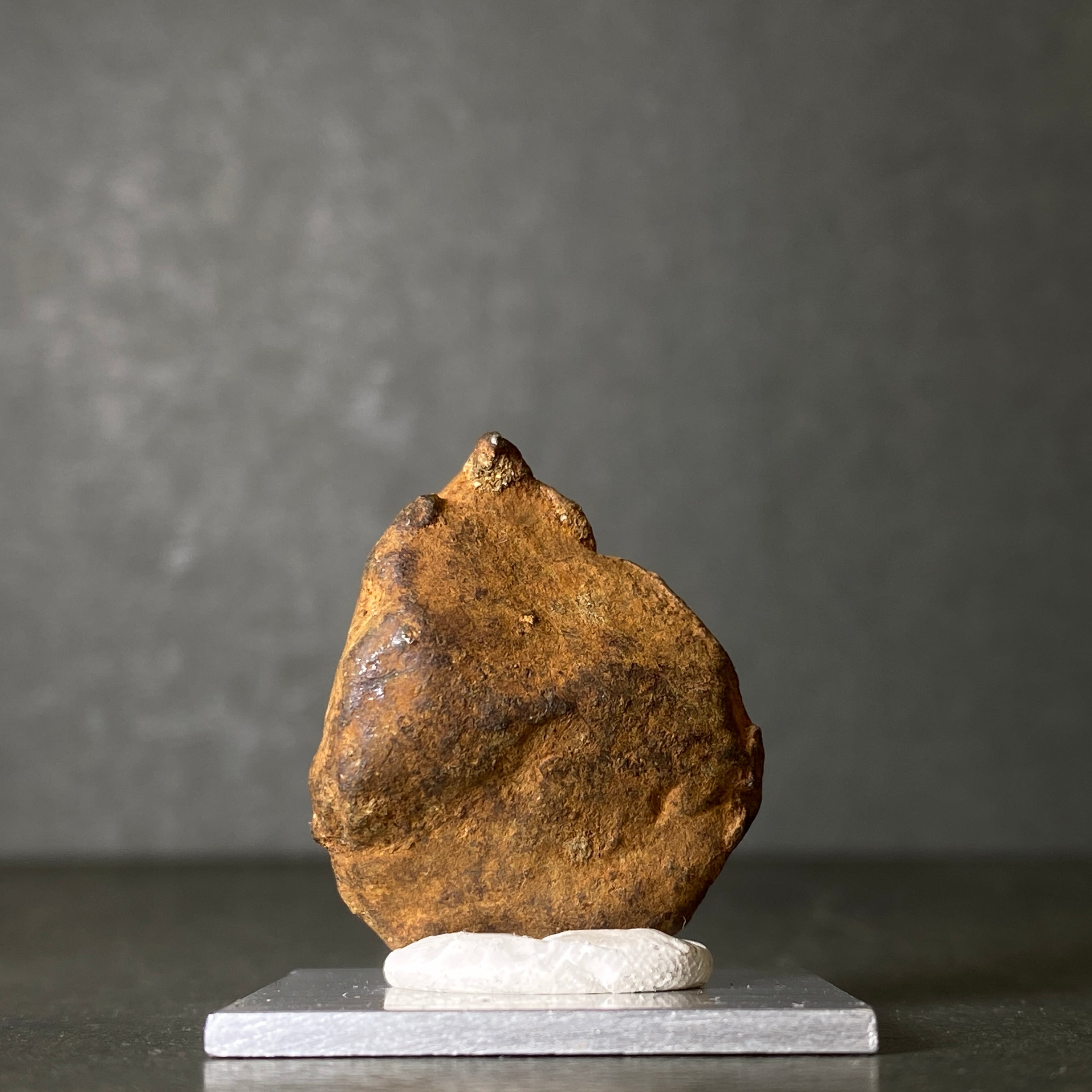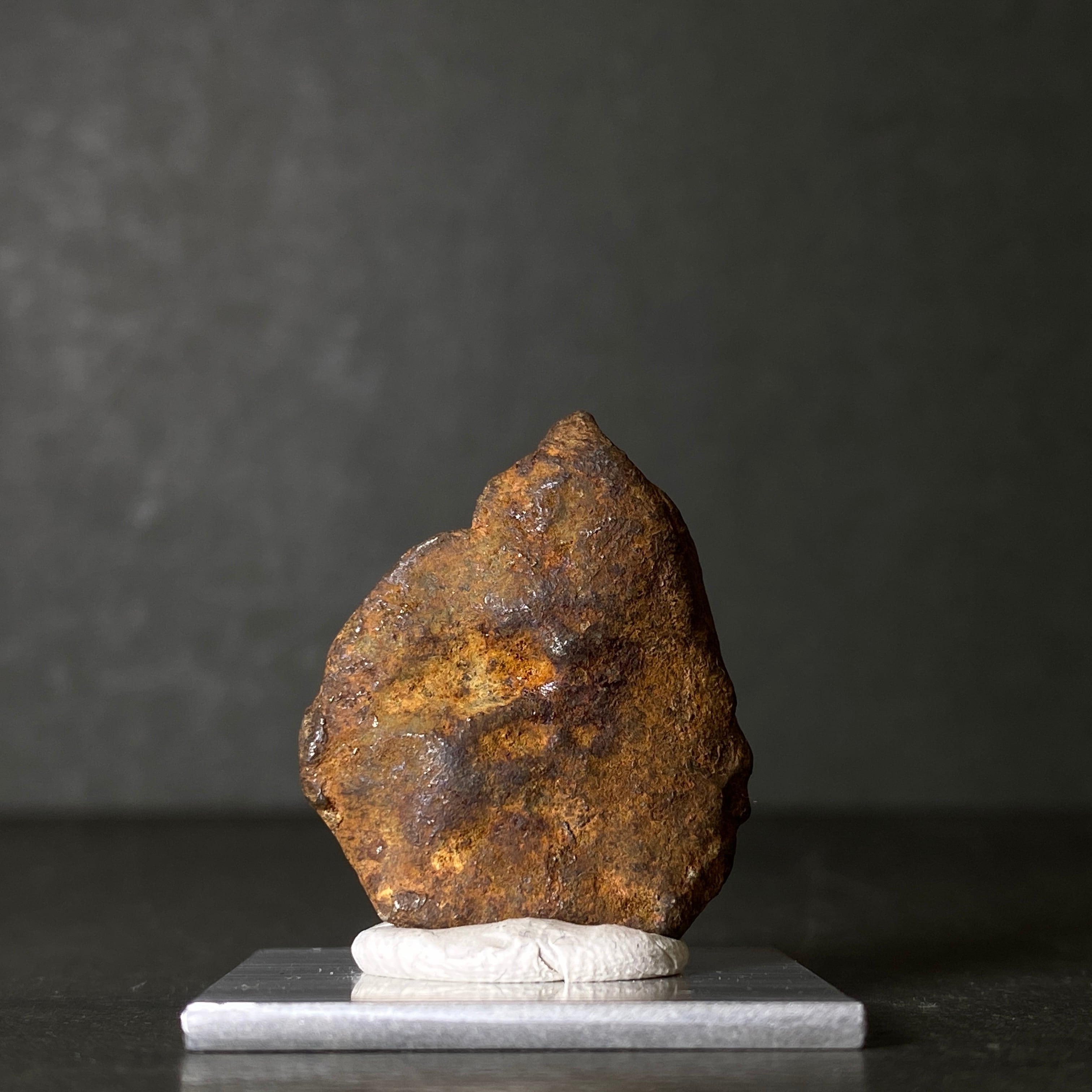 2009年にエジプトで発見された隕石です。当時、ミラノ自然史博物館の元学芸員であるイタリアの科学者ヴィンチェンツォデミケーレがその隕石クレーターを発見しました。彼らによって合計800キロの隕石が回収され、その多くはカイロのエジプト地質学博物館に展示されているようです。50世紀もののあいだ砂漠の奥深くにいたためか、他の隕石と比べてサビにくいです。ゲベルカミル隕石はアタキサイトに分類され、酸処理してもウィドマンシュテッテン構造が出ない隕石です。一般的にスライス品は鏡面加工されており、原石よりも高価になっています。原石はどの隕石にも無い表皮をしています。それは爬虫類の表皮や亀の甲羅のような感じで、のっぺりとしているのが特徴的です。