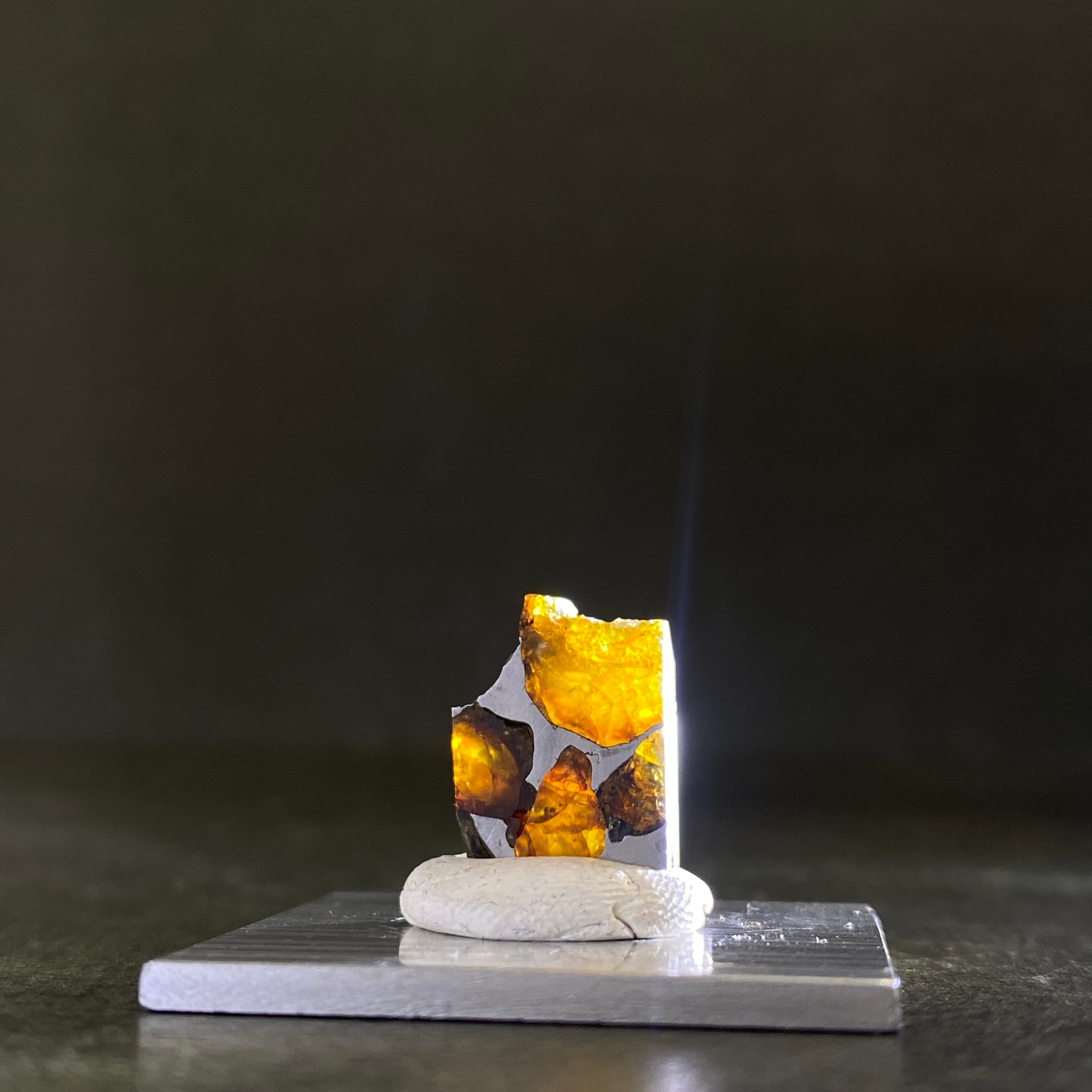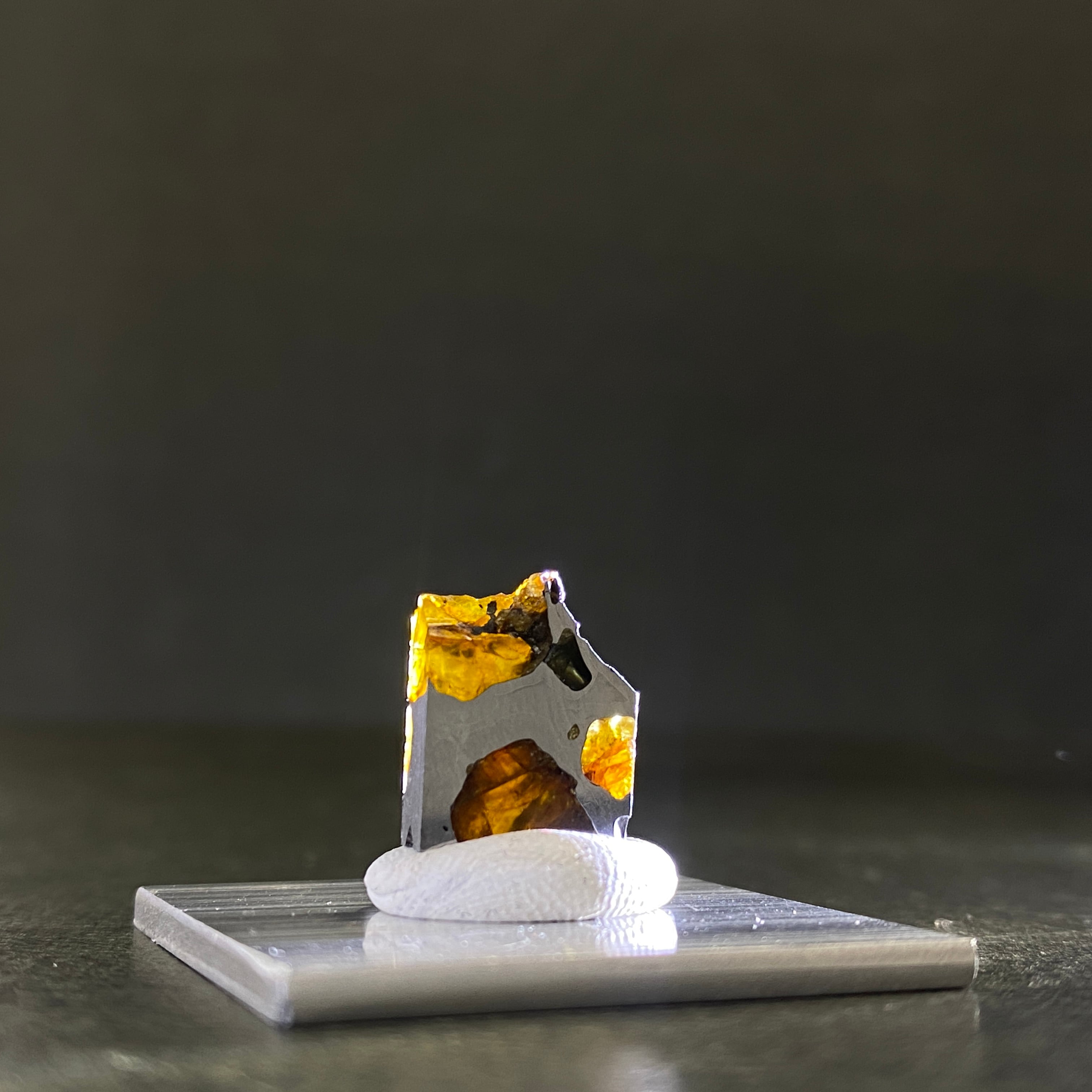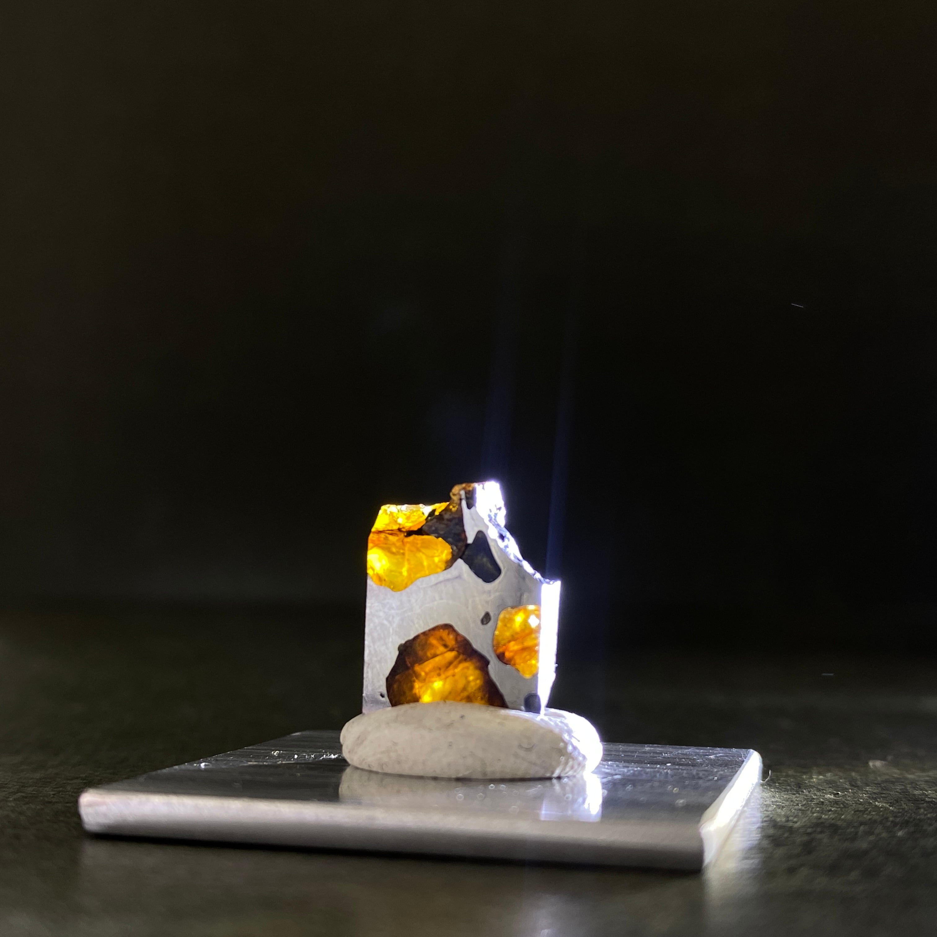 1822年にチリで発見された隕石です。パラサイト隕石自体の回収量は全体の約1%で希少なのですが、イミラックはその中でも希少かつ人気の隕石です。そのカンラン石は大きく、透明度が高いです。イエローグリーンに輝くその様は、宇宙の宝石と呼ばれるほどです。サビにくさも人気の1つです。美しいそのフォルムを美しいまま、いつまでの楽しめる隕石です。