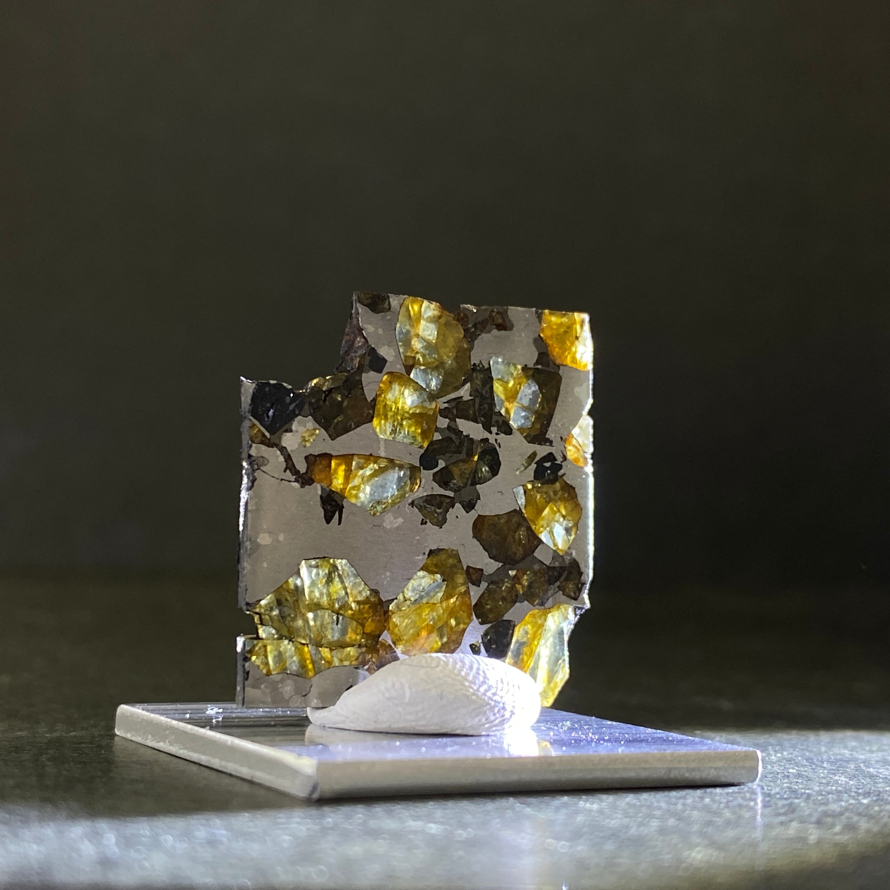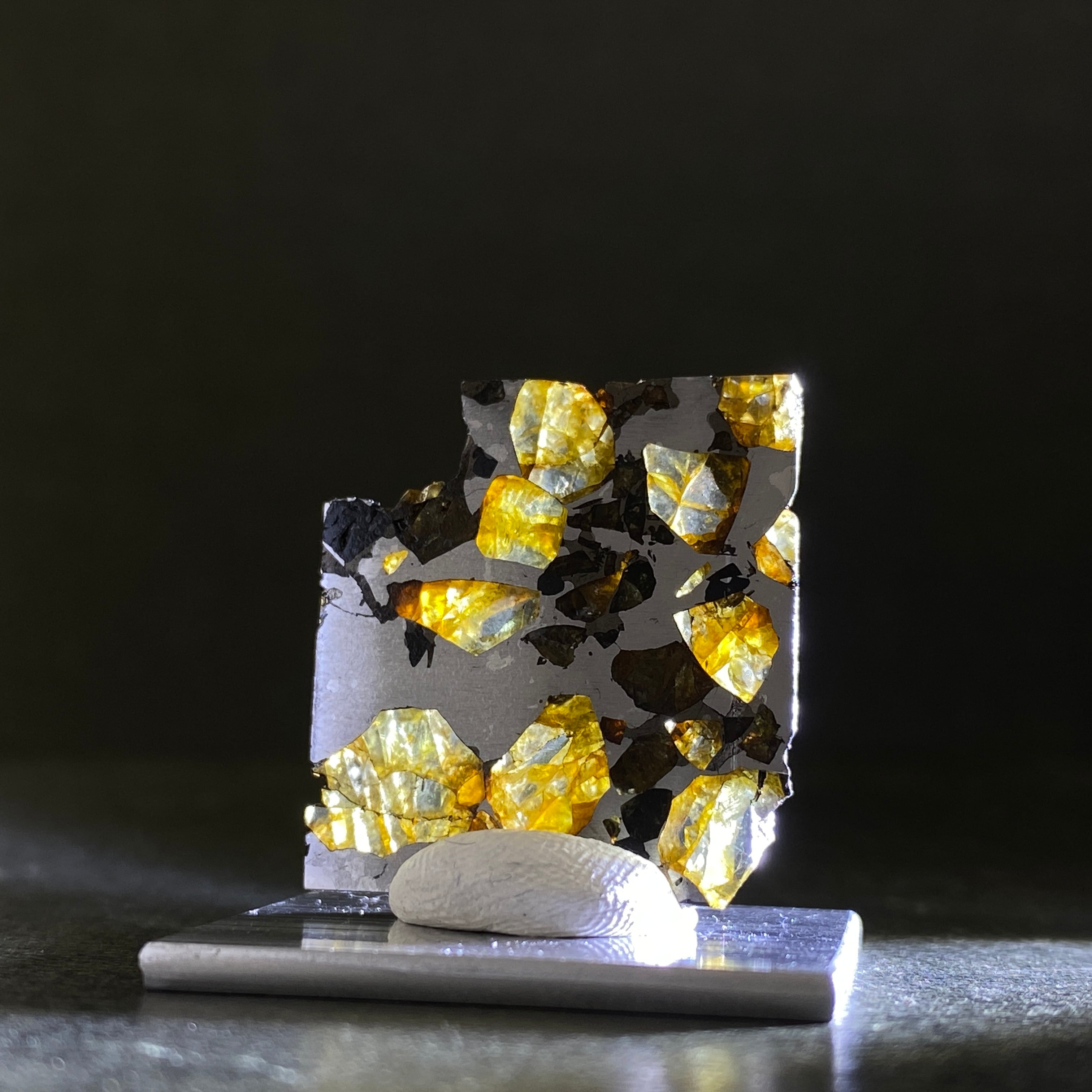 1807年にベラルーシにて2人の農民のよって発見された隕石です。諸説ありますが、分裂した小惑星のコアマントルの境界線の部分になります。この隕石は地球に落下するまでに別の隕石の衝突によって宇宙空間で粉砕されたようです。カンラン石の透明度はパラサイト隕石の中でも透明度が高く、パラサイトペリドットとして宝石などに使われています。