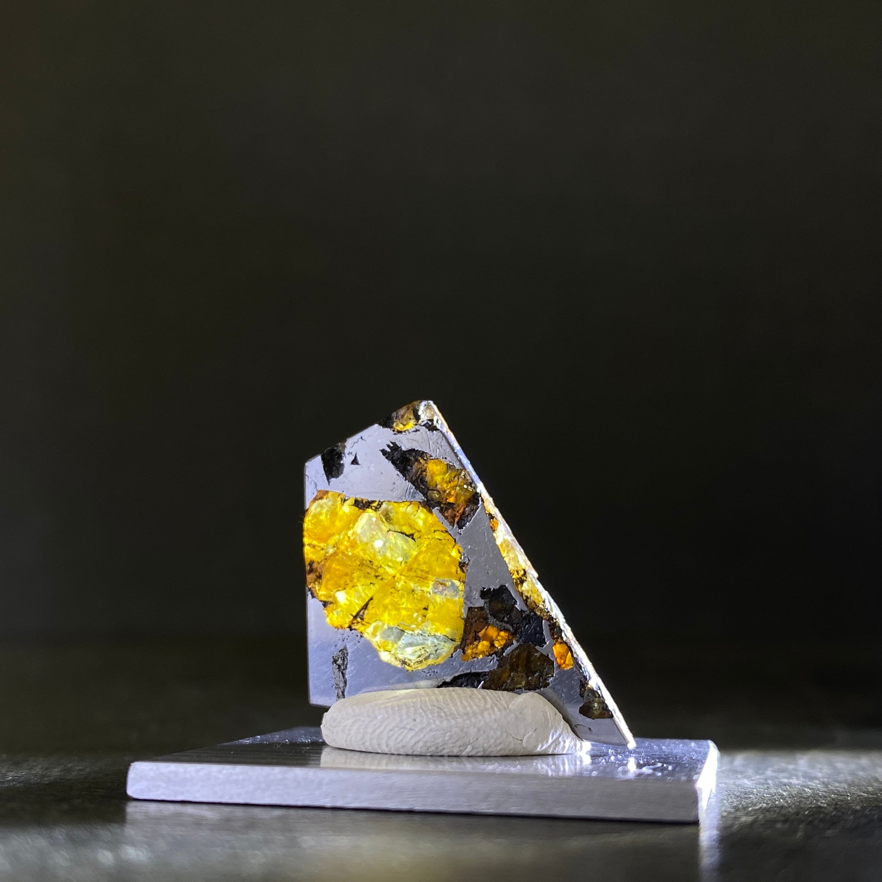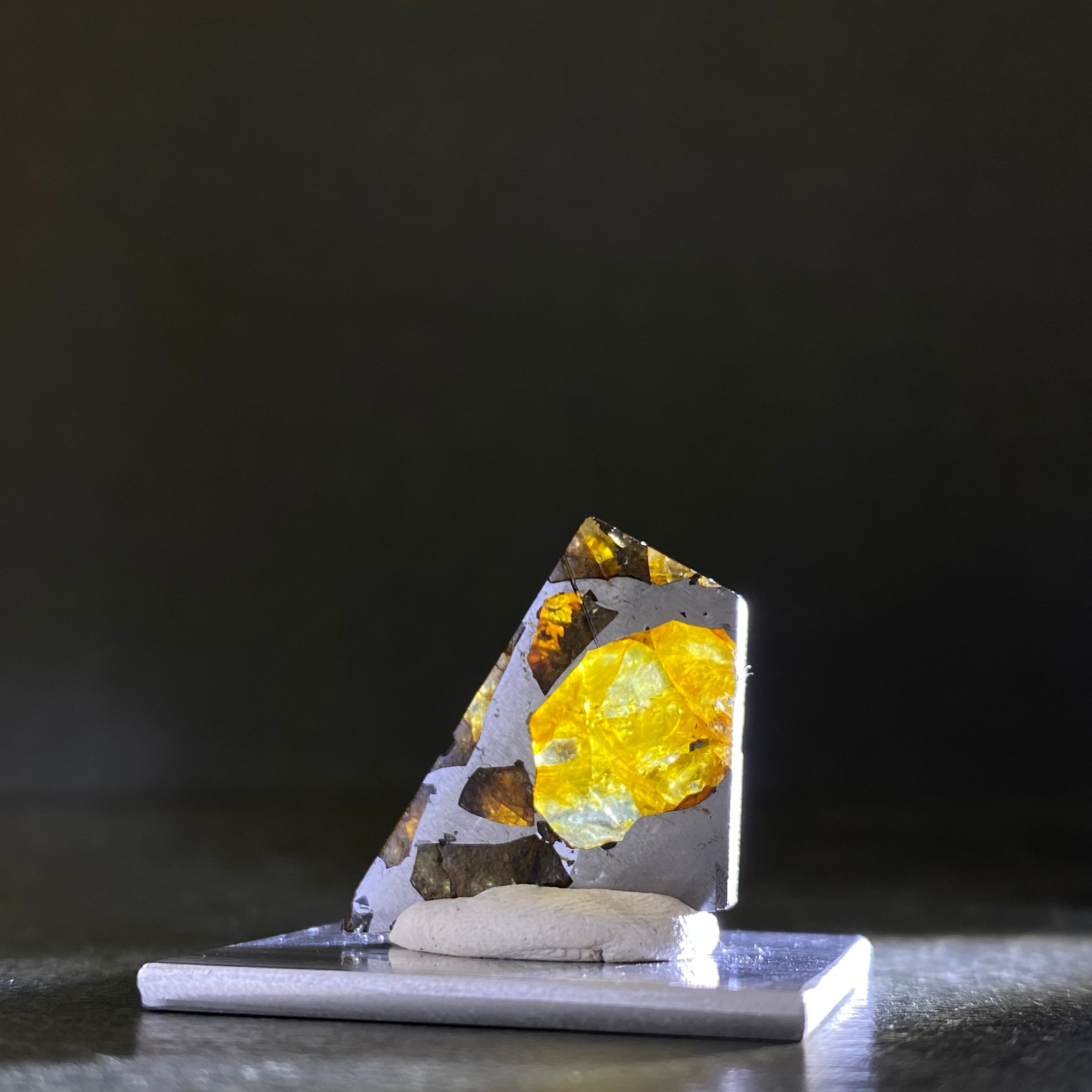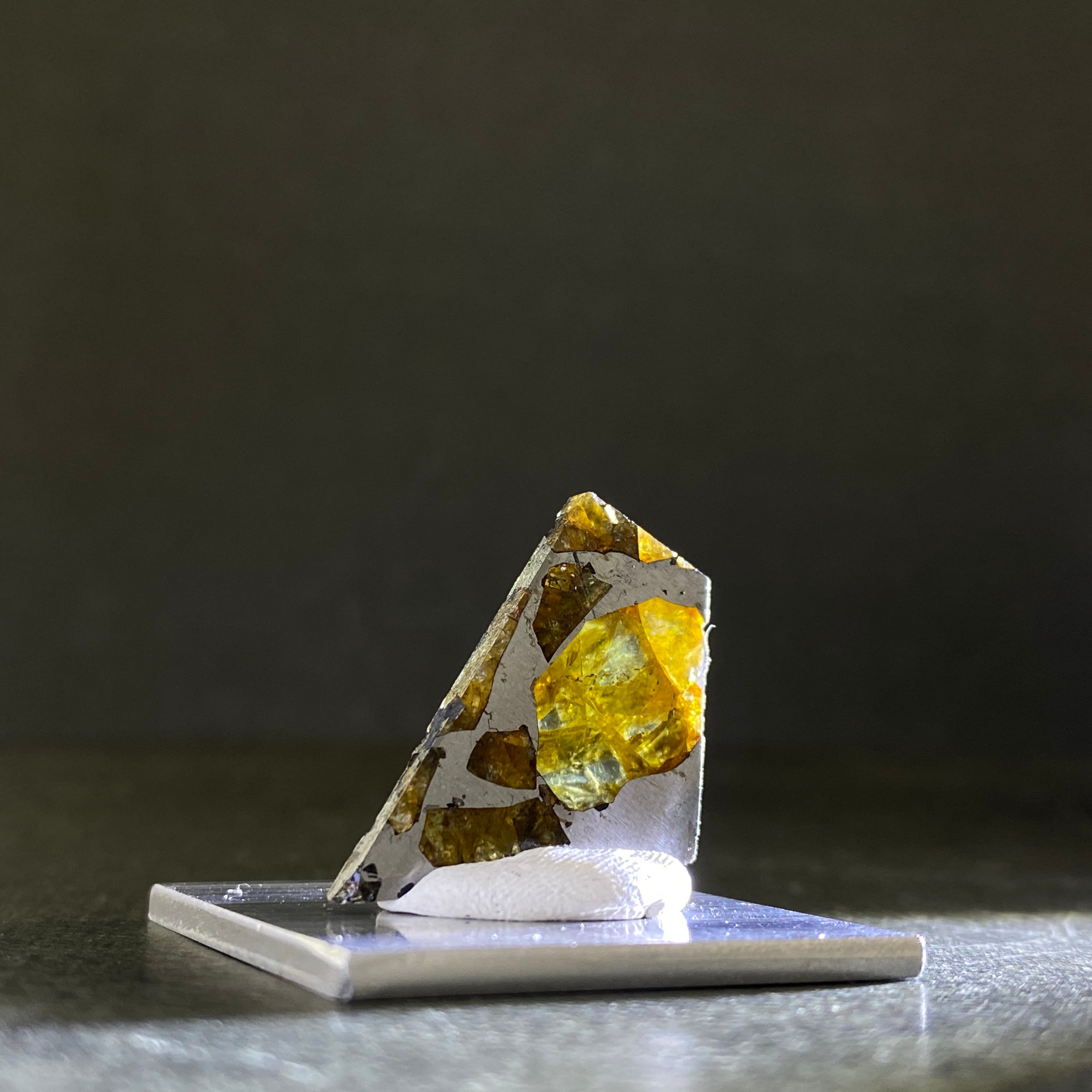 1807年にベラルーシにて2人の農民のよって発見された隕石です。諸説ありますが、分裂した小惑星のコアマントルの境界線の部分になります。この隕石は地球に落下するまでに別の隕石の衝突によって宇宙空間で粉砕されたようです。カンラン石の透明度はパラサイト隕石の中でも透明度が高く、パラサイトペリドットとして宝石などに使われています。
