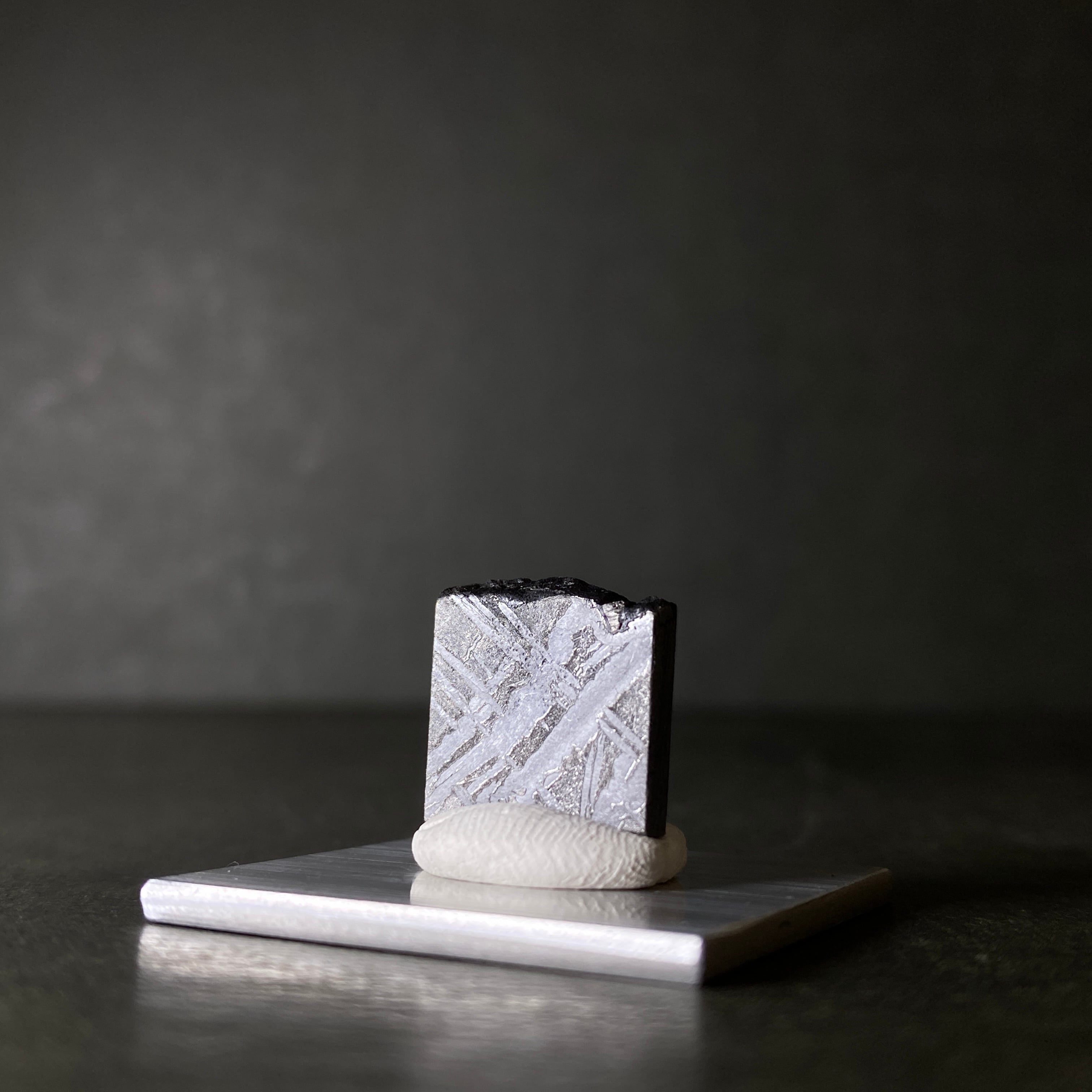 1968年にフランスで発見された隕石です。珍しいヨーロッパの鉄隕石で、シャンパンやワインに使われるぶどう畑で回収されました。サントーバン隕石の特徴はなんといっても特別な切断面です。独特なウィドマンシュテッテン構造にトロイライトの小結晶、そして異常なまでに大きいシュライバーサイトが見られます。局所的にサビが出るのも特徴的で、ウィドマンシュテッテン構造に沿って四角く出るのはこの隕石だけです。側面に多いトロイライトも同様に四角くなっています。どんな隕石とも似つかない特別な隕石であることは間違いありません。