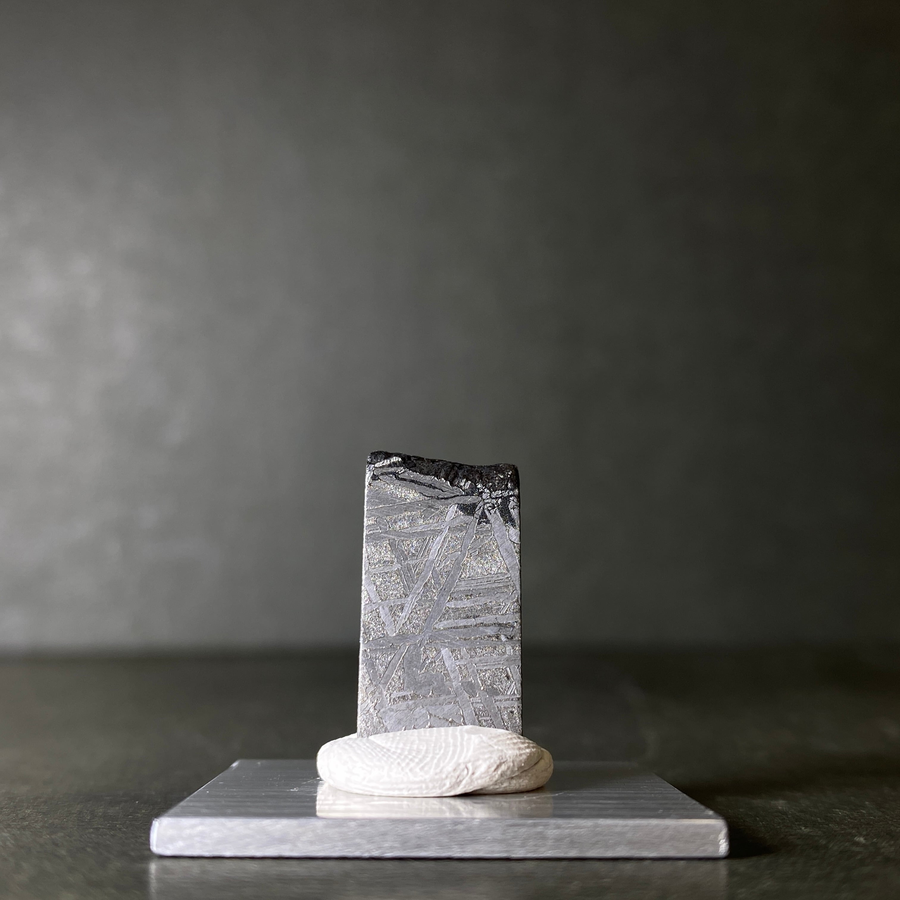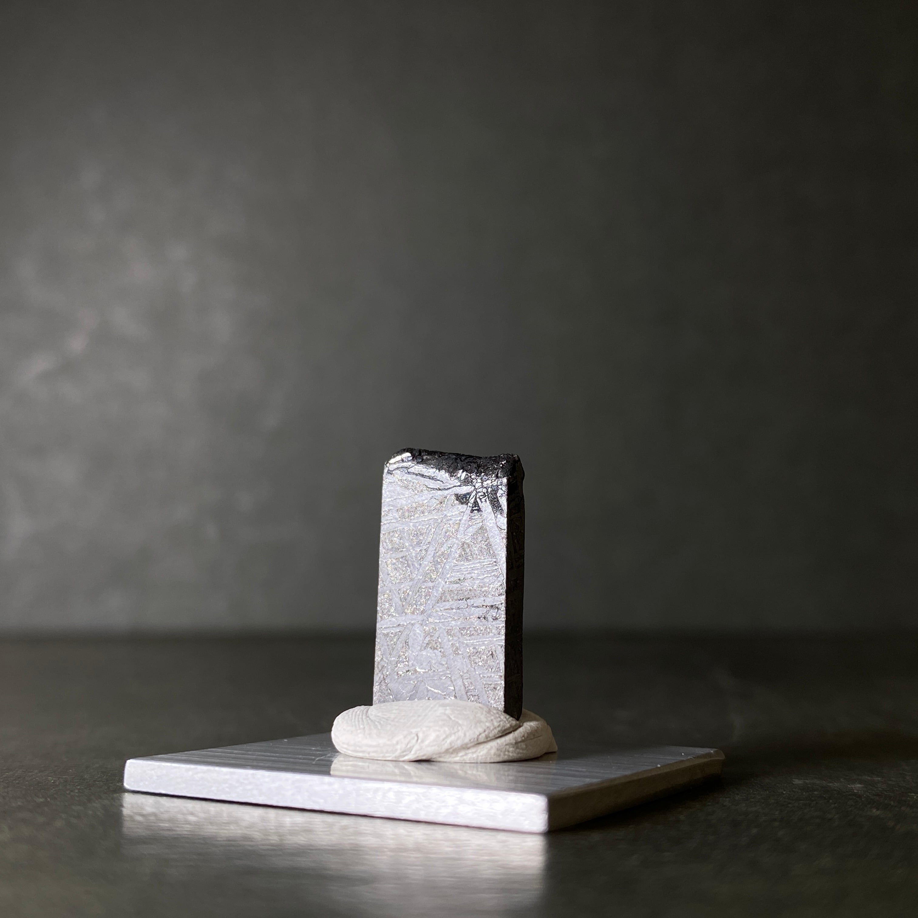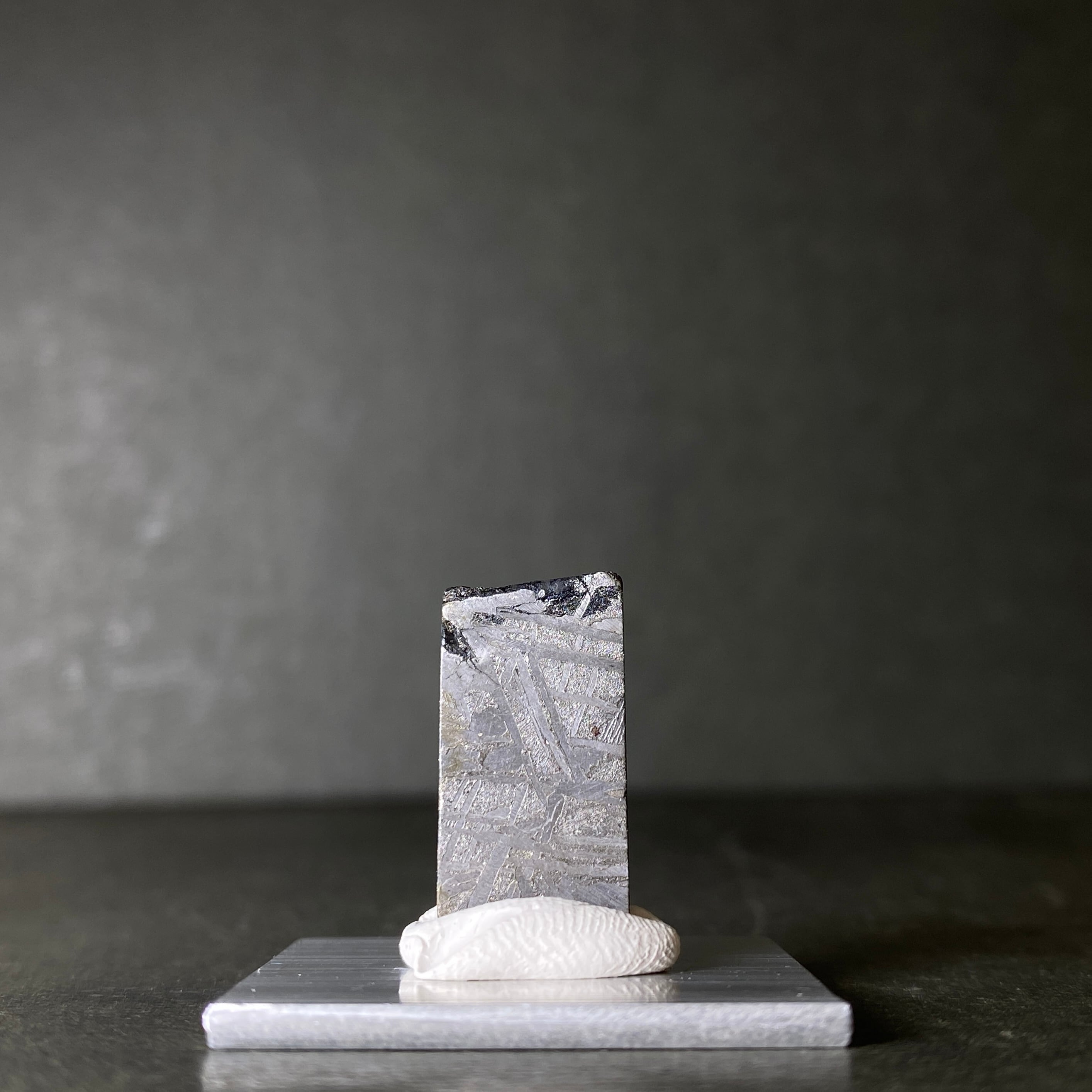 1968年にフランスで発見された隕石です。珍しいヨーロッパの鉄隕石で、シャンパンやワインに使われるぶどう畑で回収されました。サントーバン隕石の特徴はなんといっても特別な切断面です。独特なウィドマンシュテッテン構造にトロイライトの小結晶、そして異常なまでに大きいシュライバーサイトが見られます。局所的にサビが出るのも特徴的で、ウィドマンシュテッテン構造に沿って四角く出るのはこの隕石だけです。側面に多いトロイライトも同様に四角くなっています。どんな隕石とも似つかない特別な隕石であることは間違いありません。