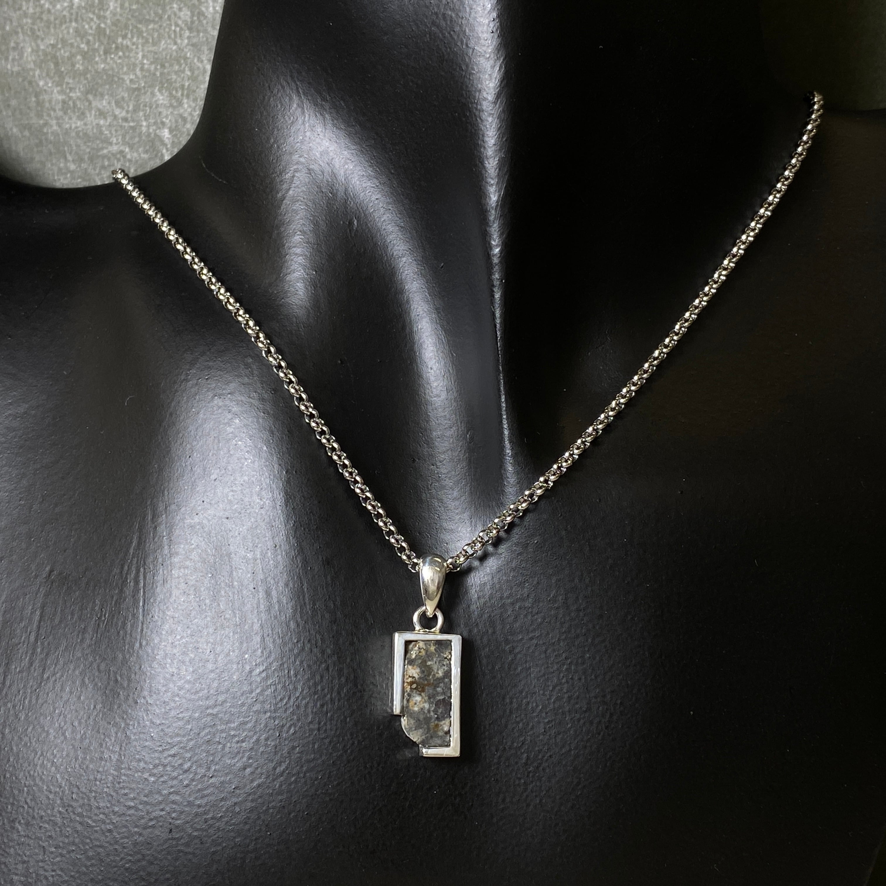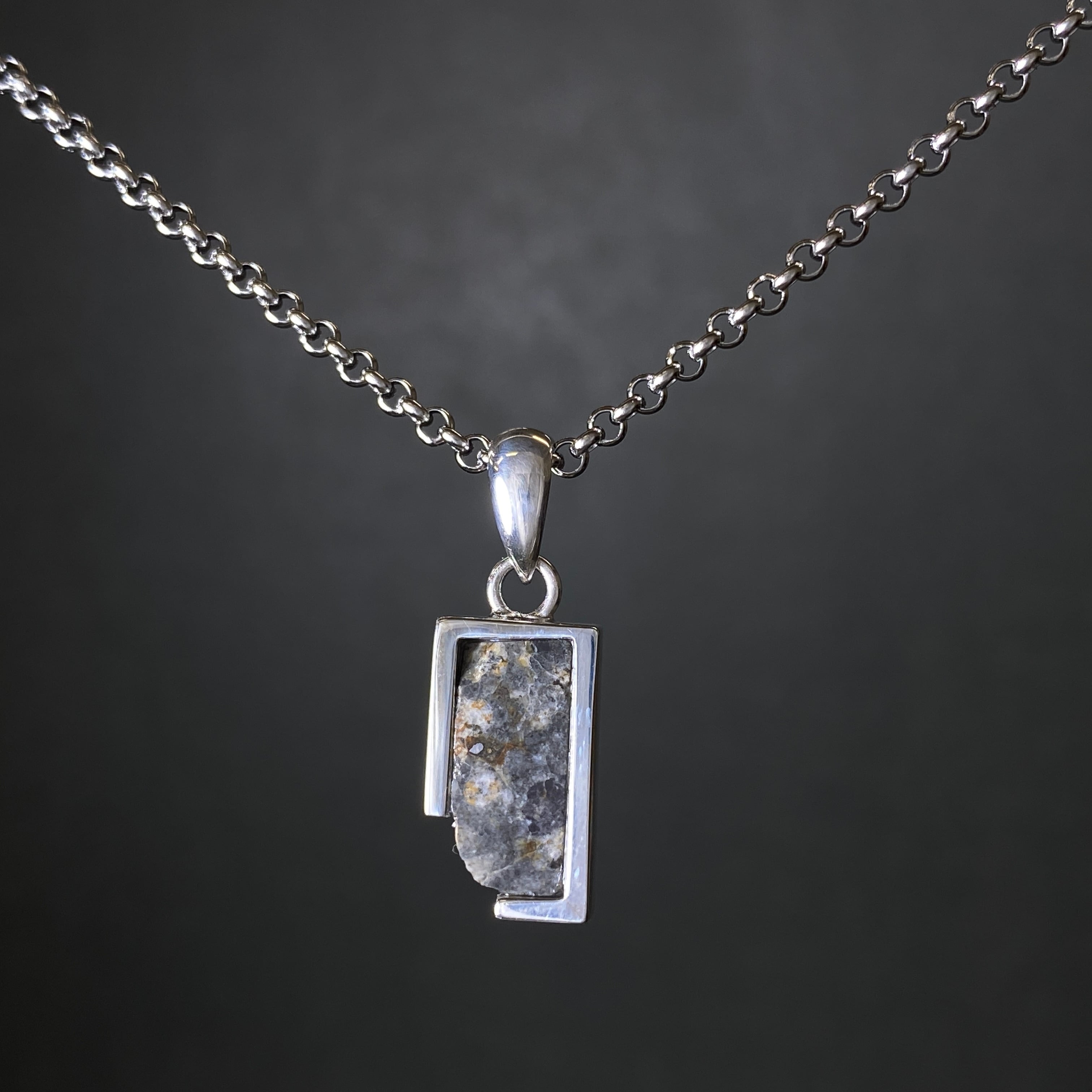 2022年の春にアルジェリアで回収された月の隕石です。惑星などが月に衝突した勢いで欠けた月の一部が宇宙を浮遊します。その欠片は軌道を描き、地球に衝突するまで何百万年も宇宙を浮遊します。なぜ月の隕石という事が分かるのかというと、アポロ計画が関係しています。アポロ計画で月の岩石が地球に持ち運ばれ、その組織構造などをデータ化しました。それにより科学的に月の隕石であると証明することができます。唯一肉眼で見られる隕石なので、世界的に人気のある隕石です。
